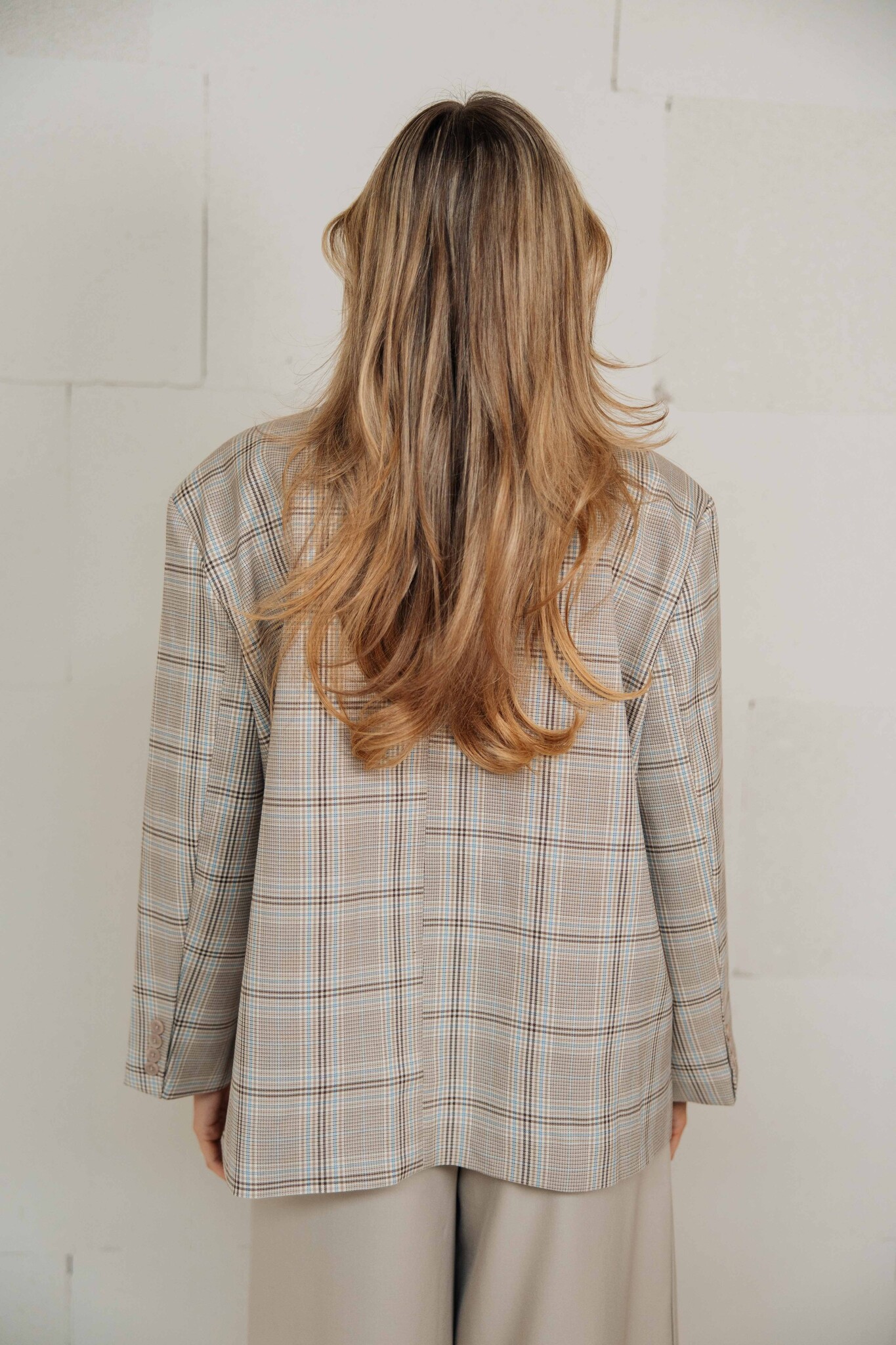 Deze blazer heeft een boxy model met een trendy beige ruitpatroon en een knoopsluiting aan de voorkant. Het subtiele blauwe streepje door het ruitpatroon geeft de blazer een speels accent. Het splitje aan de zijkant geeft een extra touch.