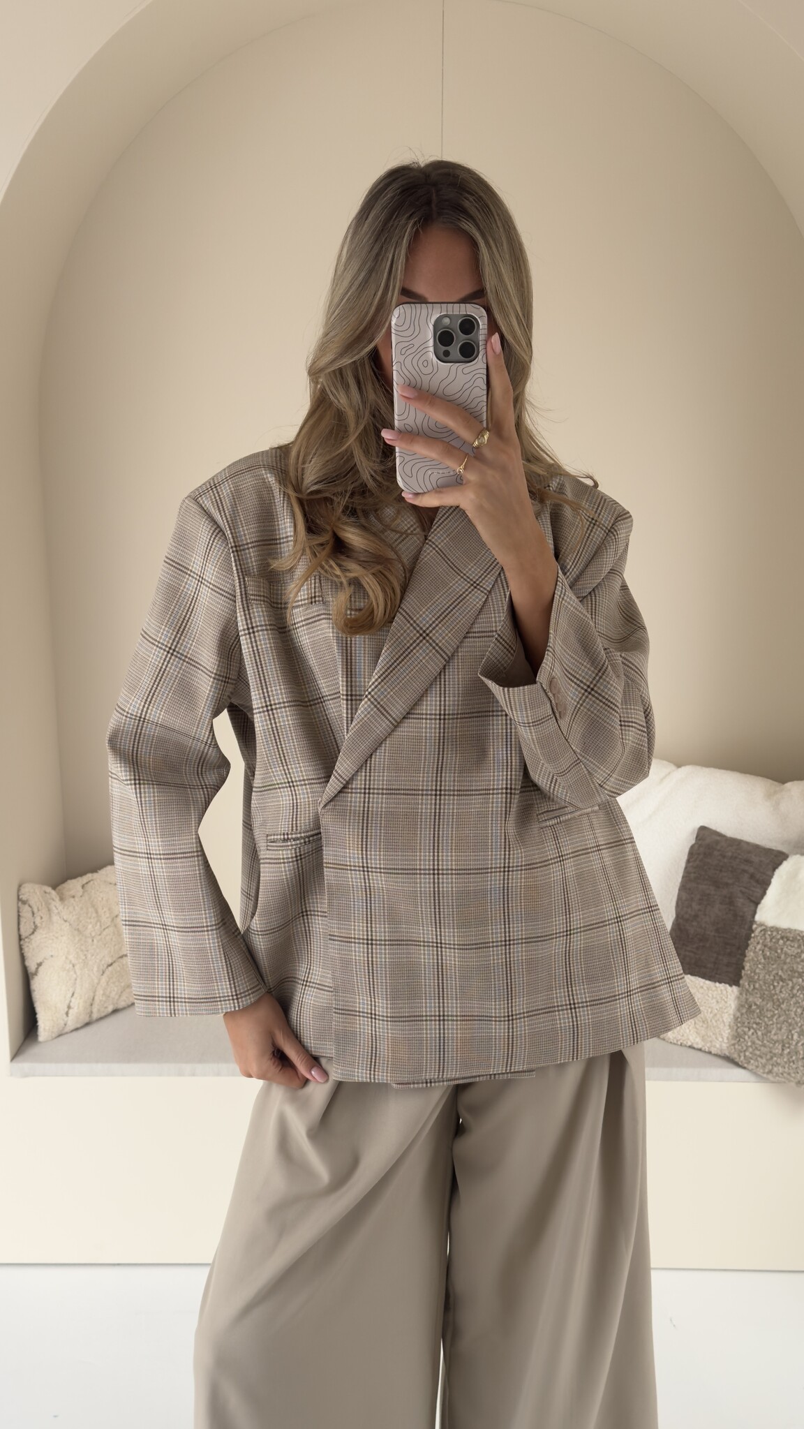 Deze blazer heeft een boxy model met een trendy beige ruitpatroon en een knoopsluiting aan de voorkant. Het splitje aan de zijkant geeft een extra touch. Leuk om de blazer zowel open als dicht te dragen!