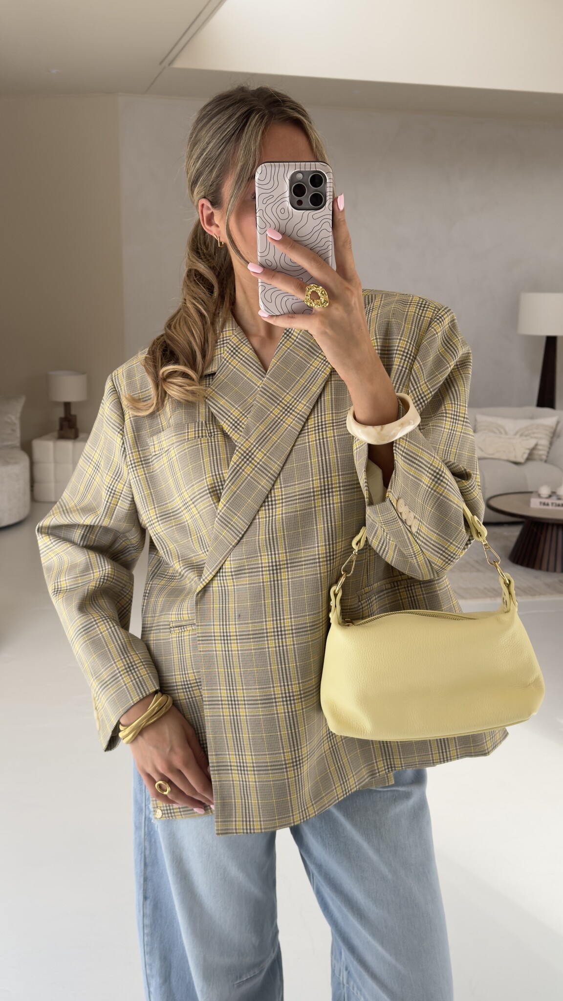 Deze blazer heeft een boxy model met een trendy beige ruitpatroon en een knoopsluiting aan de voorkant. Het splitje aan de zijkant geeft een extra touch. Leuk om de blazer zowel open als dicht te dragen!