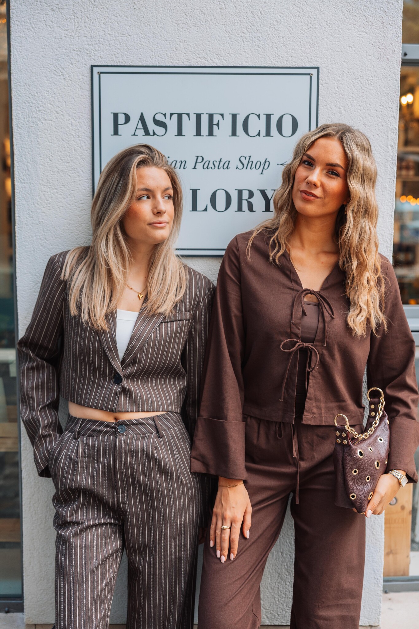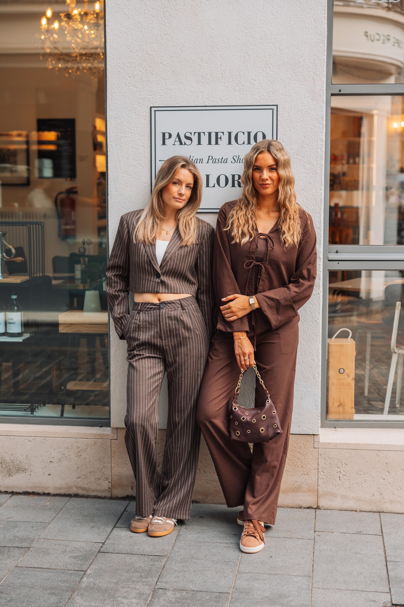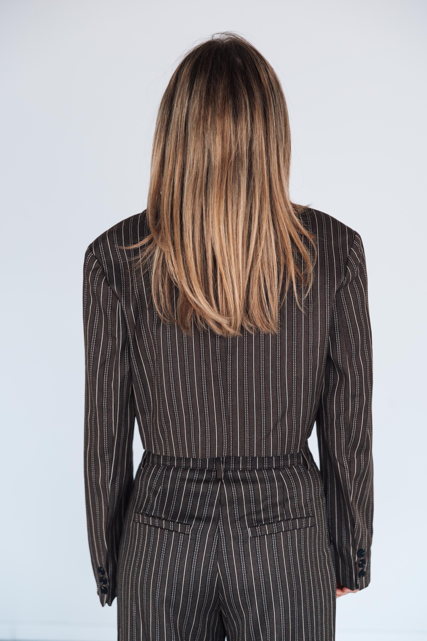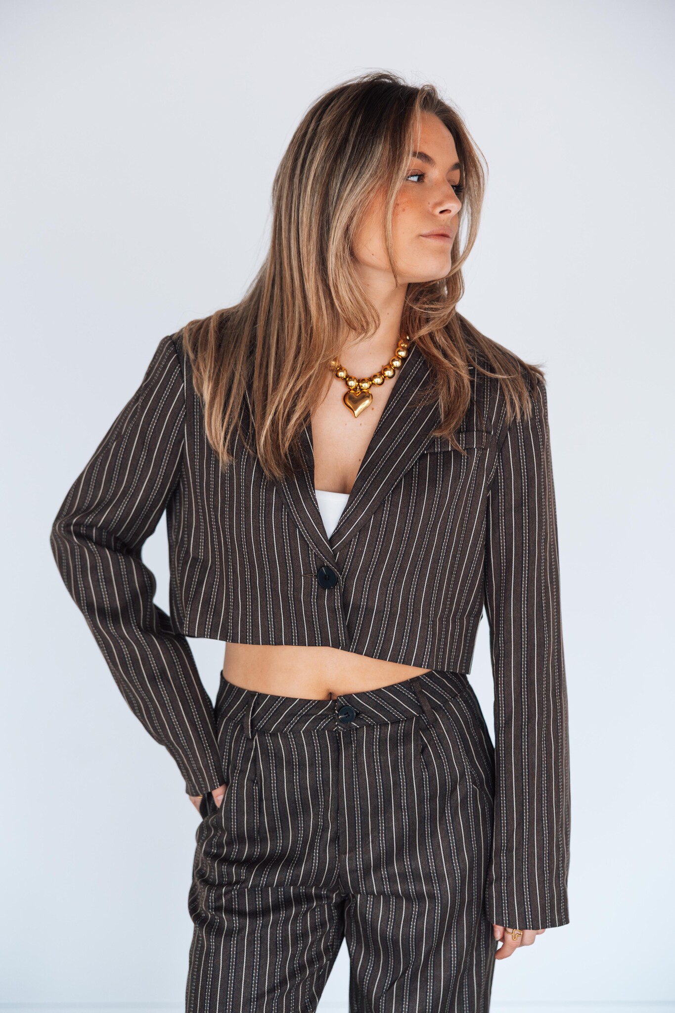 Deze cropped blazer heeft een gestreept patroon, een fijn kraagje met V-hals, knoopsluiting en een nepzak op de borst. Combineer het met de bijpassende pantalon of met een jeans voor een casual look!