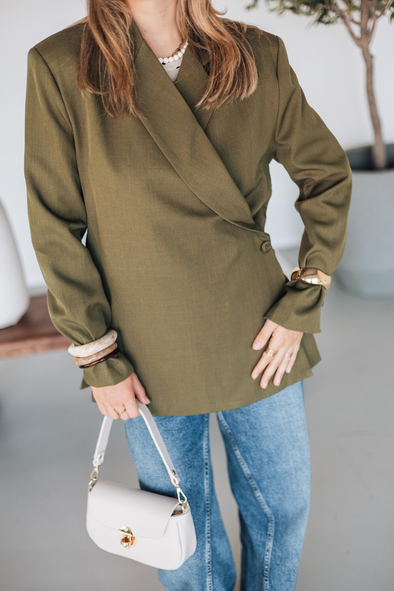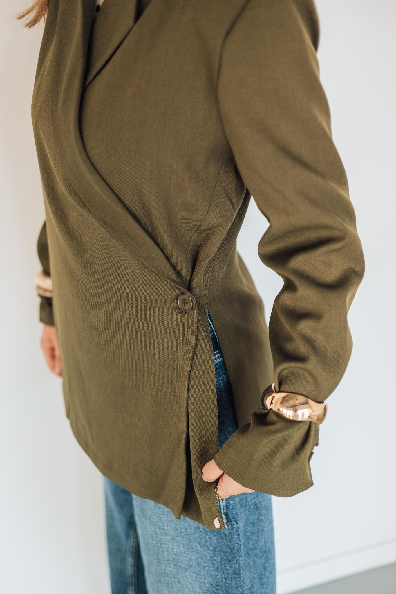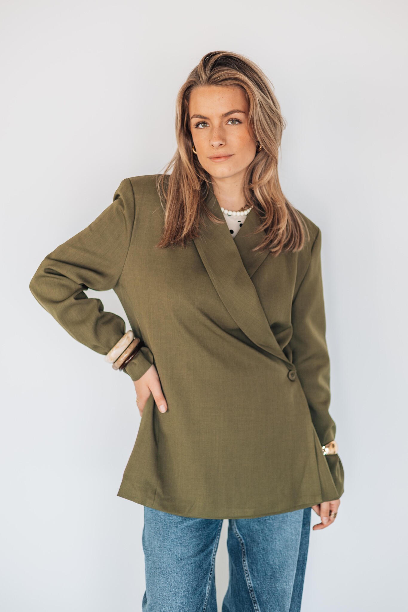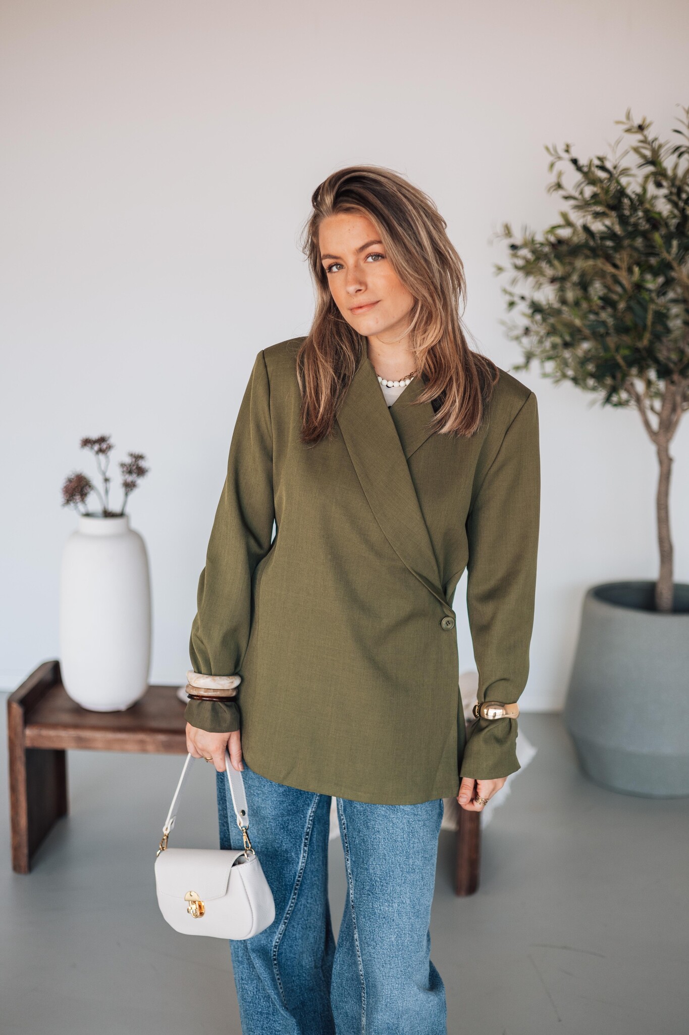 Deze blazer heeft een boxy model en een knoopsluiting aan de zijkant. Combineer de blazer met een jeans of met de bijpassende pantalon voor een complete look!