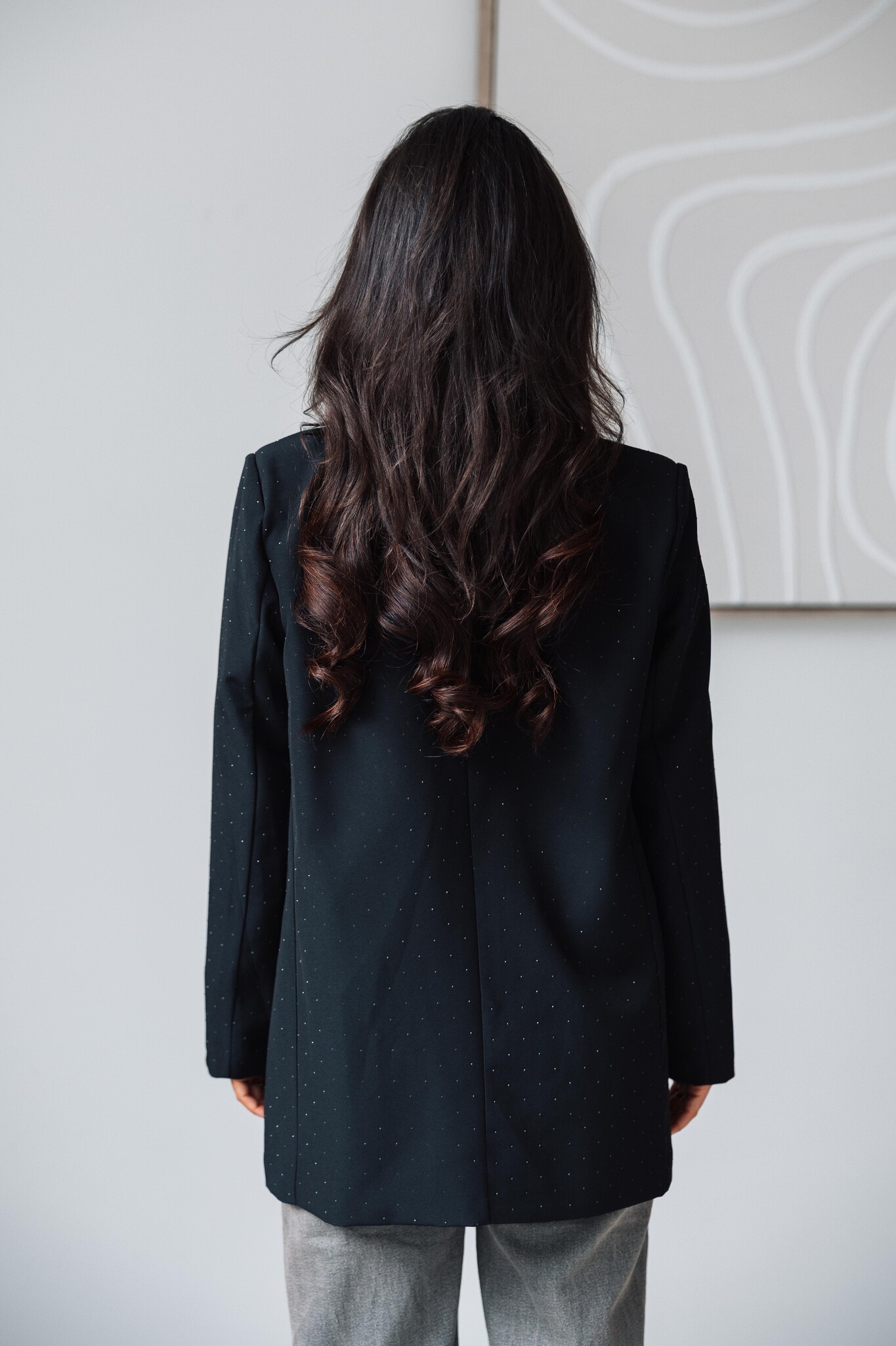 Deze zwarte blazer heeft subtiele glitterdetails en is perfect om te dragen over een top voor een chique, feestelijke look.