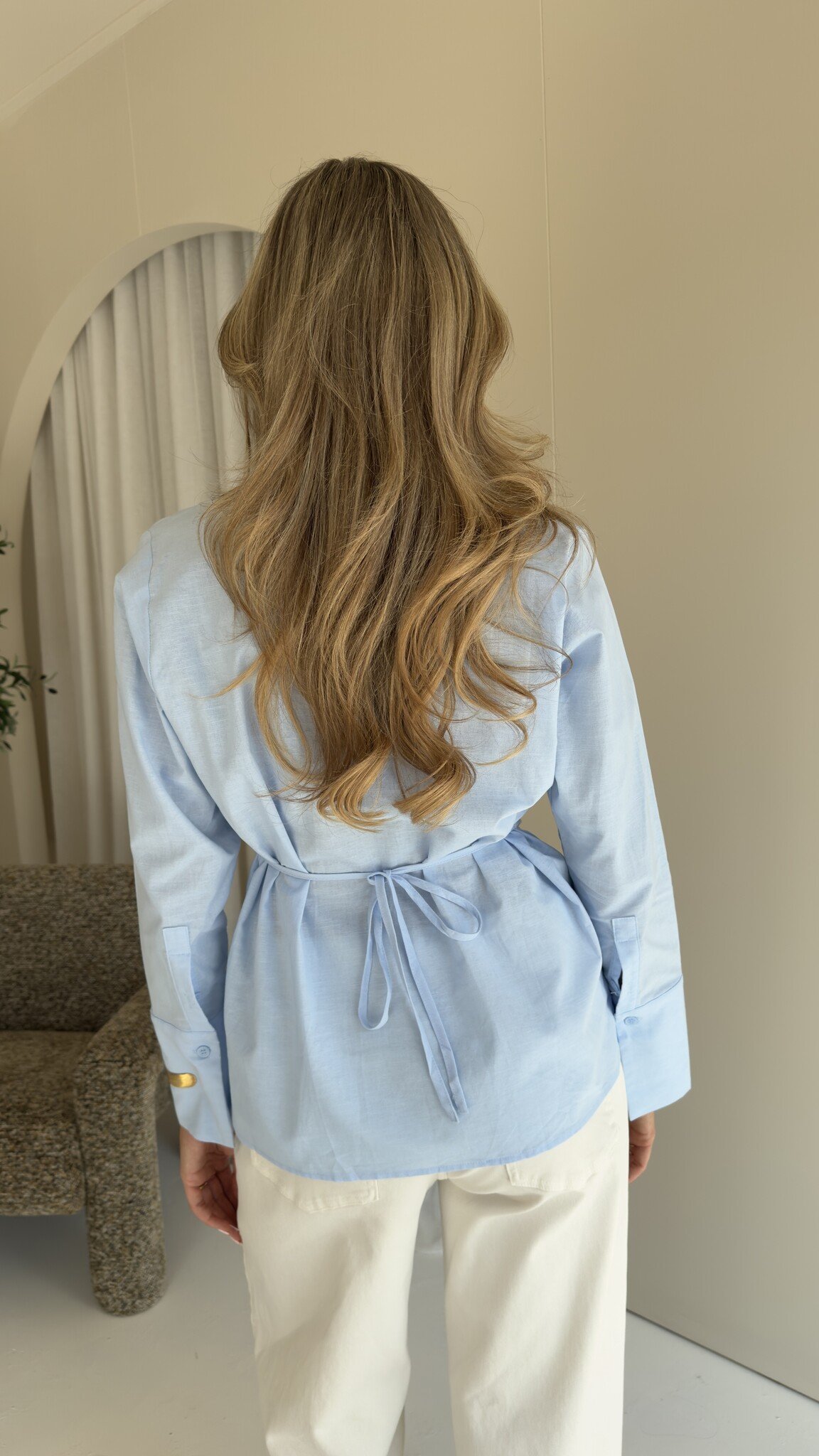Deze blouse komt in een linnen-look en heeft een mooie getailleerde fit met strikdetail aan de achterkant.