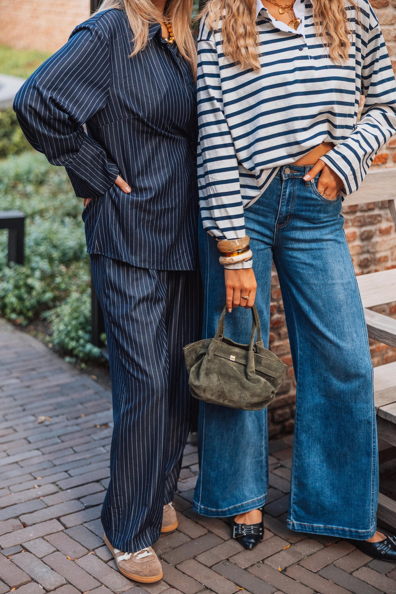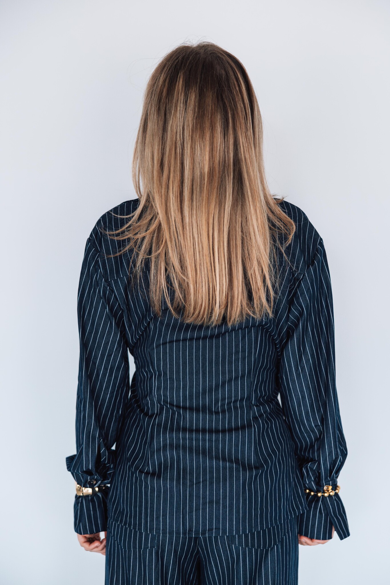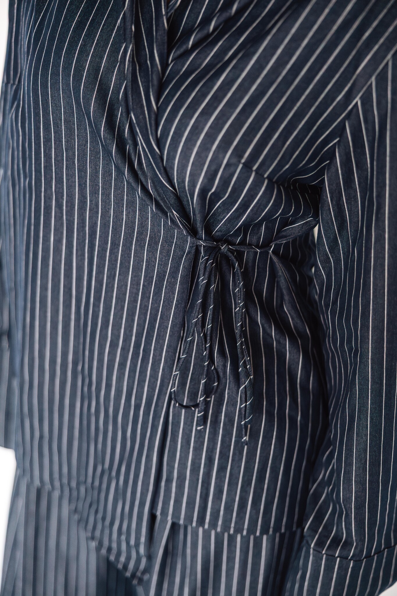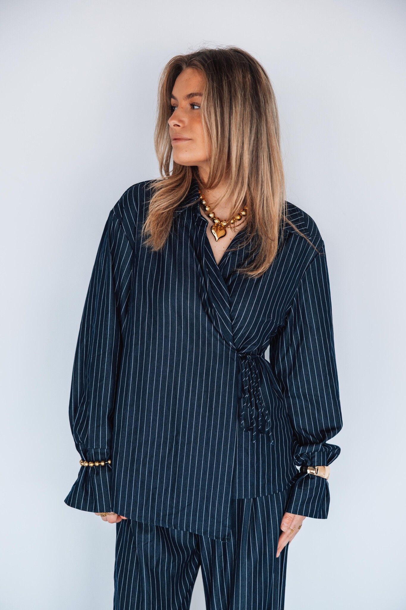 Deze blouse heeft een gestreept patroon, lange mouwen en een V-hals met een verfijnd kraagje. Het strikdetail in het midden zorgt voor een subtiele taillering en een vrouwelijke touch. Combineer het met de bijpassende pantalon voor een complete co-ord look!