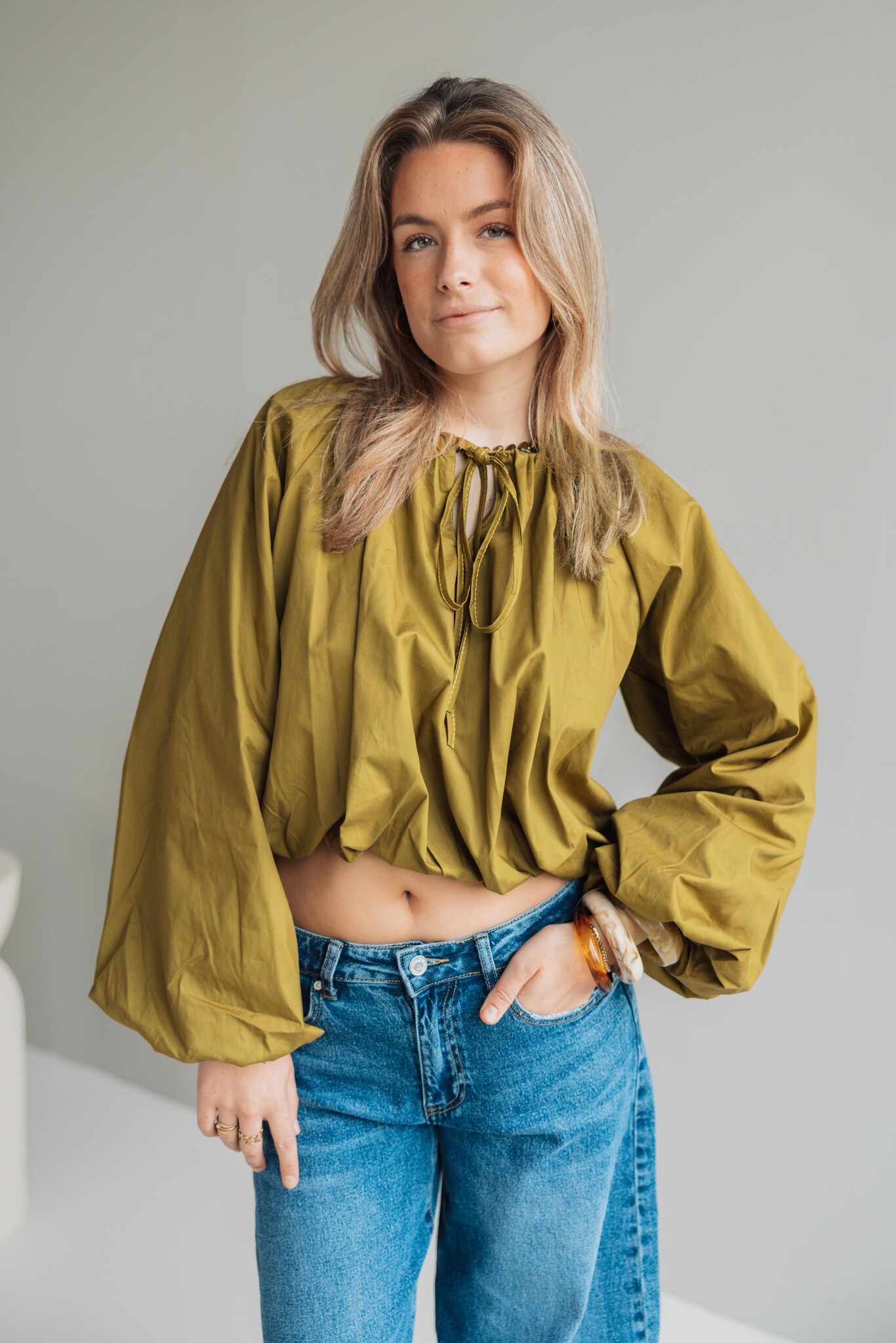 Deze blouse komt in een olijf groene kleur, heeft een ballon fit en een subtiel strikje bij de kraag. Speels en stijlvol tegelijk, perfect om je look een elegante touch te geven.
