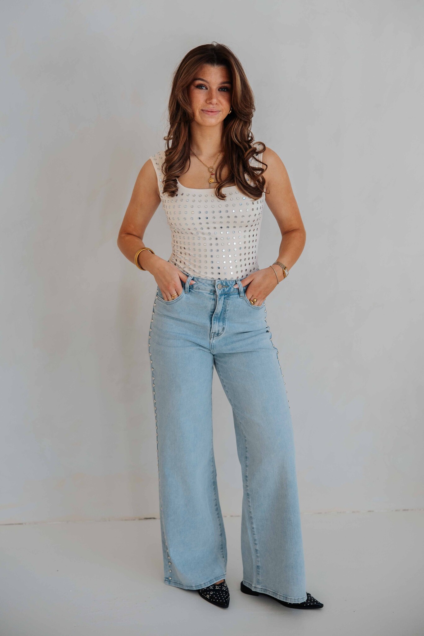 Deze body heeft een aansluitende pasvorm en is afgewerkt met stud details voor een trendy en stijlvolle look. Een echte must-have voor je garderobe en makkelijk te combineren met je favoriete jeans of broek!