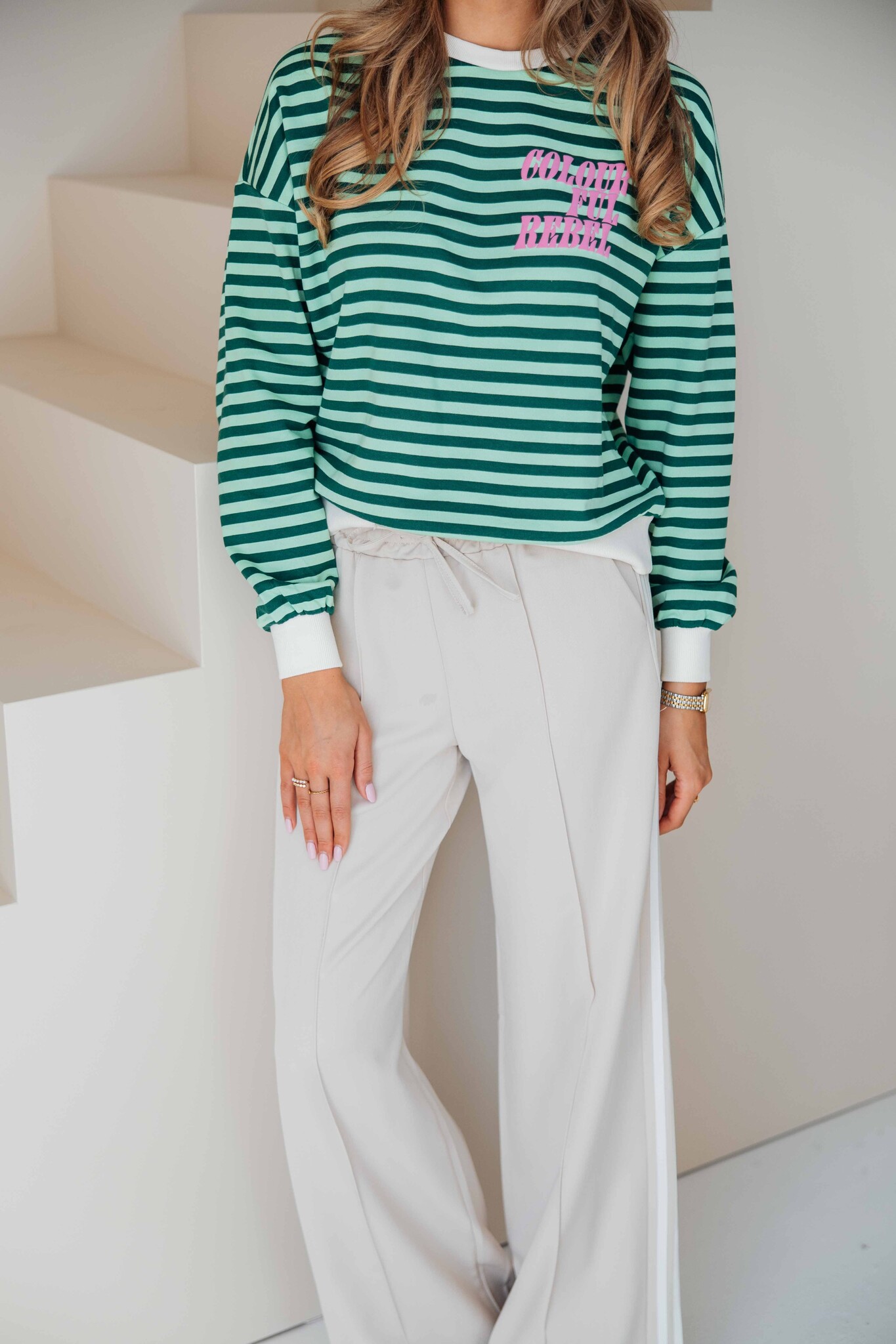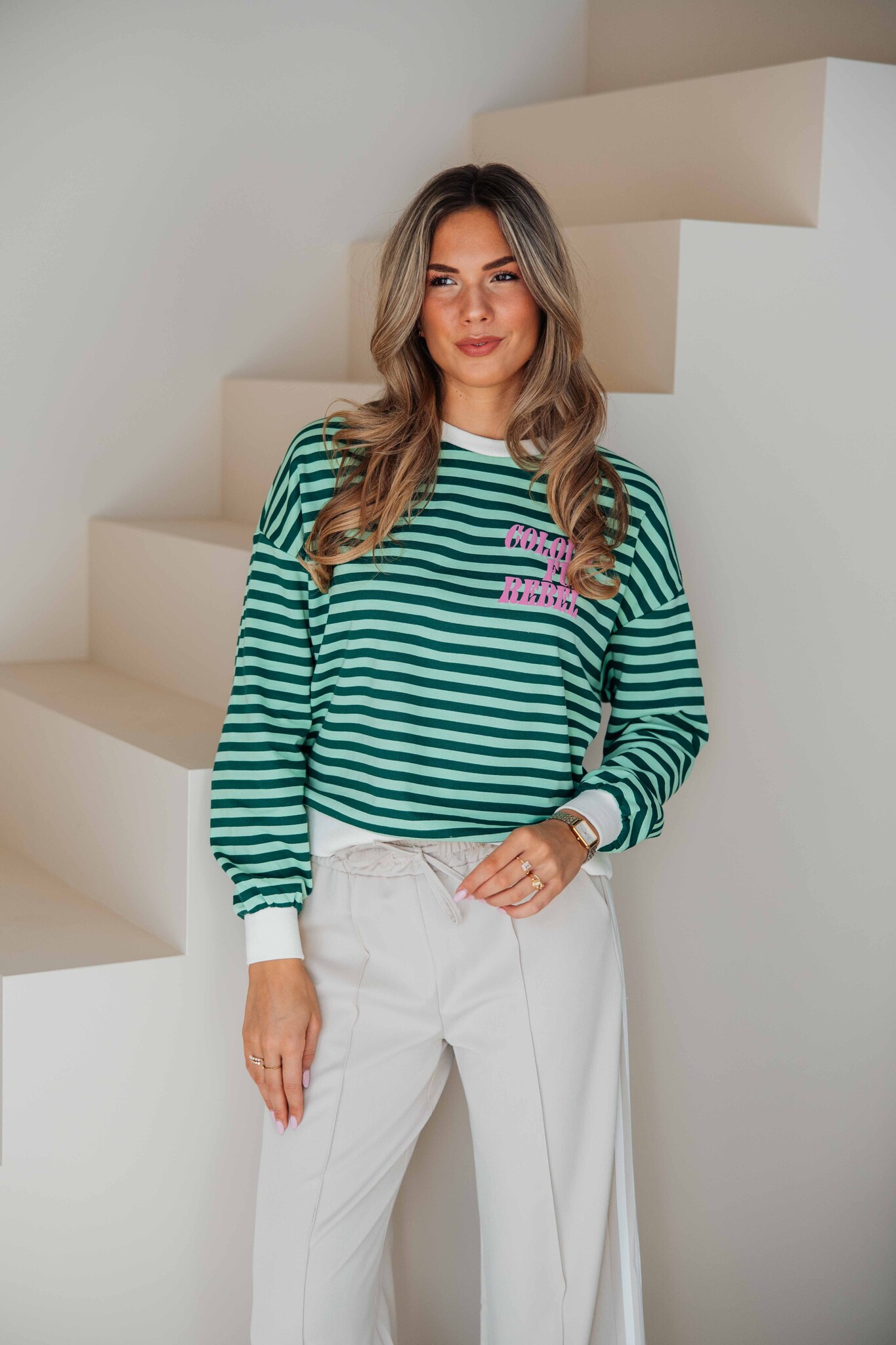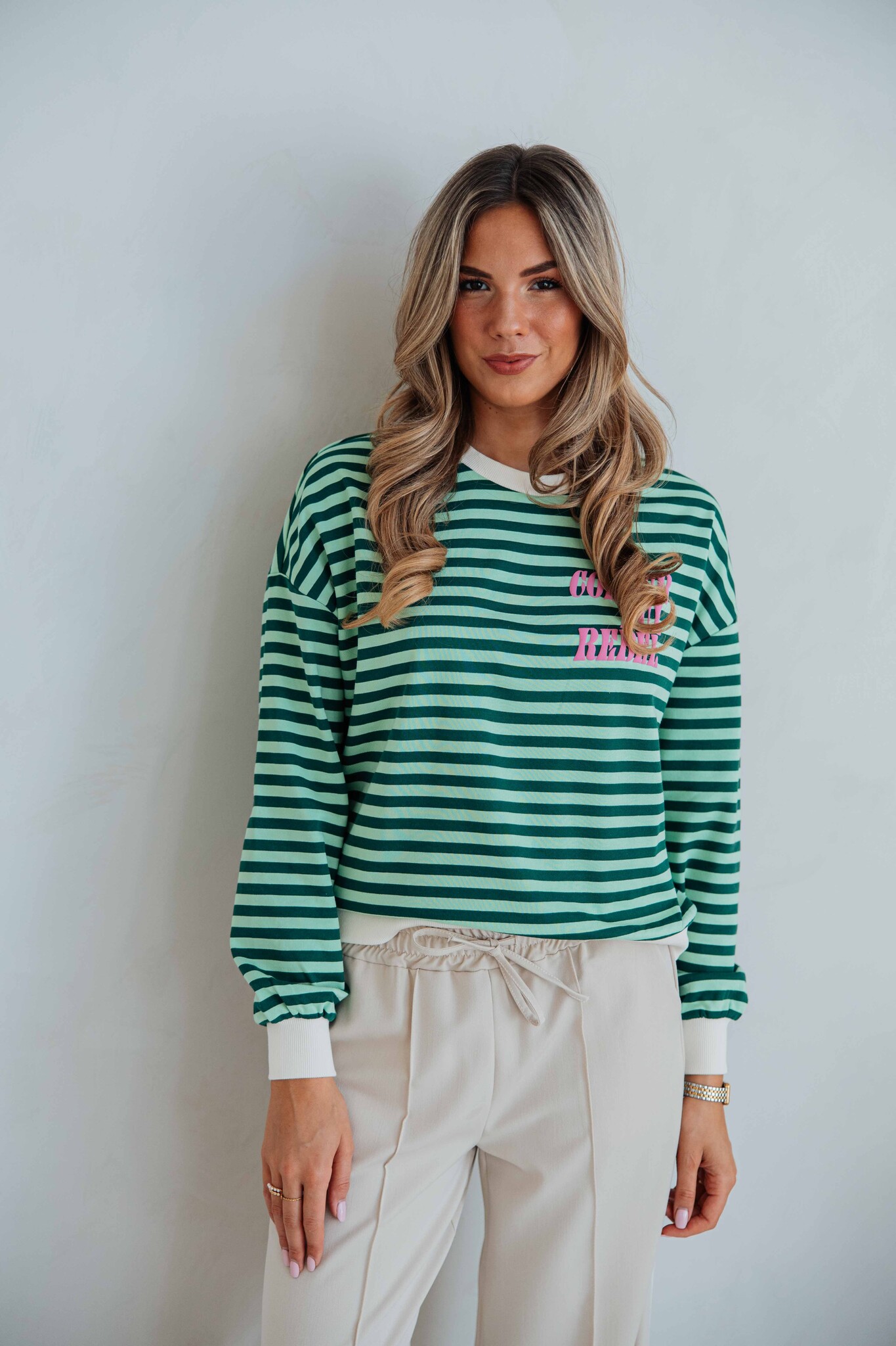 Deze dropped shoulder sweat van Colourful Rebel heeft een regular fit en een comfortabele uitstraling. Het leuke groene strepenpatroon geeft een frisse en speelse touch. De roze print op de voorkant zorgt voor een opvallend detail.