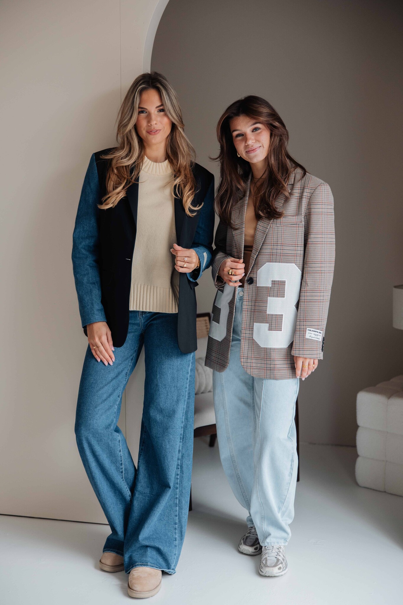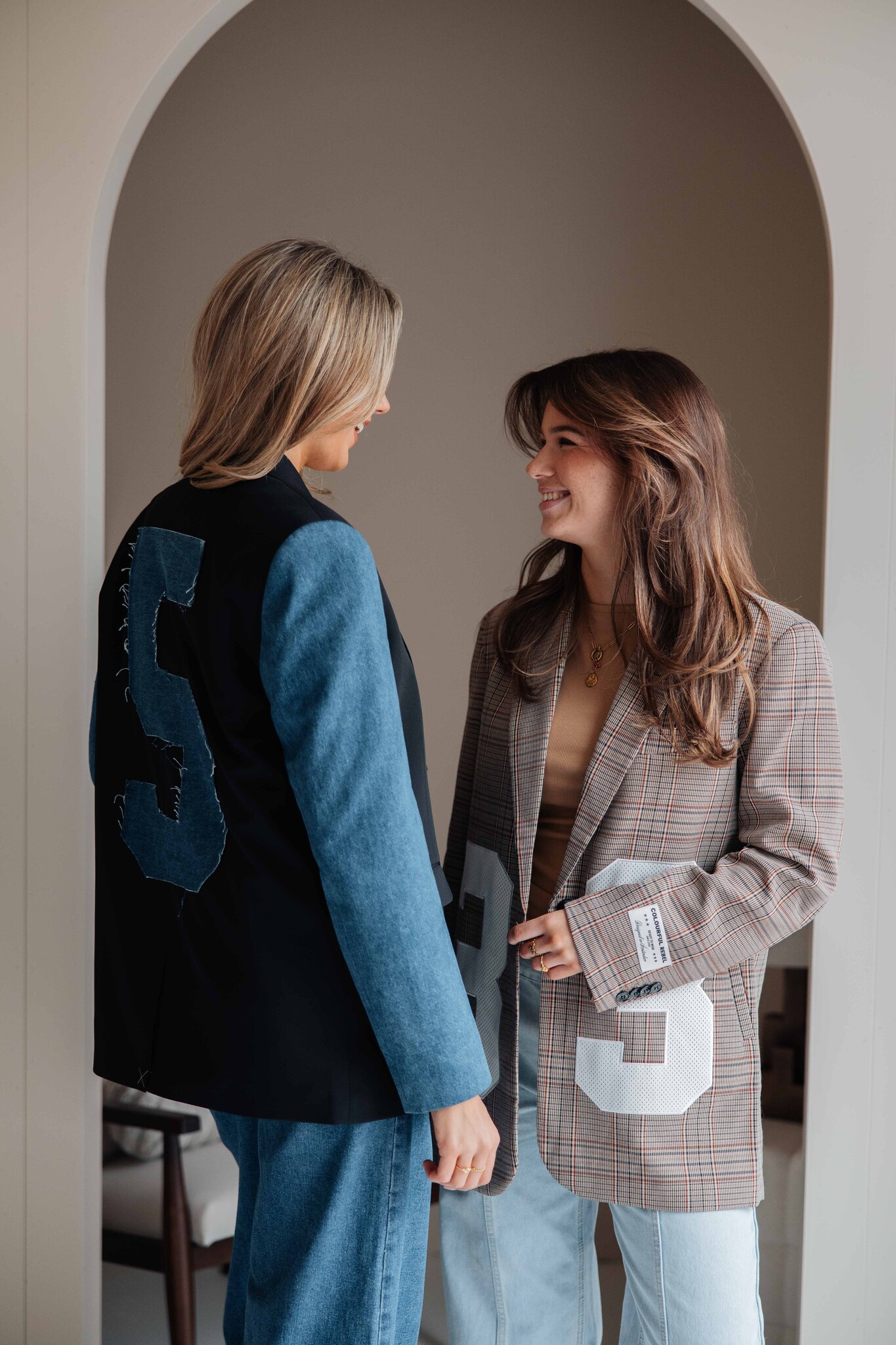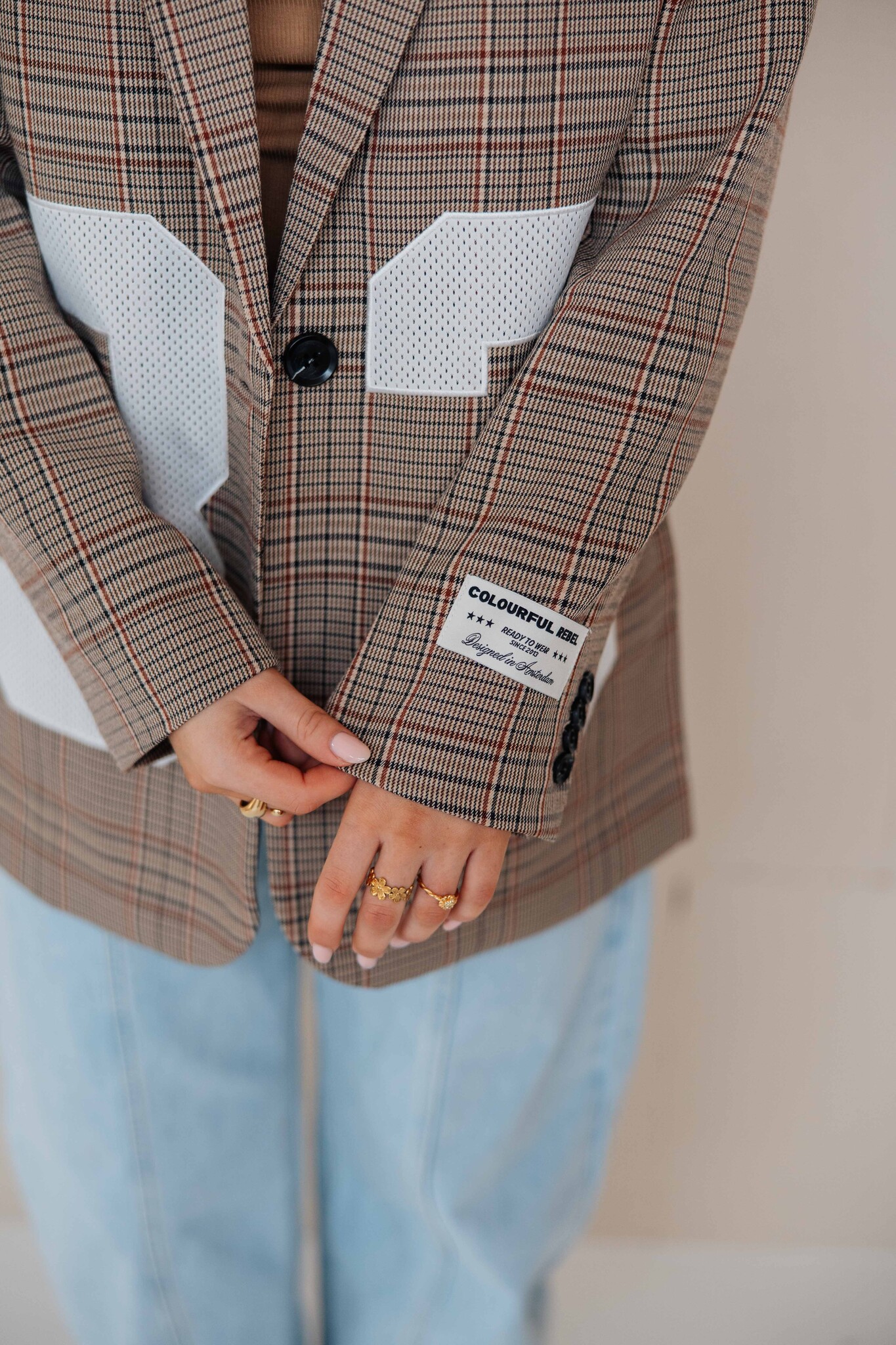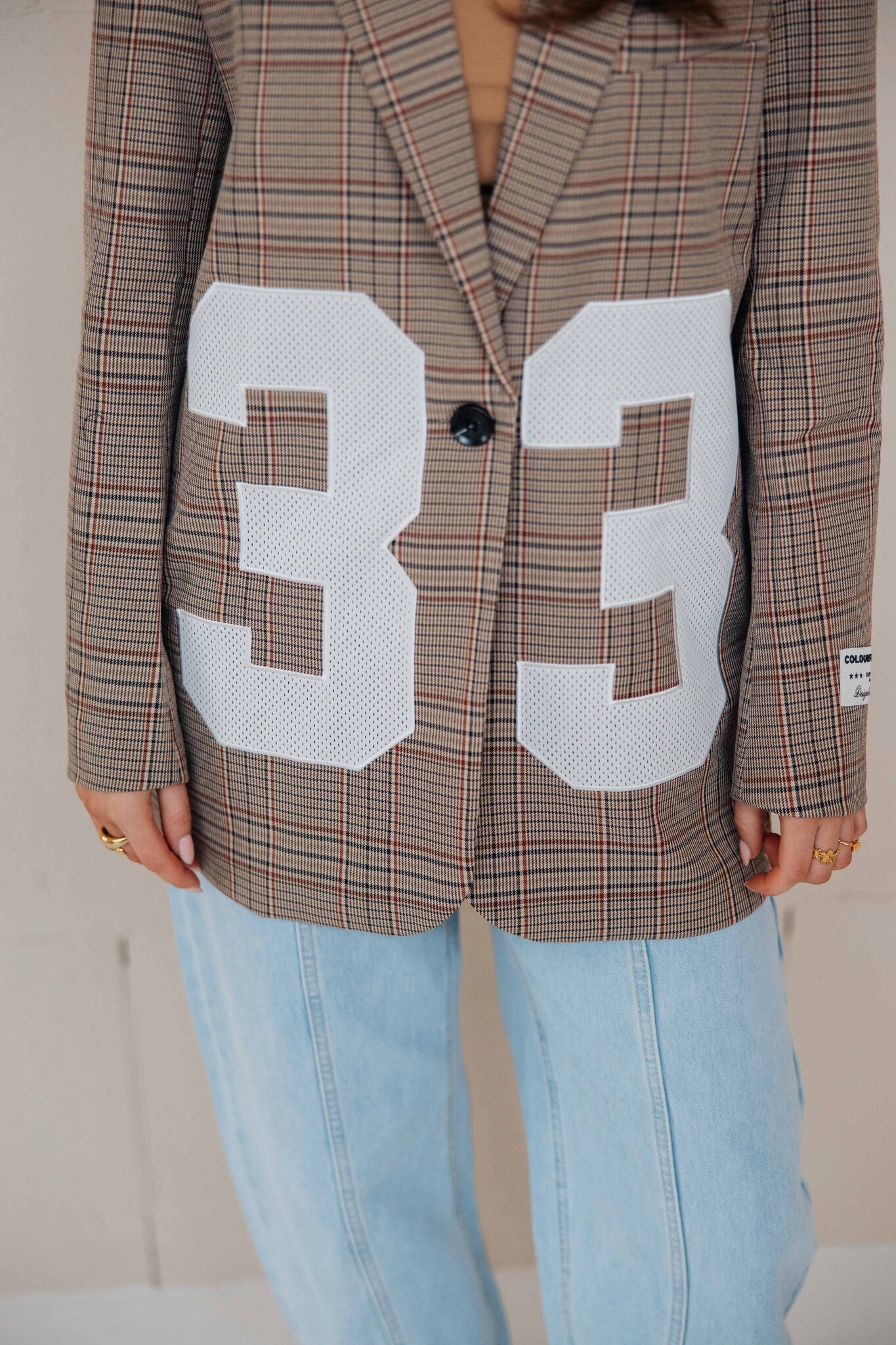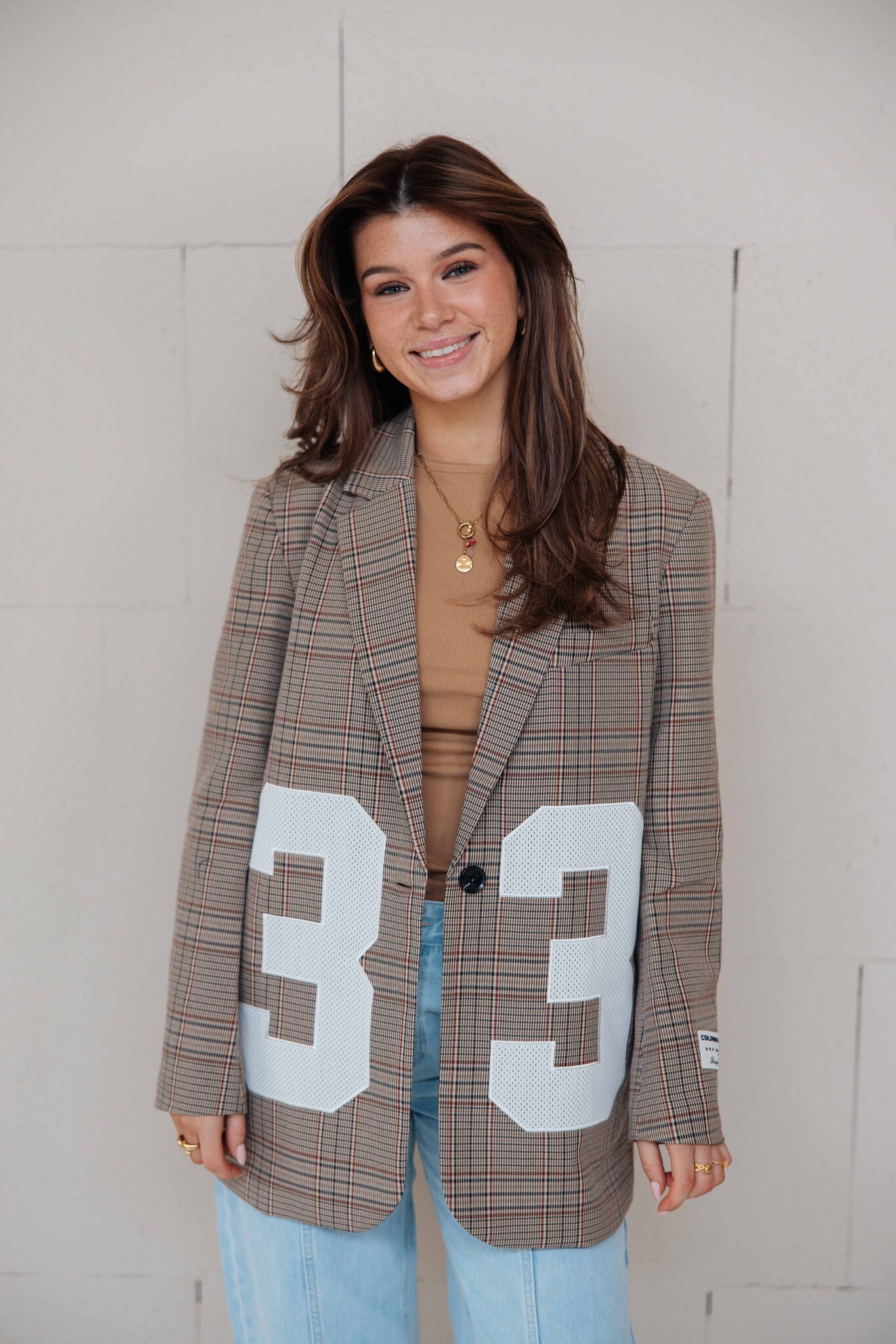 Deze blazer van Colourful Rebel heeft een geruit patroon en een cijferopdruk op de voorkant als detail. Leuk om te combineren met een trendy balloon jeans!