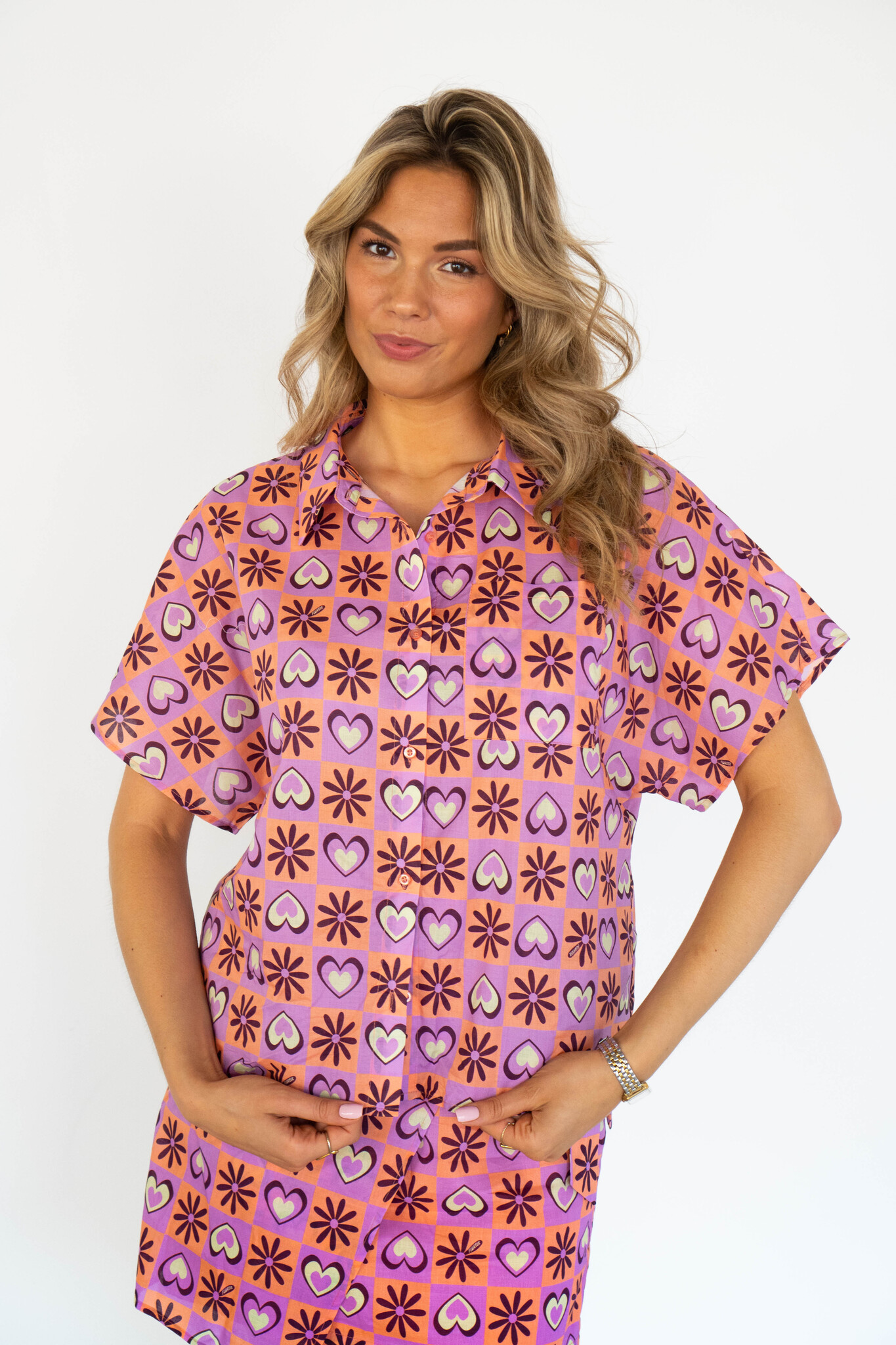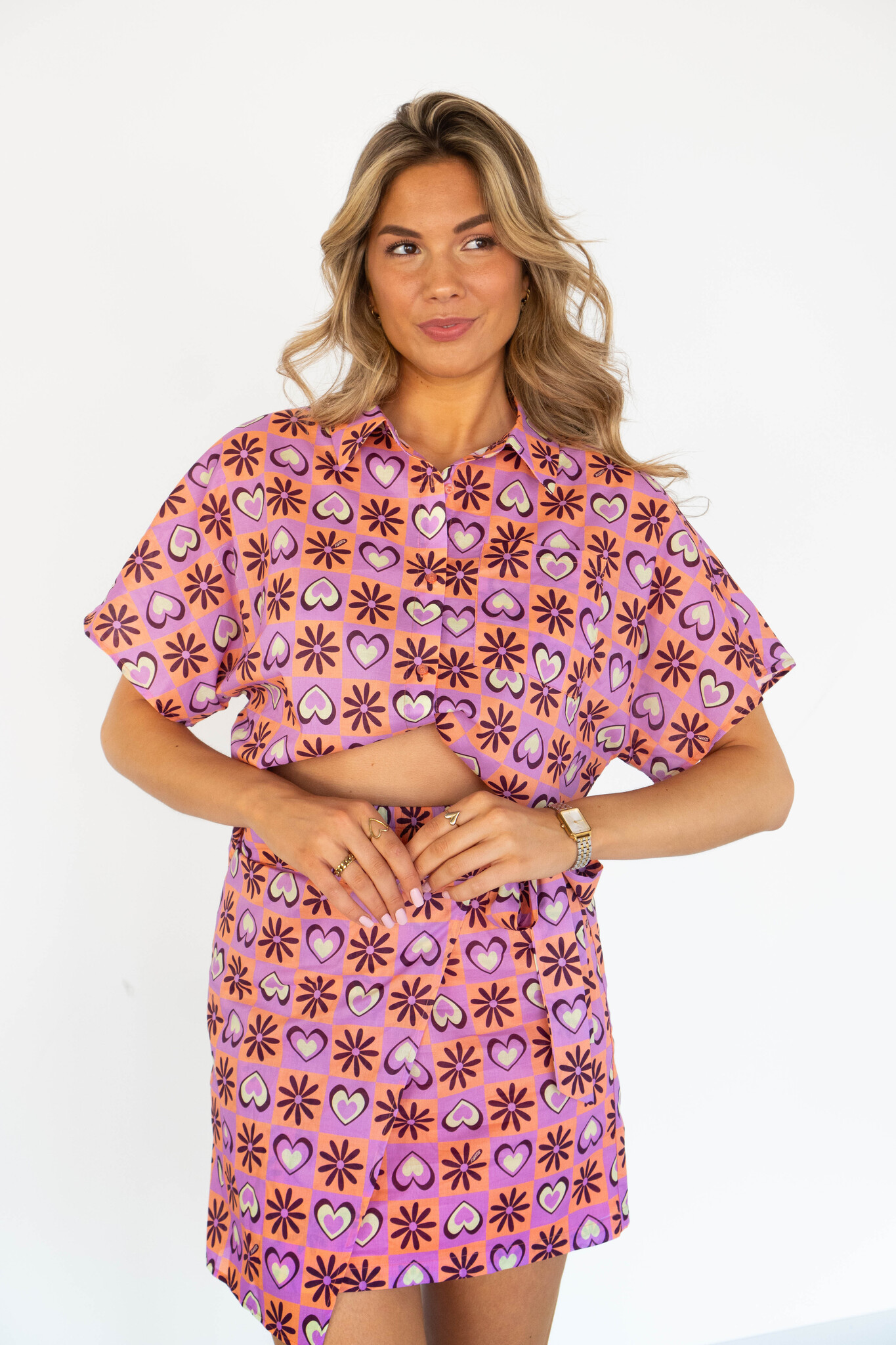 Wij krijgen helemaal vrolijke zomervibes van deze blouse! Deze blouse heeft een knoopsluiting, borstzak en heeft een wijde pasvorm. Combineer het met het bijpassende rokje voor een complete look!