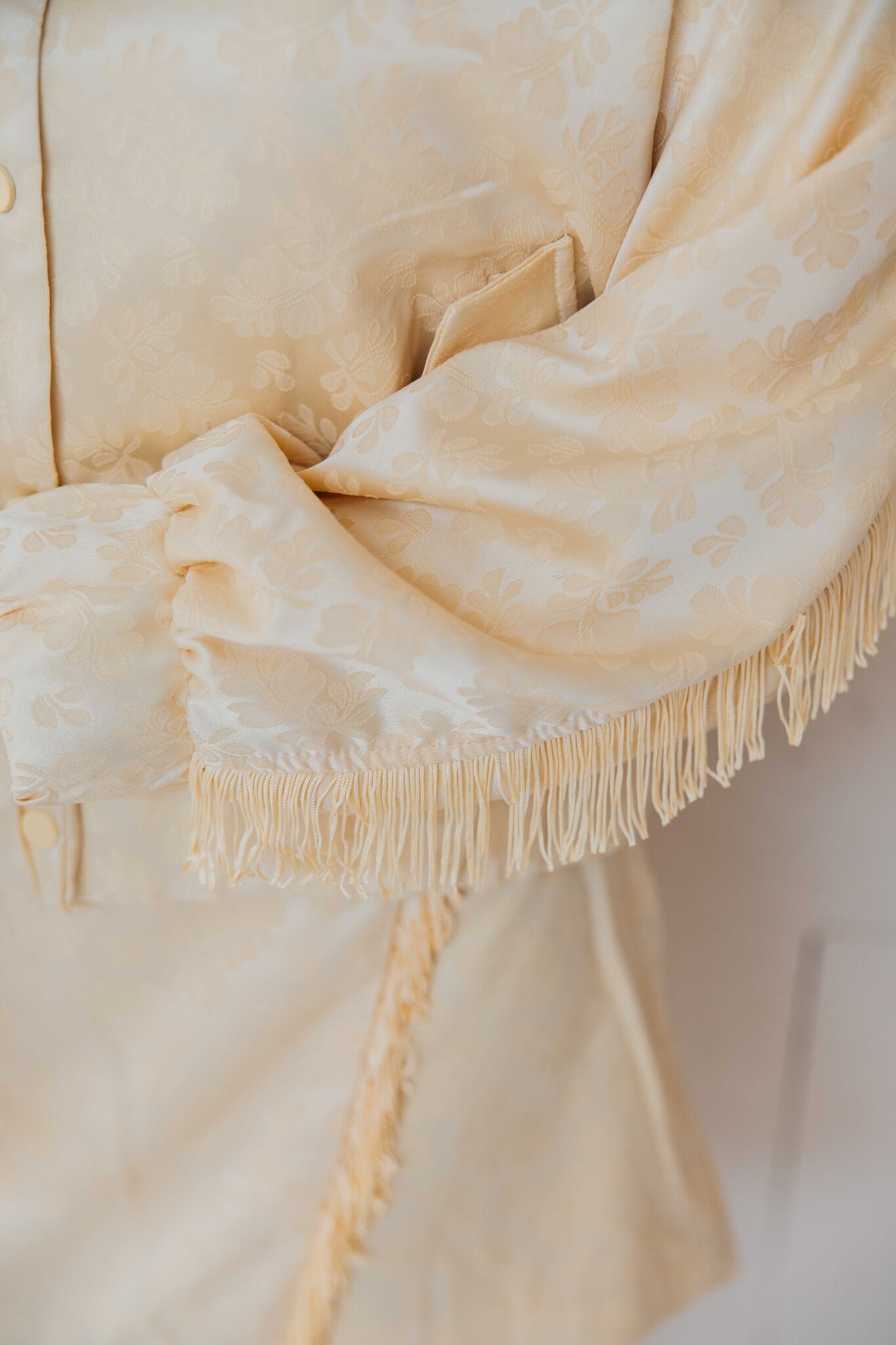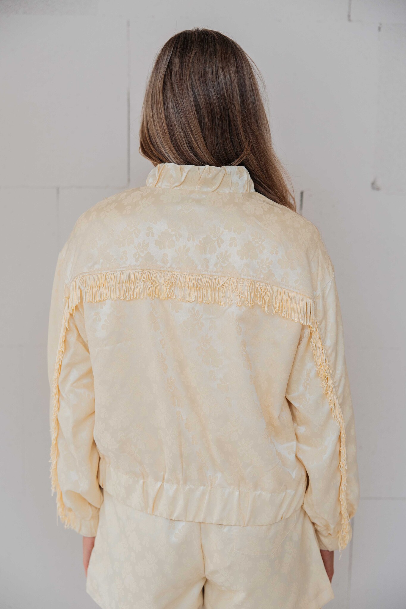 Dit jasje van Fluresk heeft een korte, licht boxy fit met een subtiele bloemenprint voor een elegante uitstraling. De franjes op de mouwen geven een speelse touch. Dankzij de elastische zoom zit hij comfortabel en valt hij mooi.