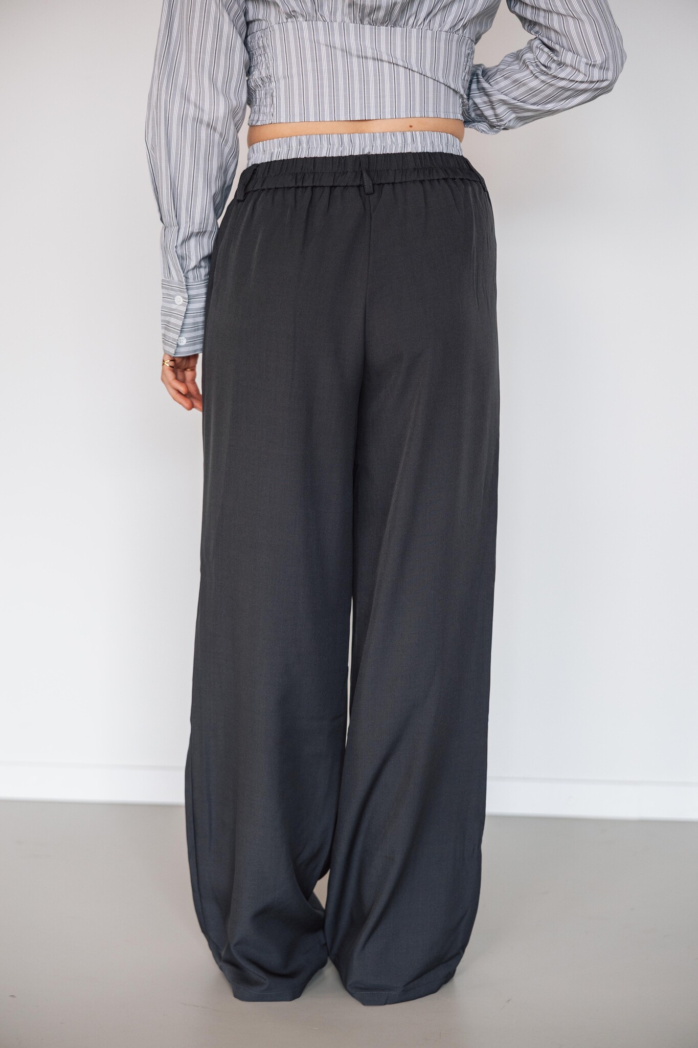 Deze broek van Fluresk is elegant, comfortabel en helemaal on-trend. Met de hoge taille, wijde pijpen en het subtiele streepdetail in de elastische tailleband is deze broek zowel chic als casual te dragen.
