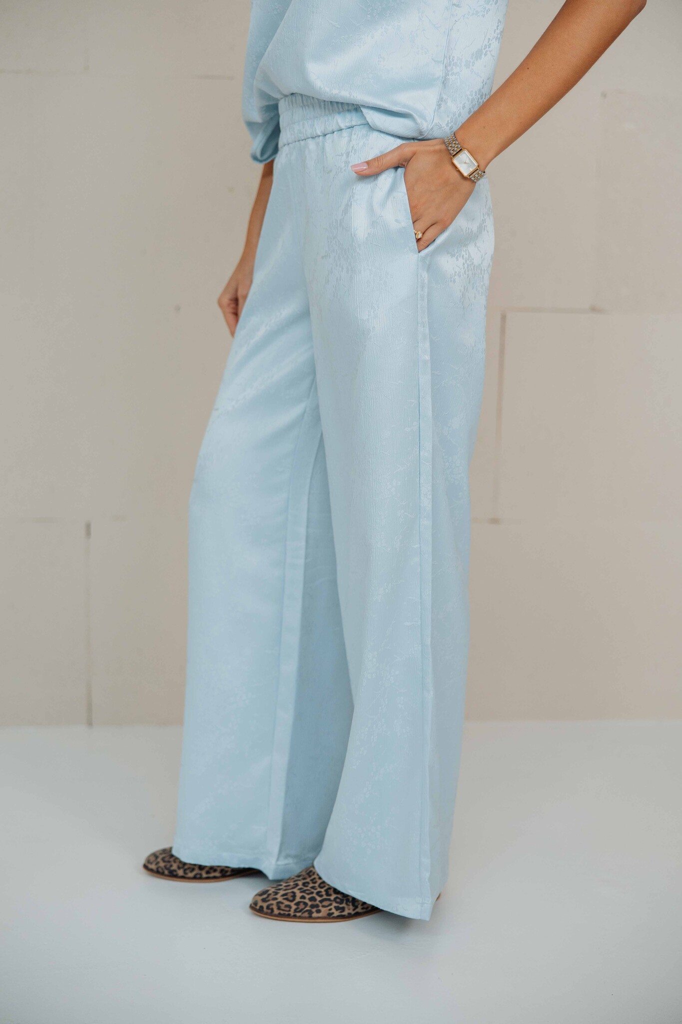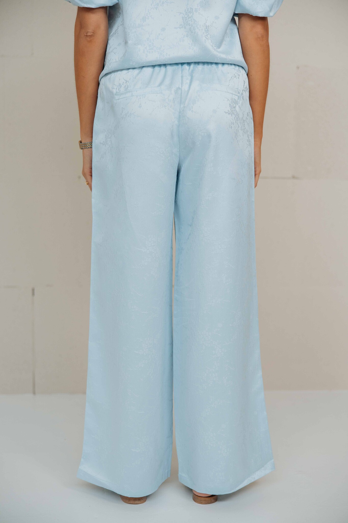 Deze broek van Fluresk combineert comfort met een chique uitstraling. De soepelvallende stof en elastische tailleband zorgen voor een fijne fit, terwijl de subtiele glans de broek een luxe touch geeft.