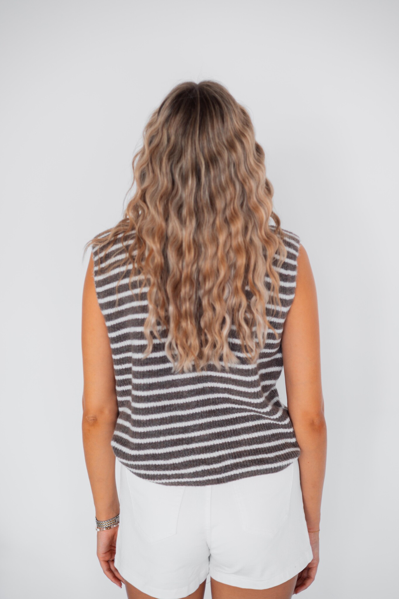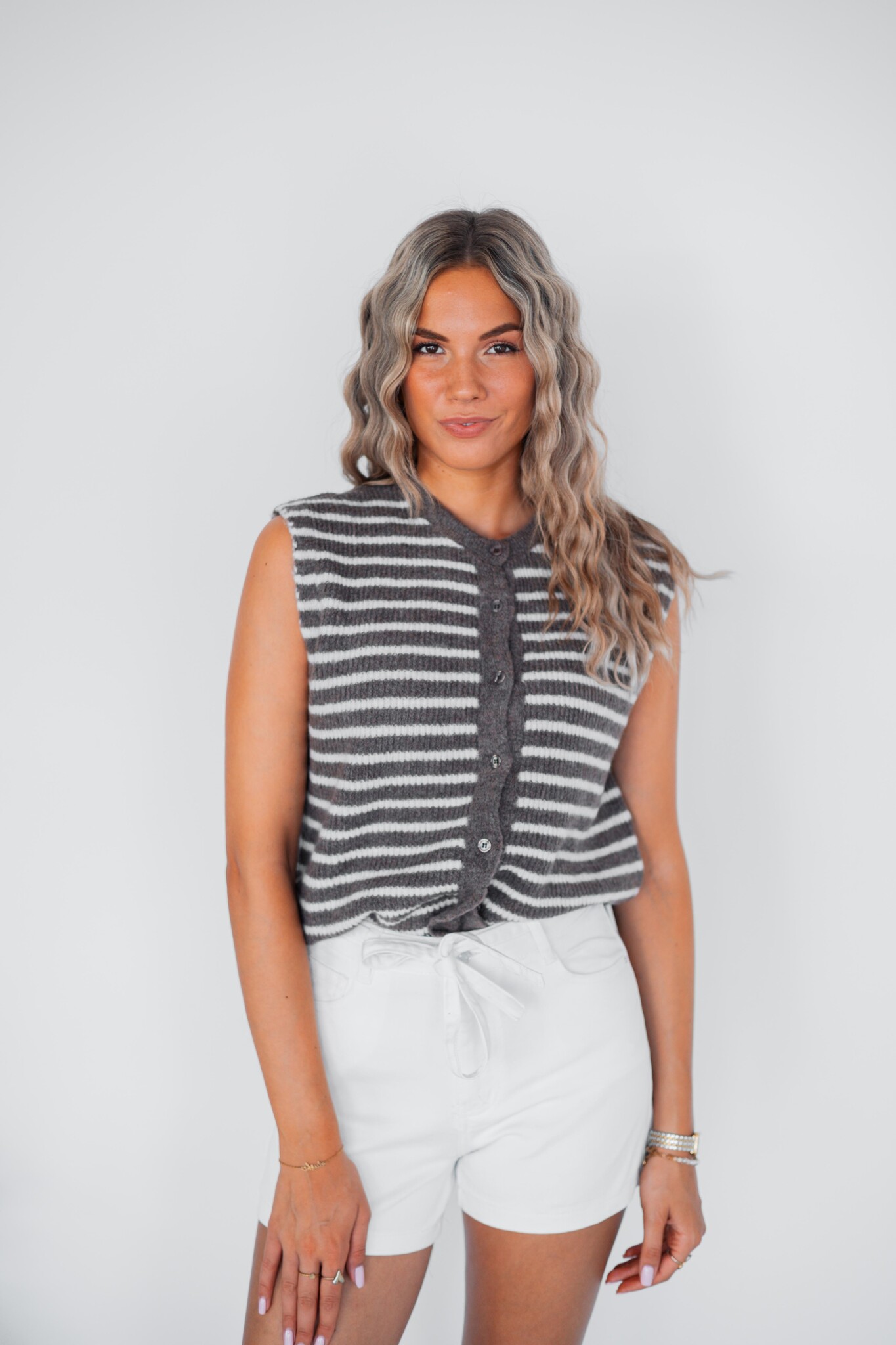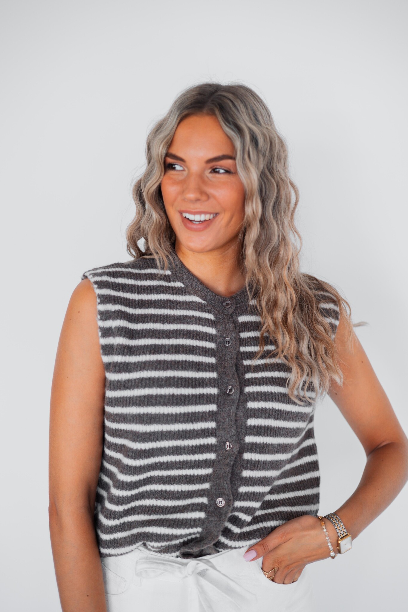 Dit gilet is gebreid, heeft een gestreept patroon en een knoopsluiting.