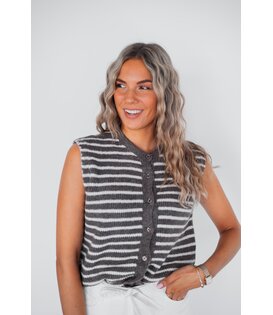 Dit gilet is gebreid, heeft een gestreept patroon en een knoopsluiting.