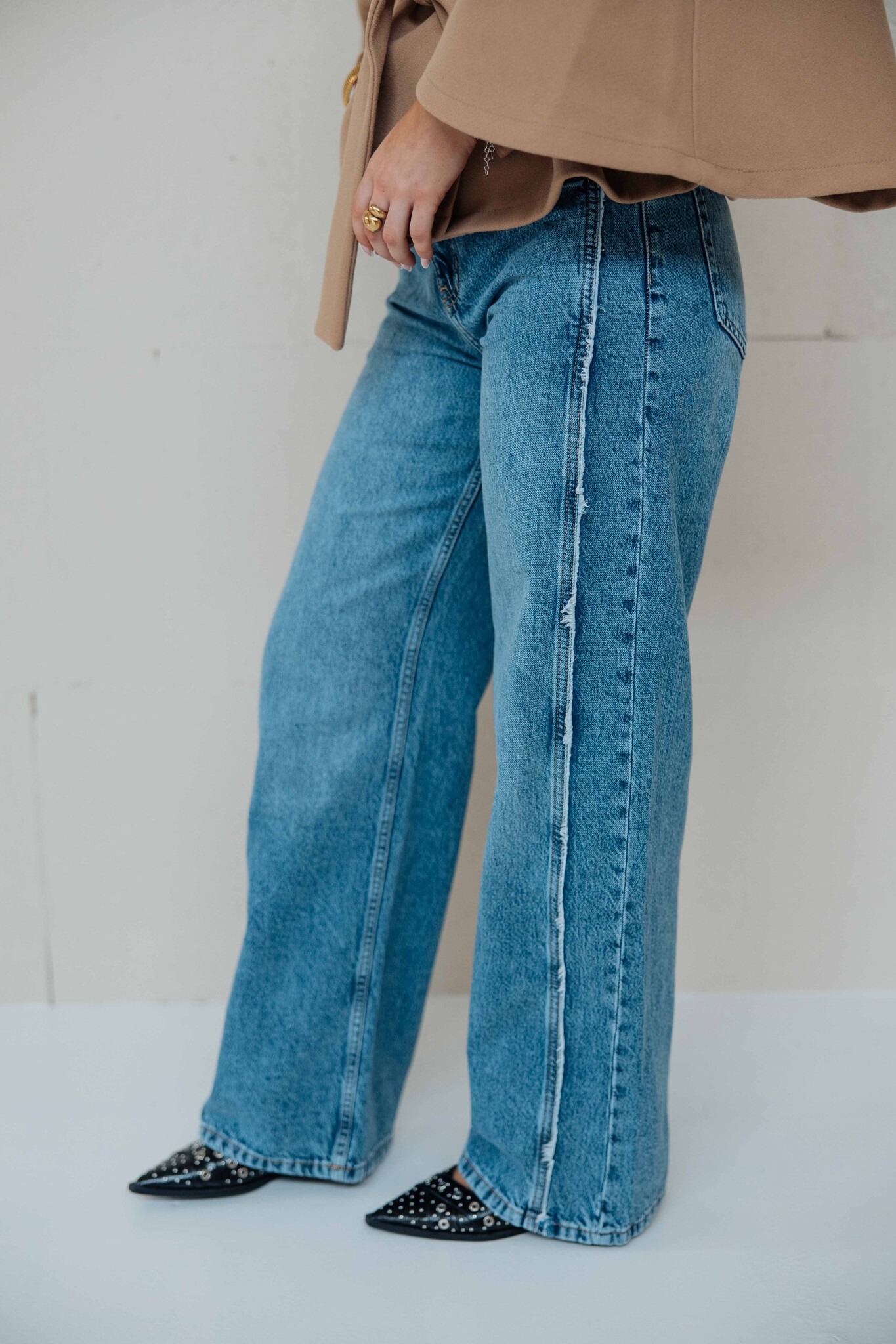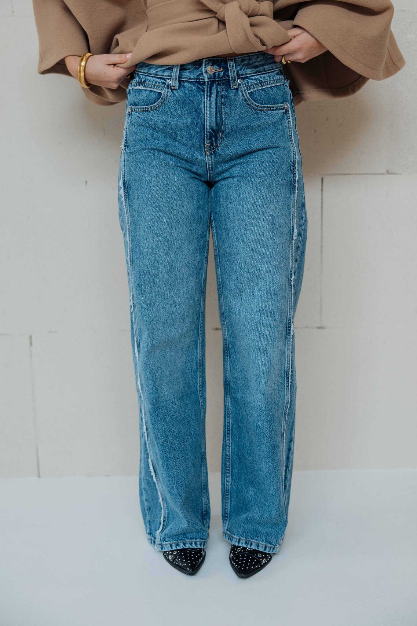Deze wide leg jeans van Gina Tricot is trendy en comfortabel. De broek heeft een midden taille en een mooie blauwe wassing voor een tijdloze look. Het zoomdetail aan de zijkant van de jeans geeft een extra touch!