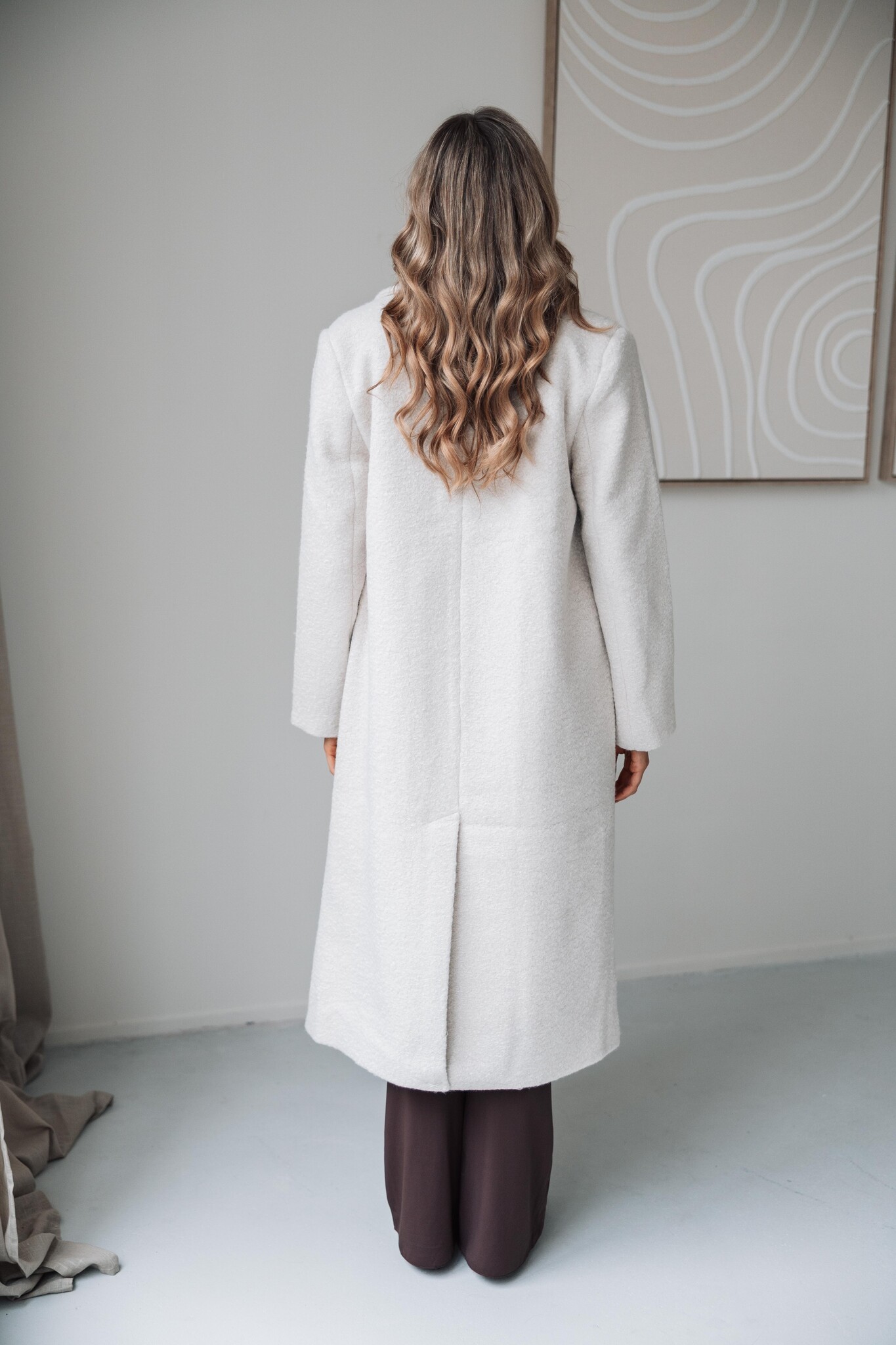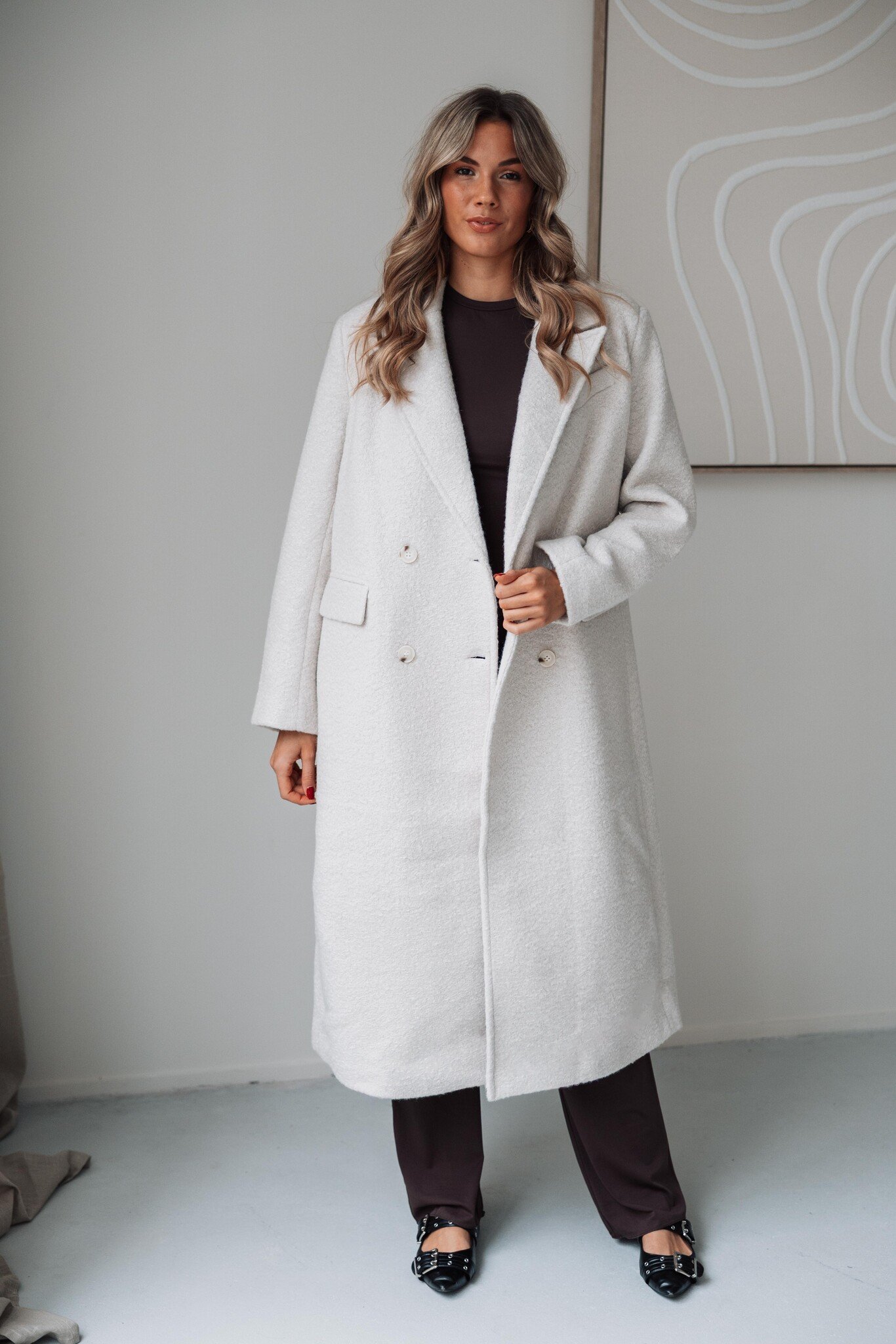 Deze lange jas van Gina Tricot heeft een oversized pasvorm, een mooie beige kleur, is gevoerd en heeft klepzakken. Verder heeft de jas knopen aan de voorkant, een kraag en lange mouwen.