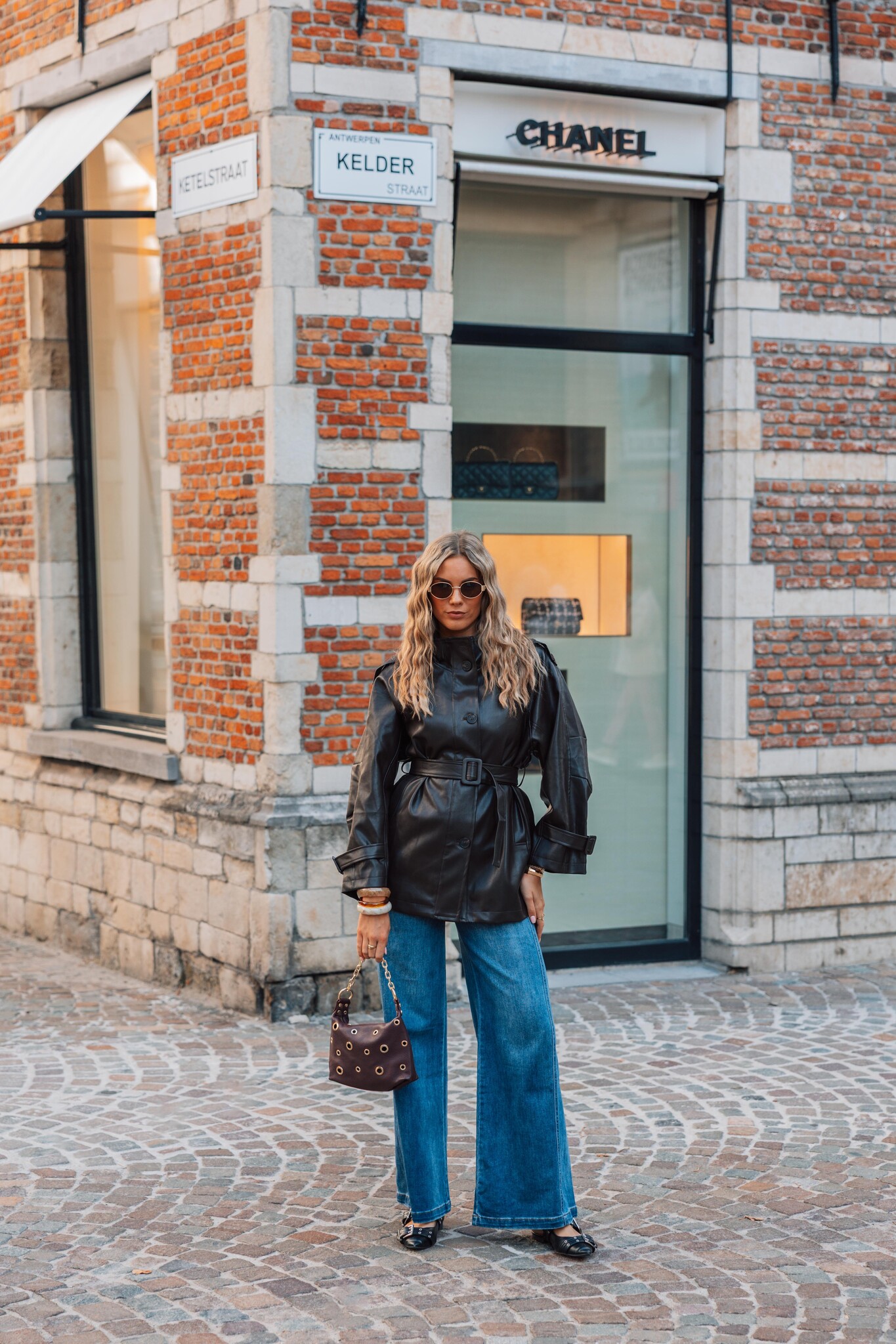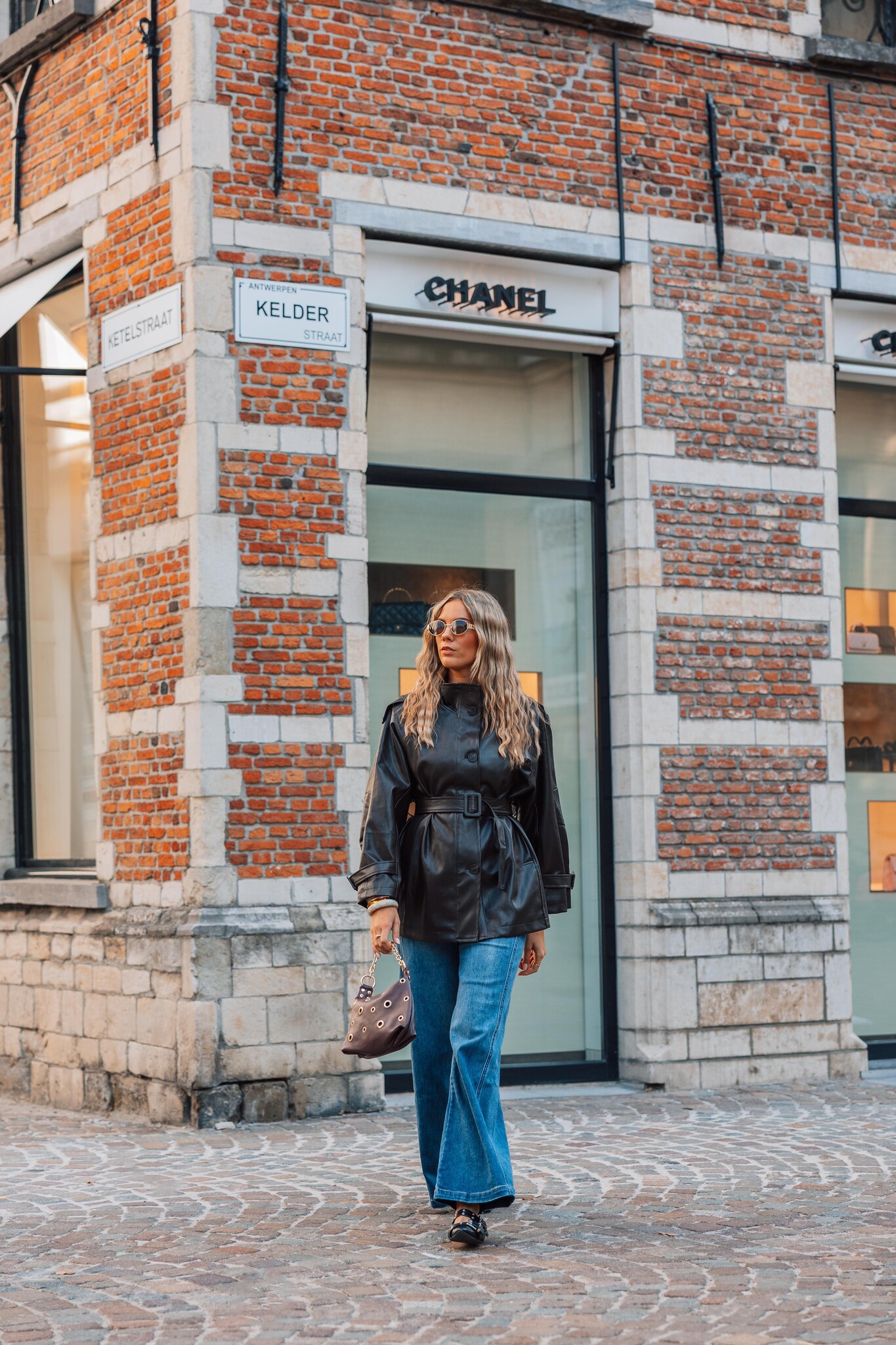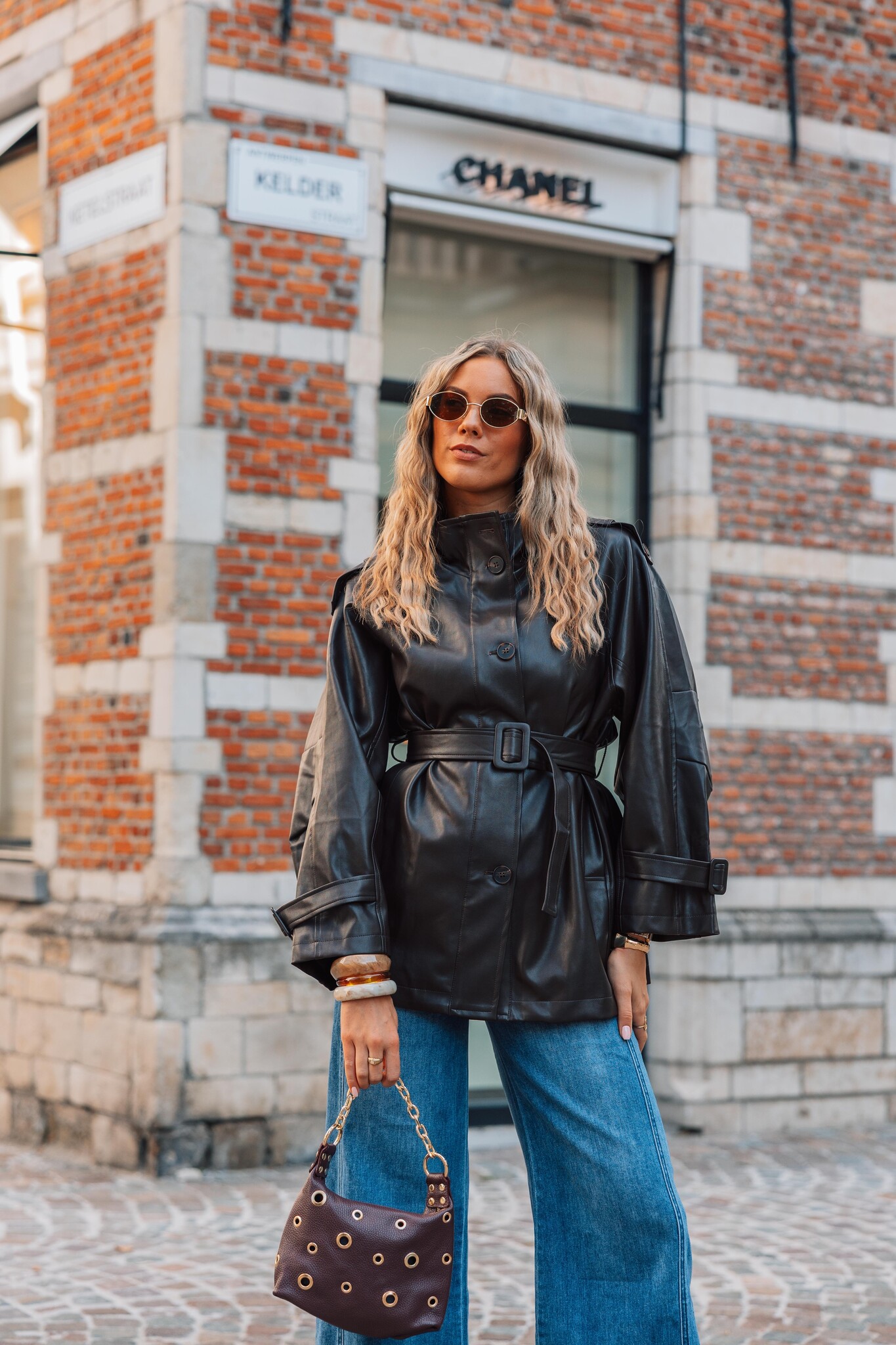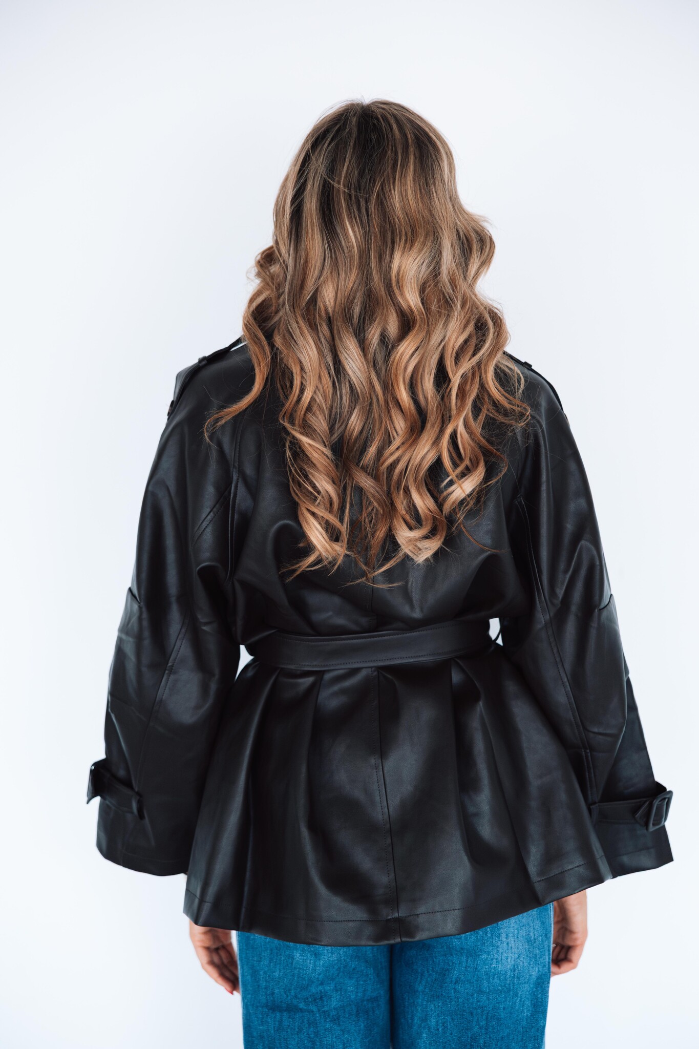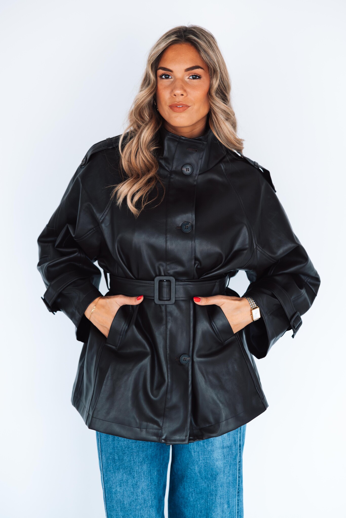 Deze leather look jas combineert een stoer design met een vrouwelijke pasvorm. De jas heeft een hoge kraag, een knoopsluiting en steekzaken. Het bijpassend ceintuur in de taille zorgt voor een elegante pasvorm.