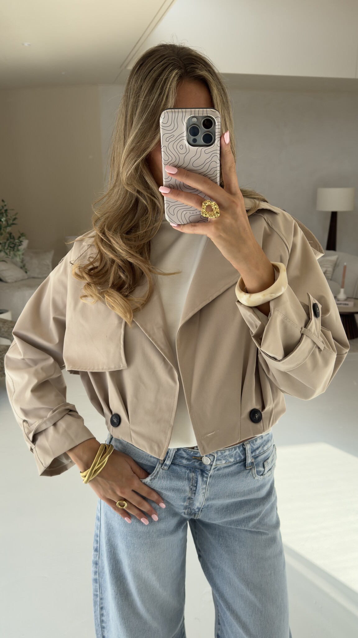 Deze korte trenchcoat heeft een mooie beige kleur en een trendy balloon fit. De knoopdetails aan de voorkant geven ’m een extra stijlvolle touch. Makkelijk te combineren voor elke gelegenheid.