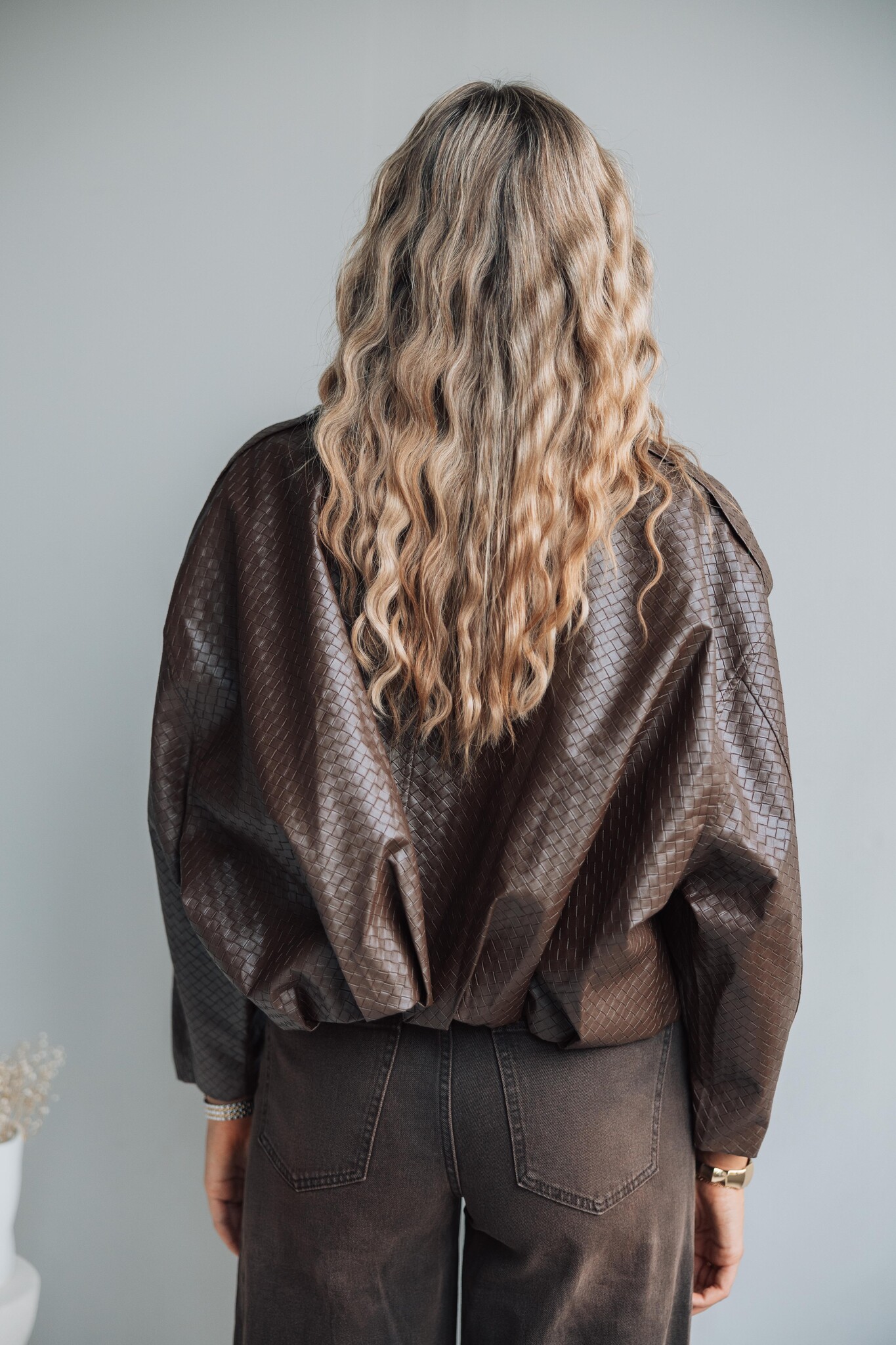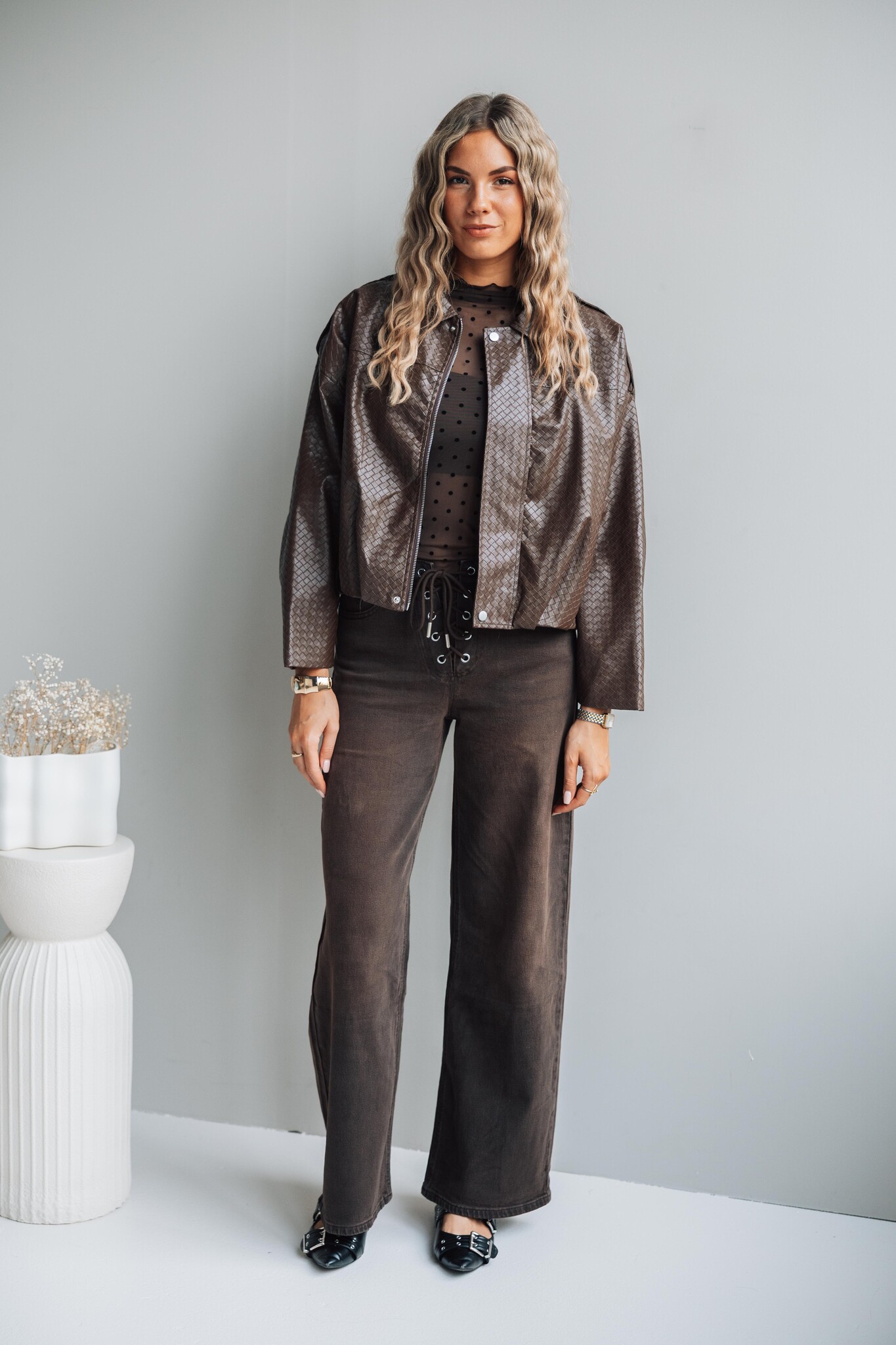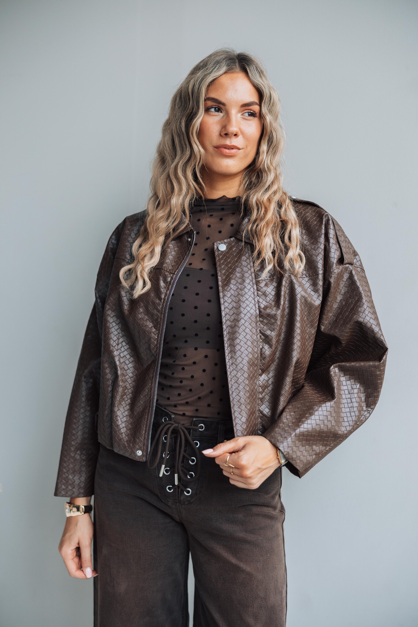 Dit jasje komt in een bruine kleur en heeft een braided patroon. Draag het op een bruine jeans voor een stijlvolle look!