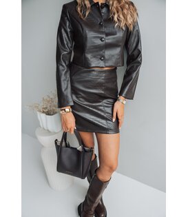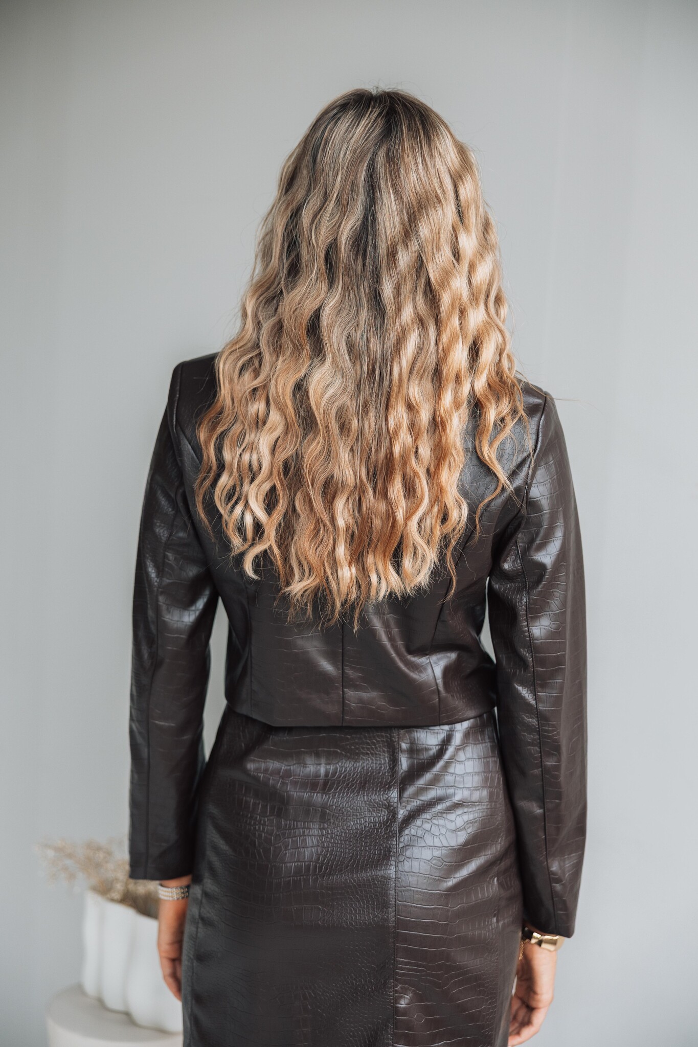 Dit jasje komt in een mooie bruine kleur en heeft een slangenpatroon. Het korte model met de knoopjes in het midden geeft het jasje een trendy look.