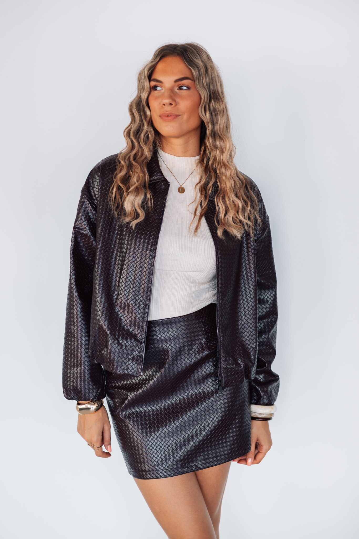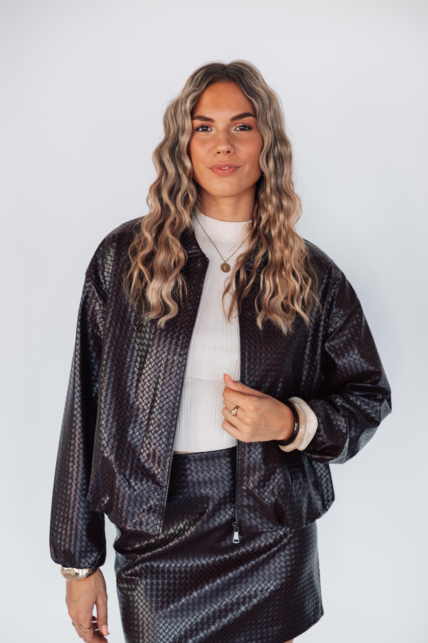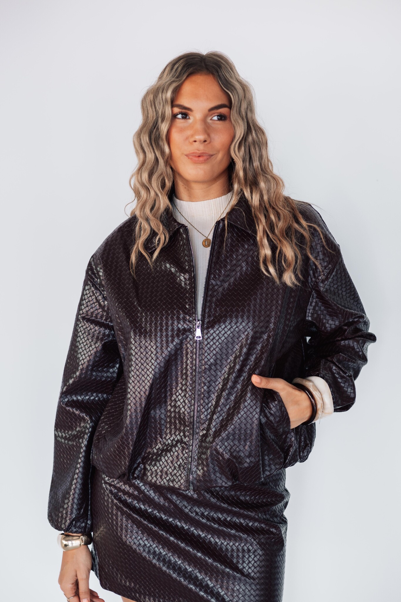 Trend alert! Dit jasje heeft een gevlochten patroon, een ritssluiting aan de voorkant en is gevoerd. Combineer het met het bijpassende rokje voor een complete look.
