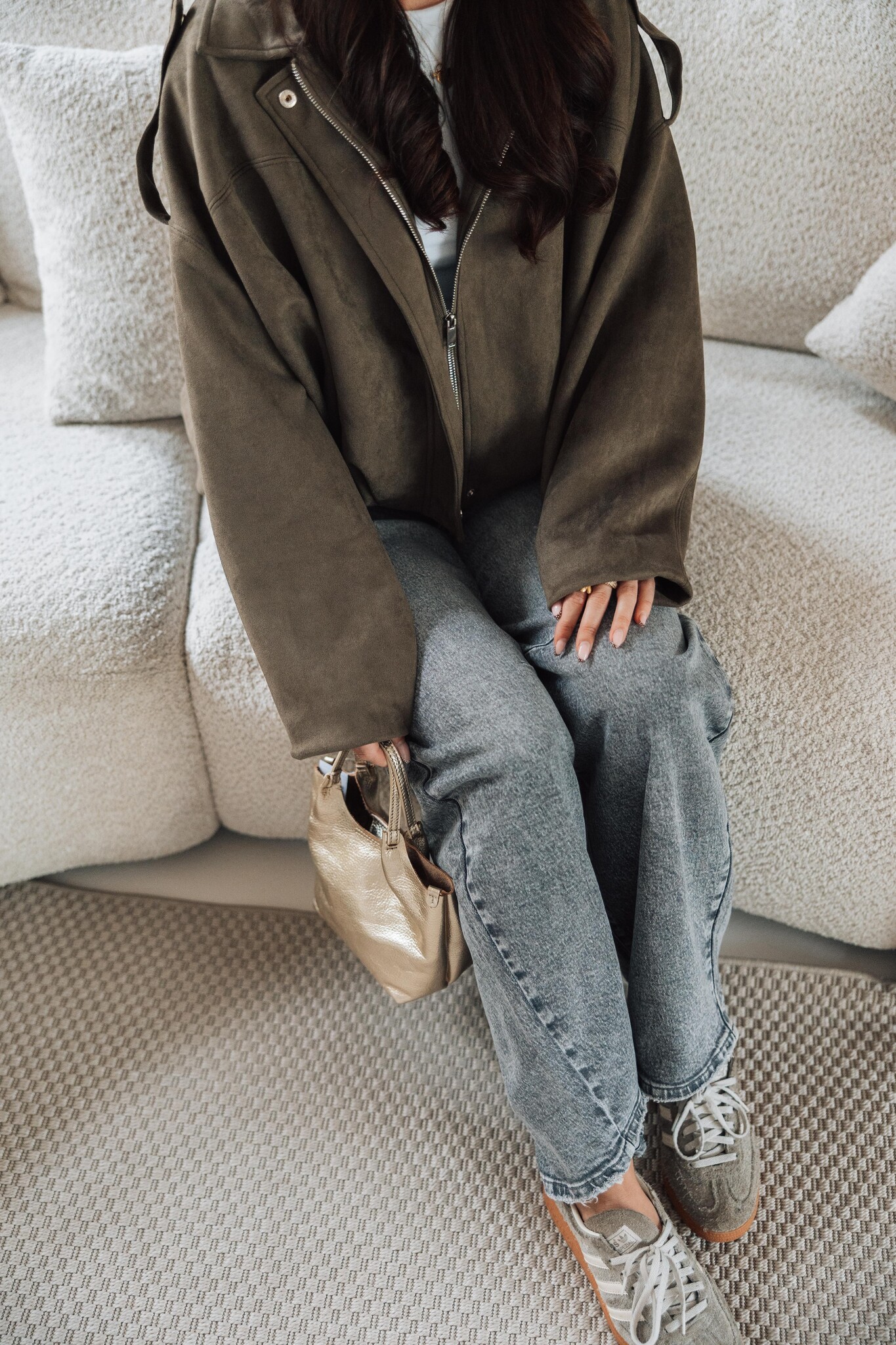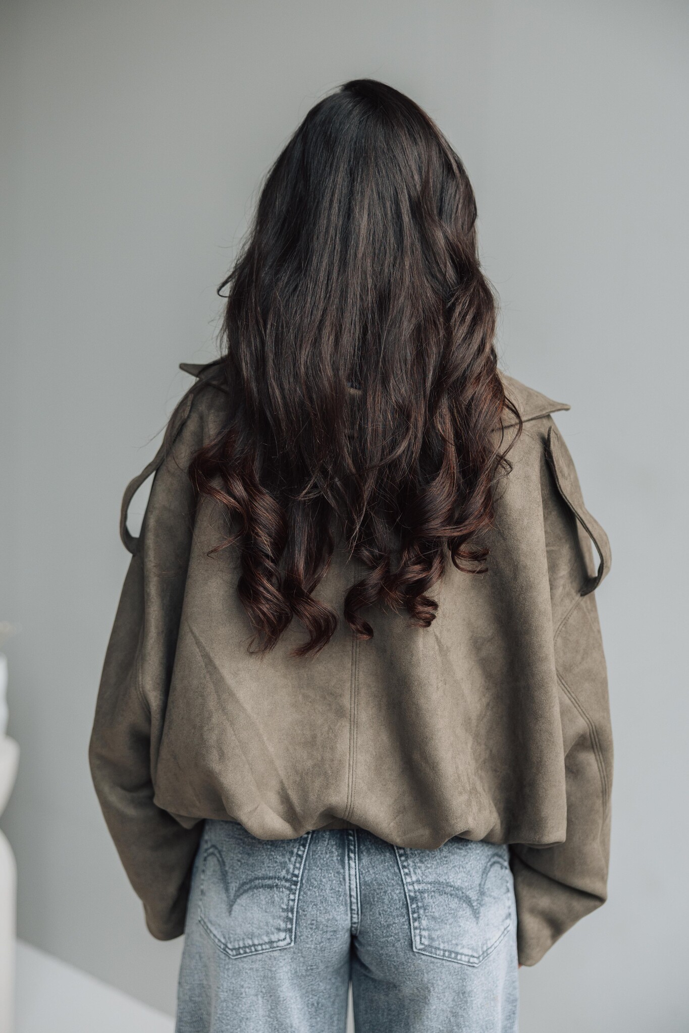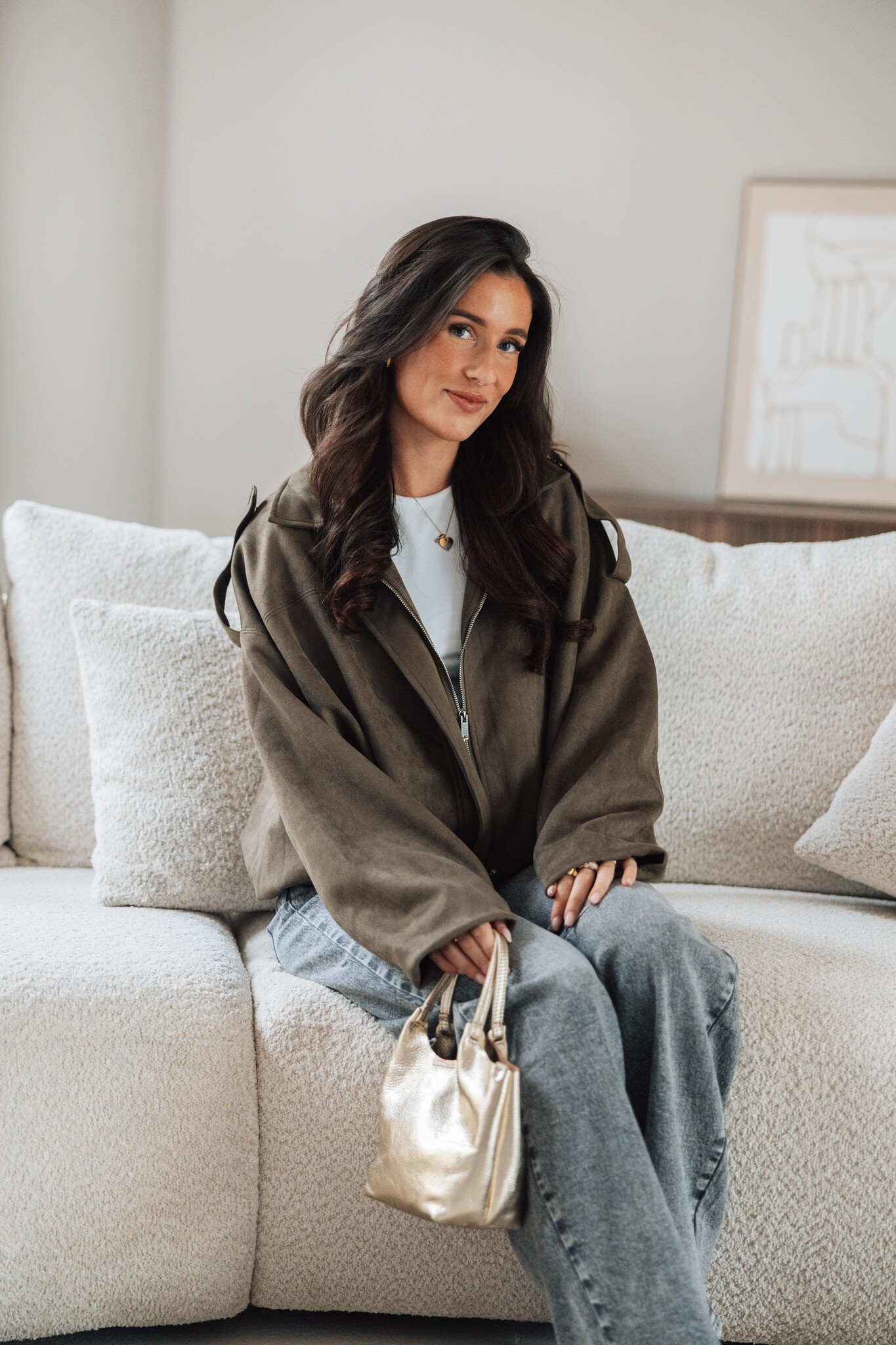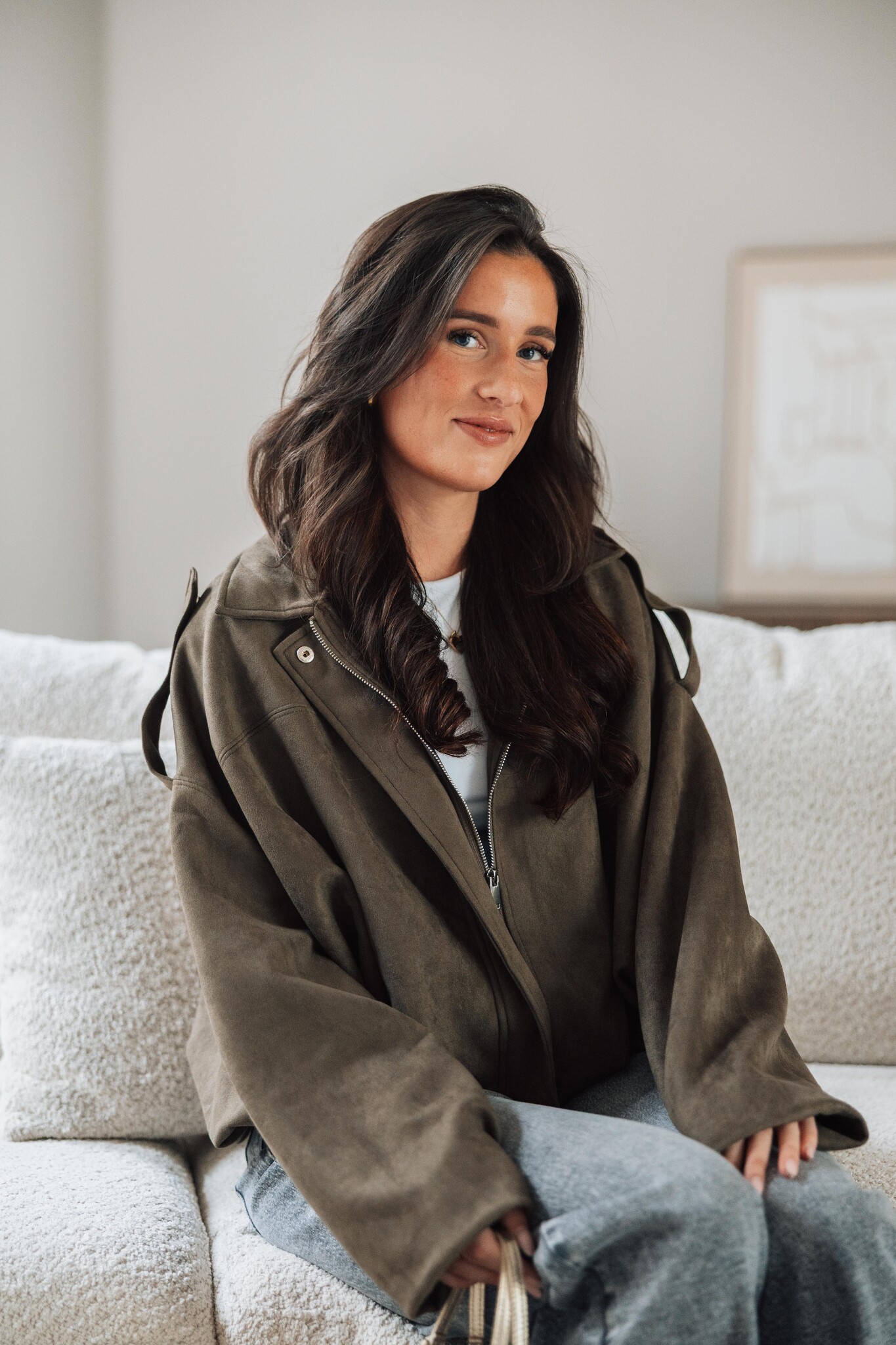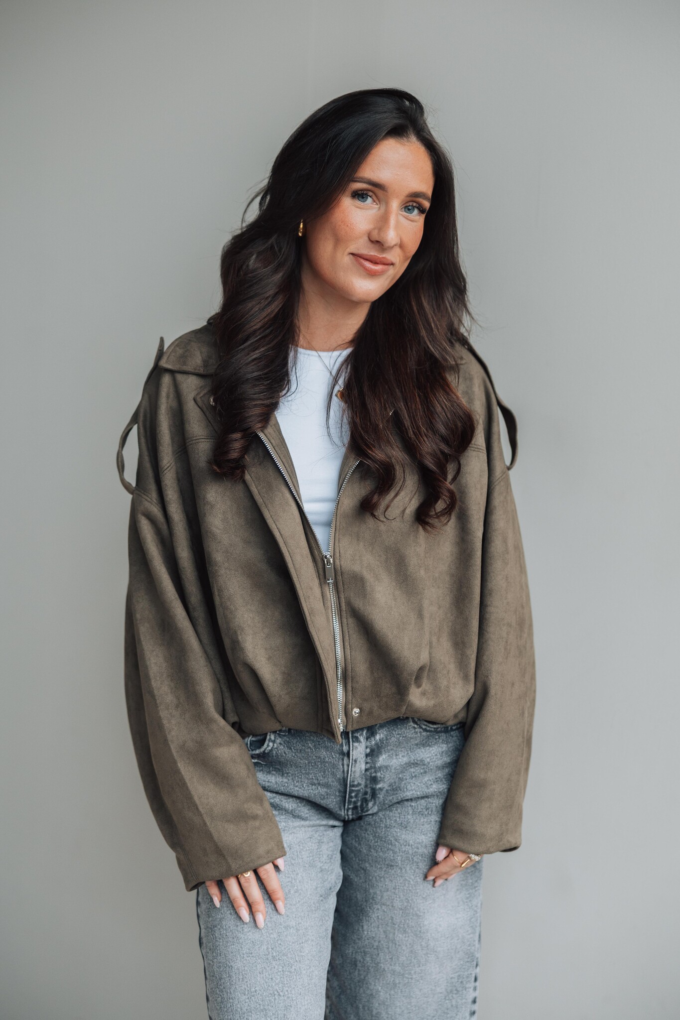 Dit suède look jasje komt in een kaki groene kleur, heeft een ballon fit en een rits in het midden. Het perfecte jasje voor de herfst, stijlvol en makkelijk te combineren.