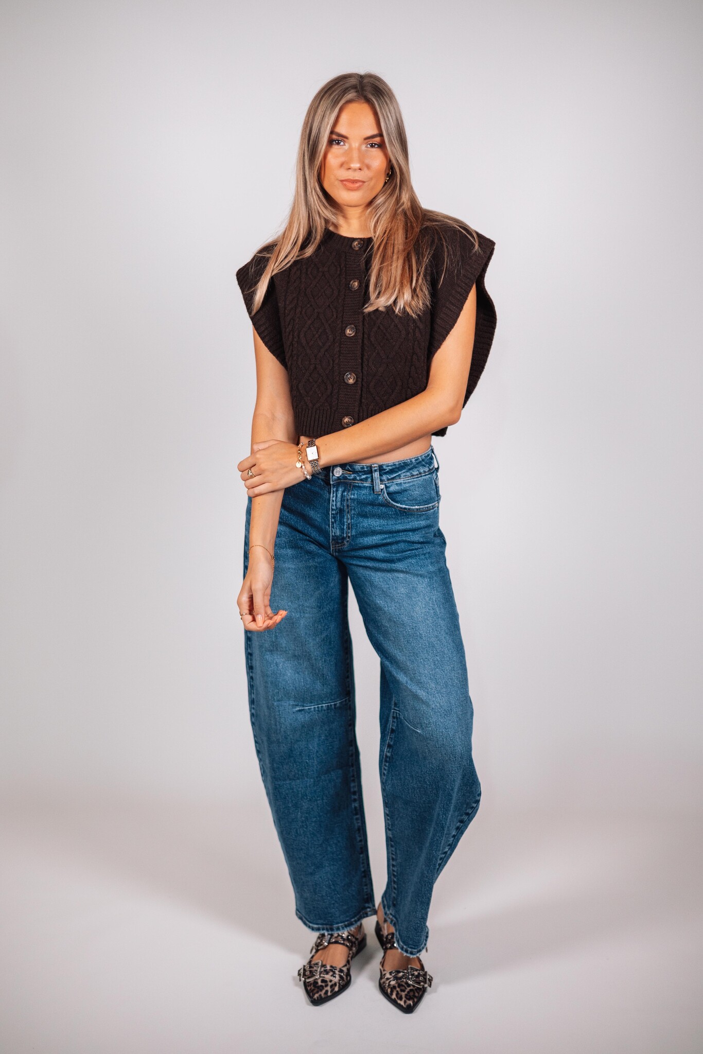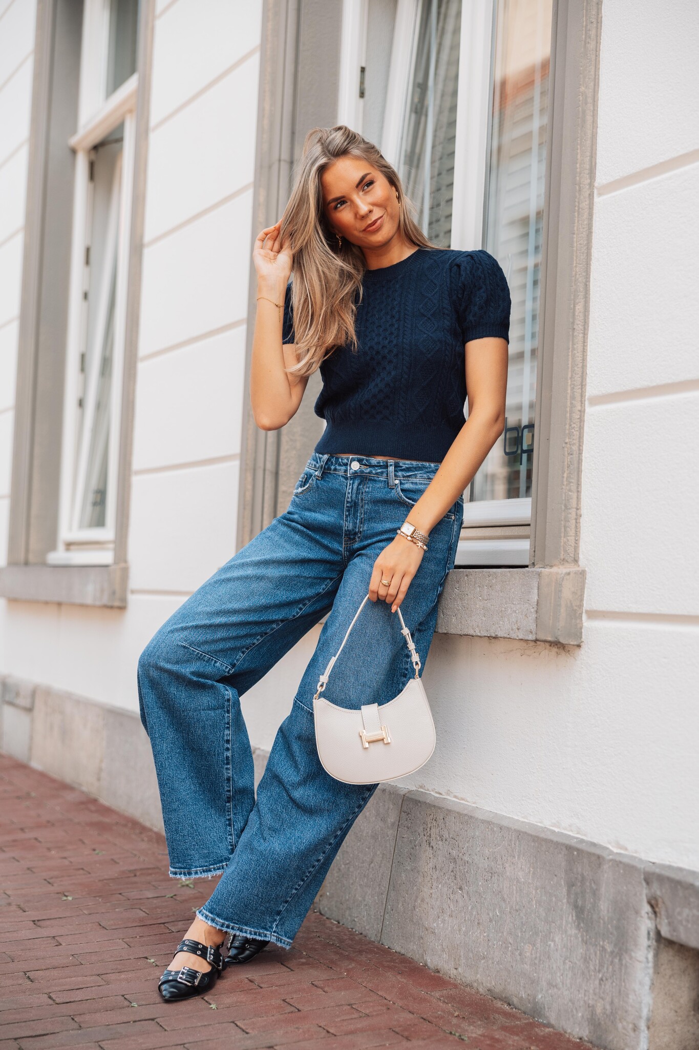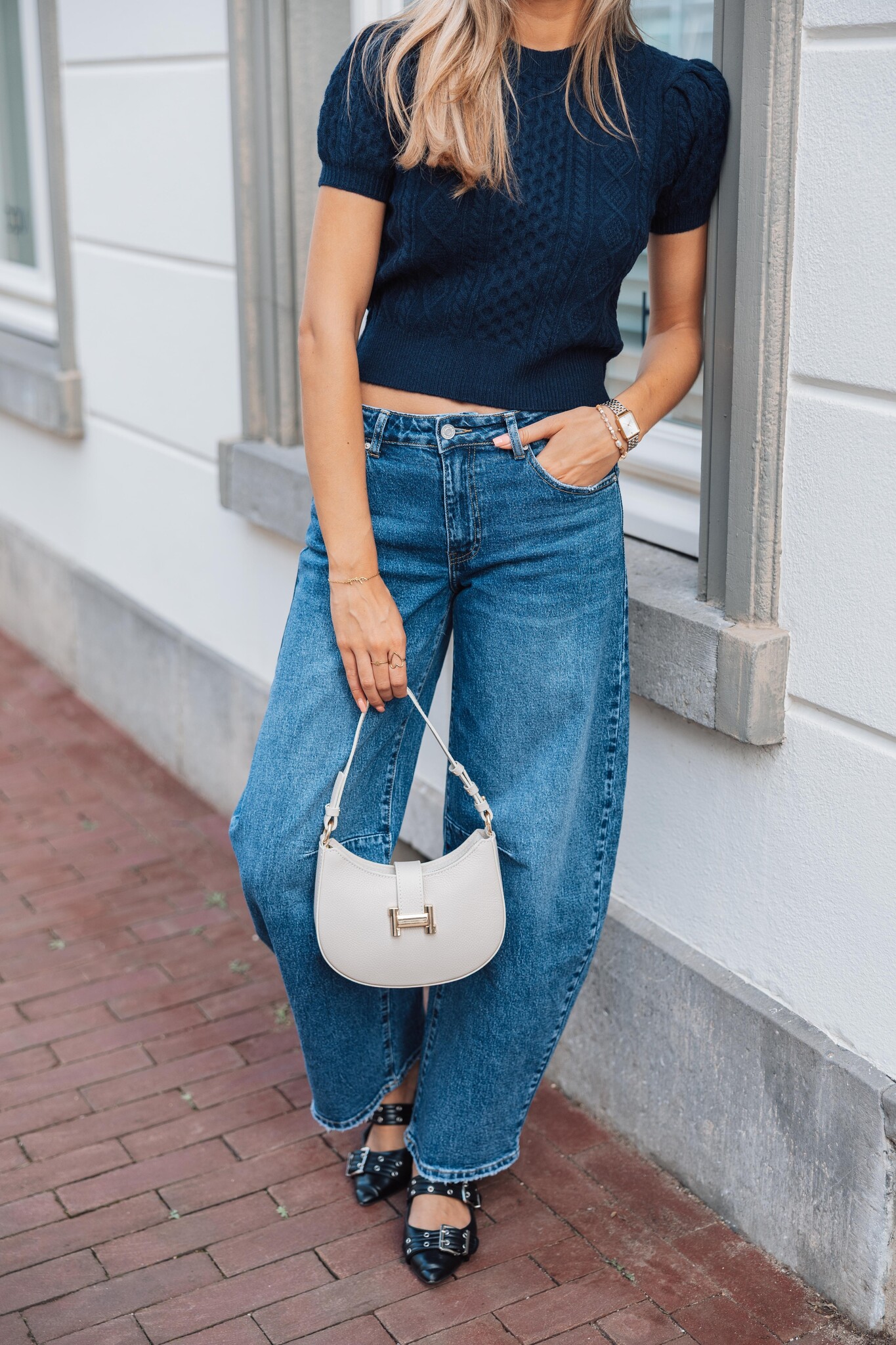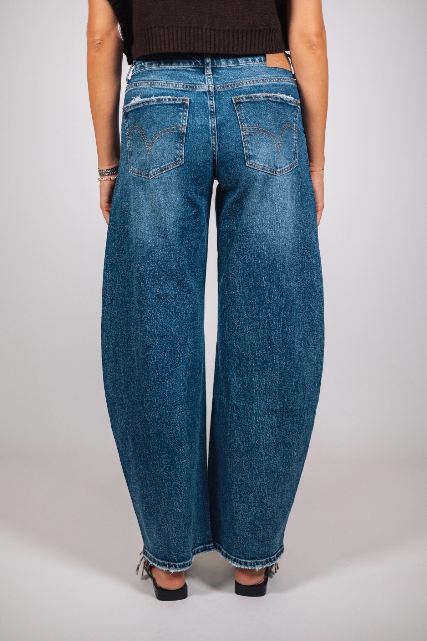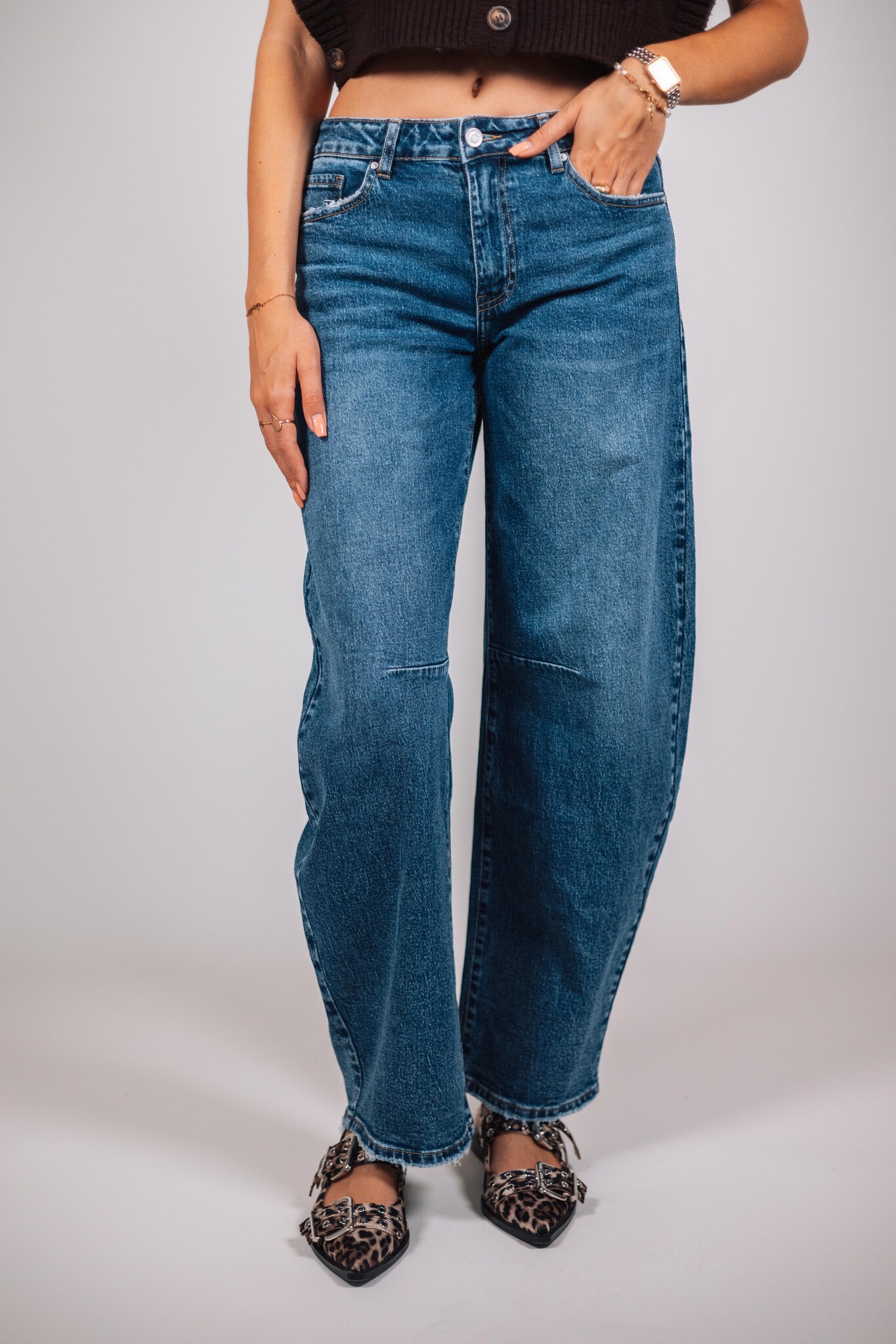 Deze jeans heeft een dark denim wassing, een mid-waist taille met riemlusjes en een balloon fit met stretch. We love this jeans trend!