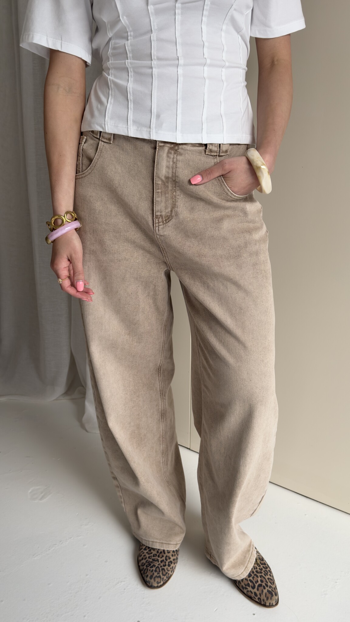 Deze balloon jeans heeft een mooie taupe wassing, stretch en een baggy fit. De jeans heeft leuke riemlus details.