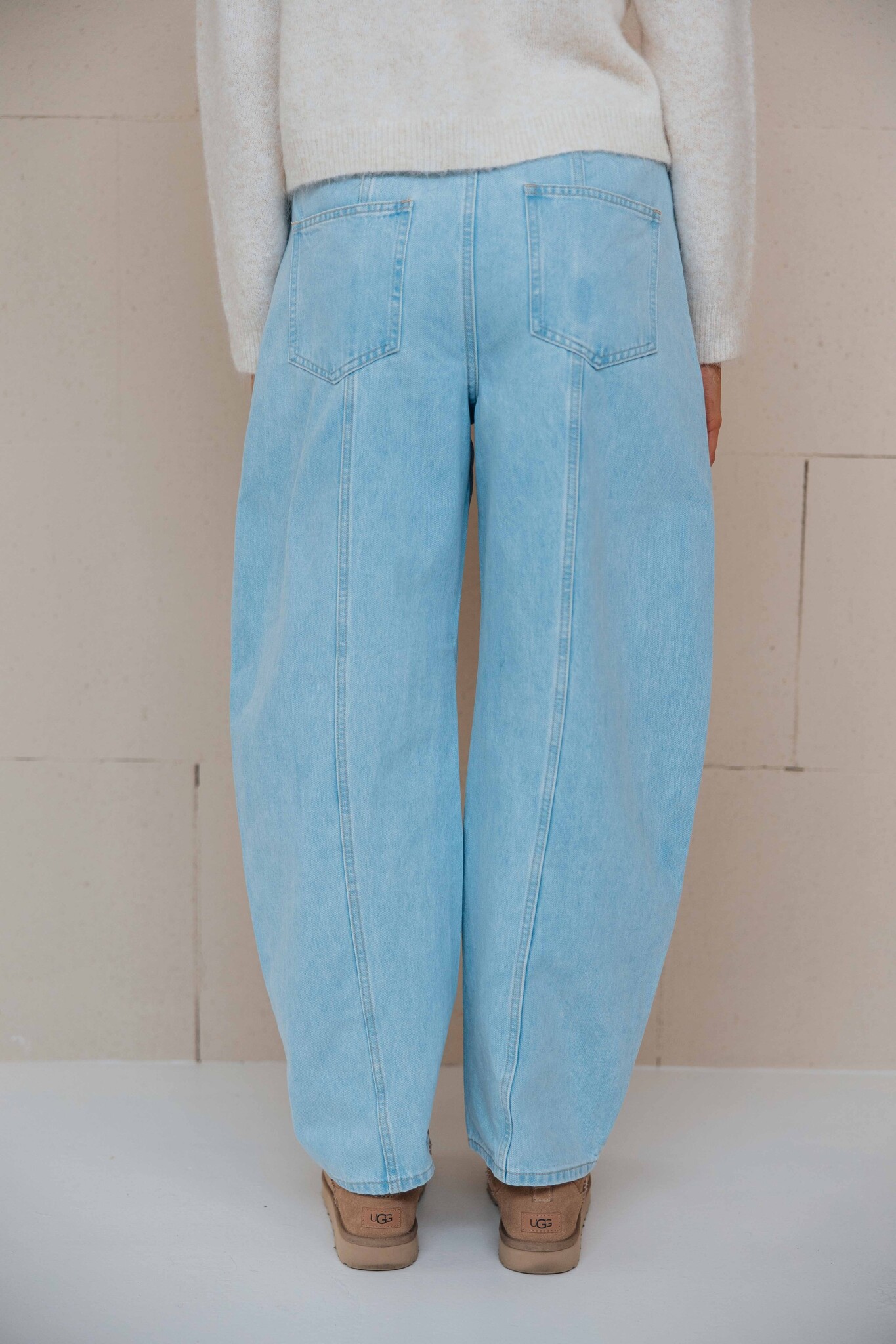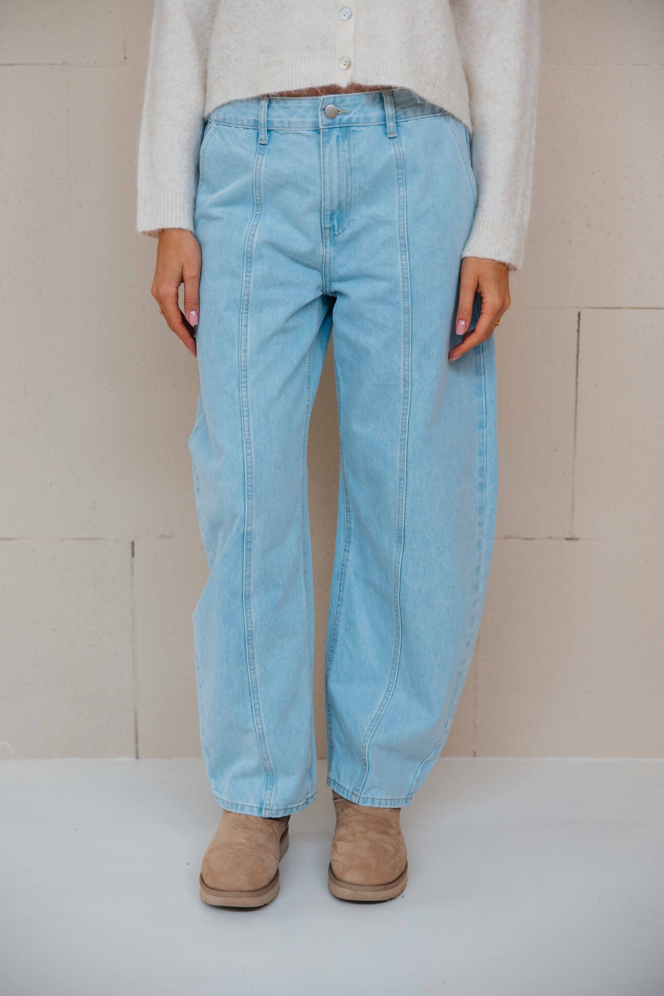 Deze jeans heeft een lichte wassing, een trendy balloon fit en een naad detail aan de voorkant. Perfect om te combineren met een cozy knit!