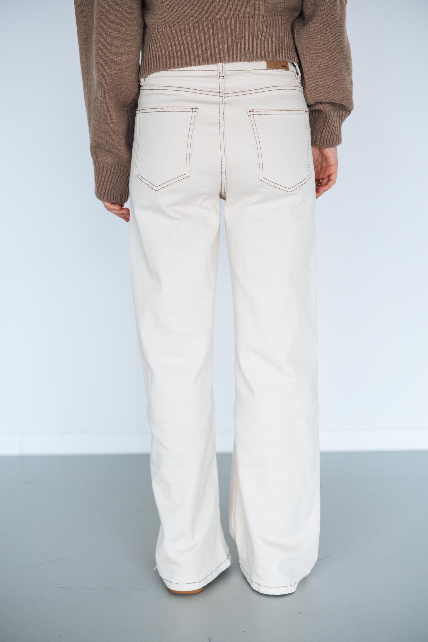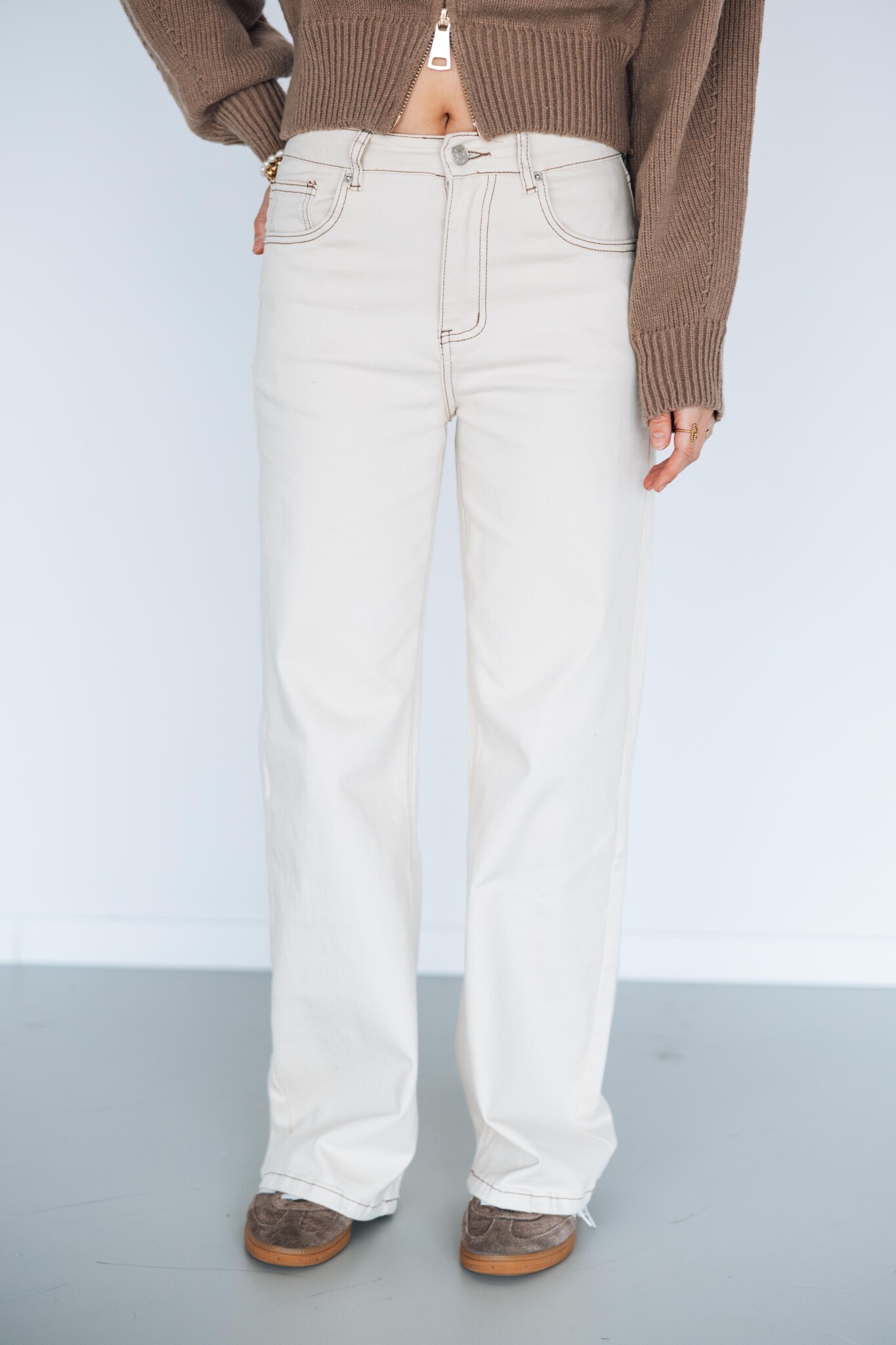 Deze beige straight leg jeans met bruine naad-details is een must-have voor je dagelijkse look! De jeans heeft een hoge taille met een knoop- en ritssluiting, steekzakken en riemlusjes.