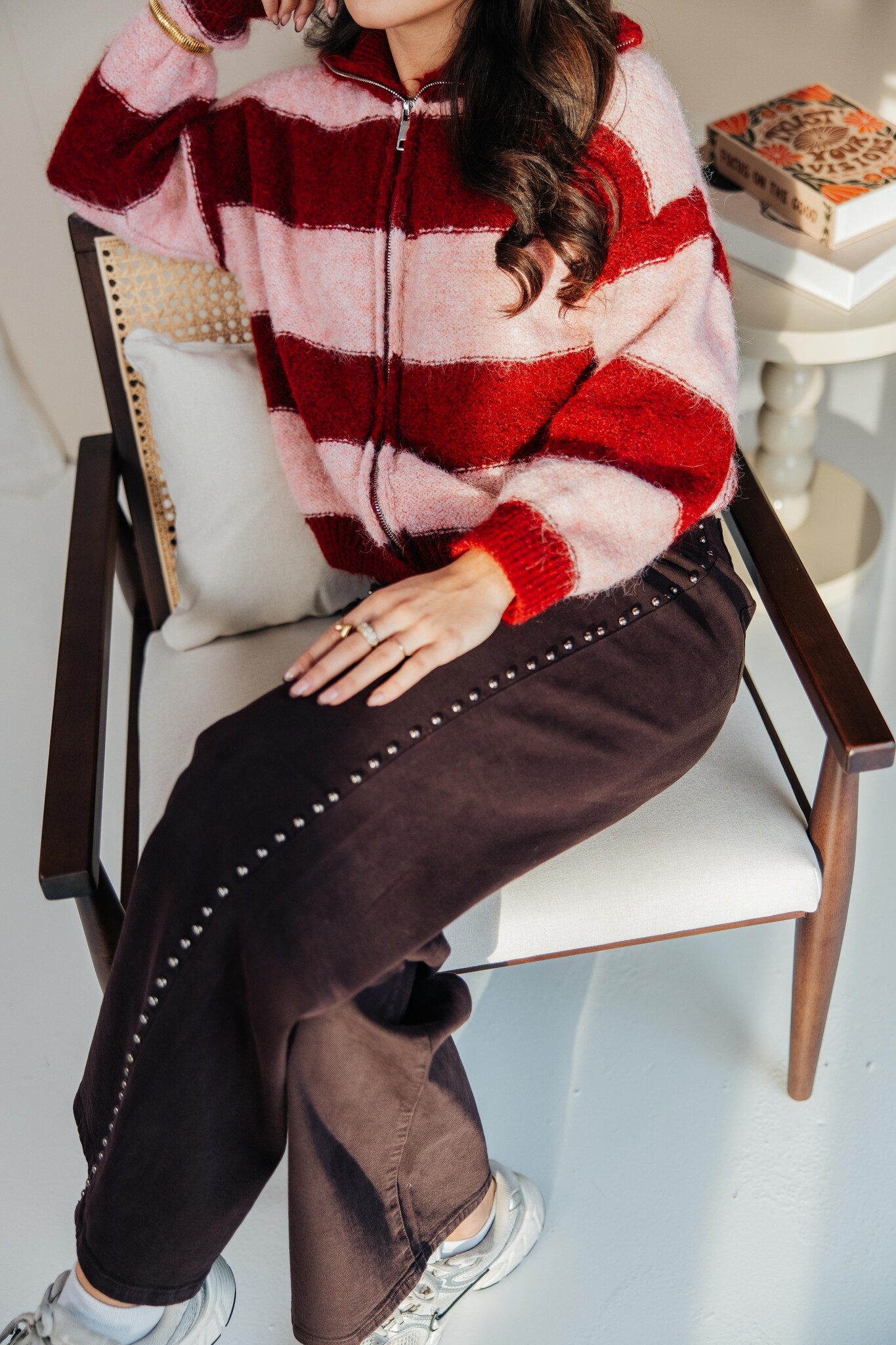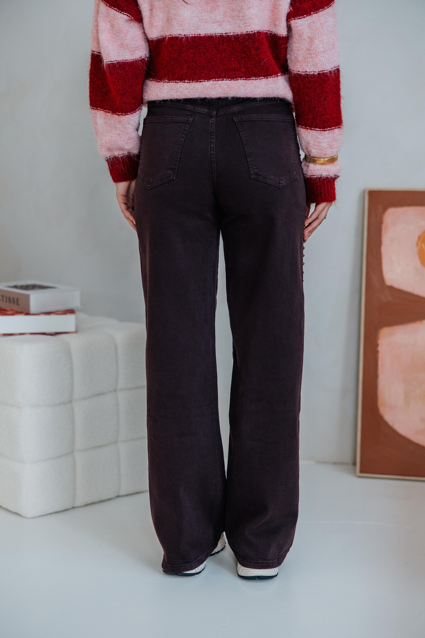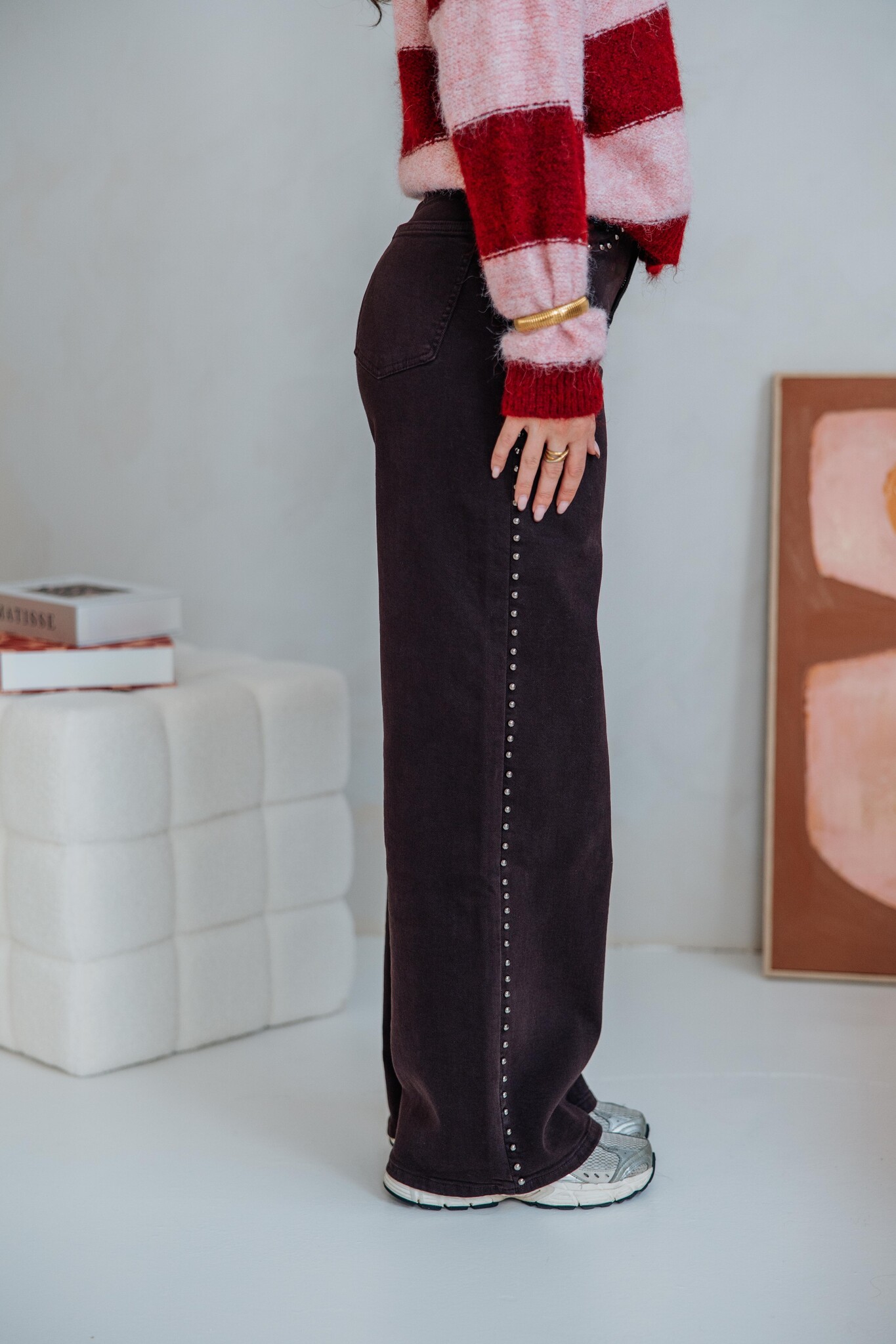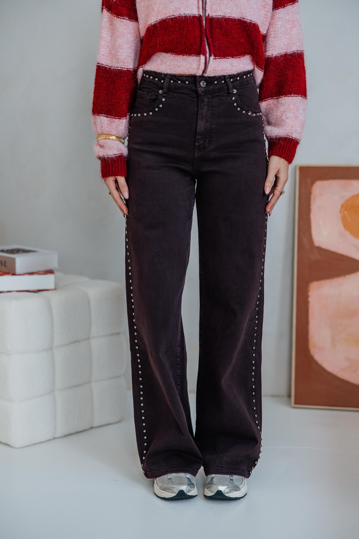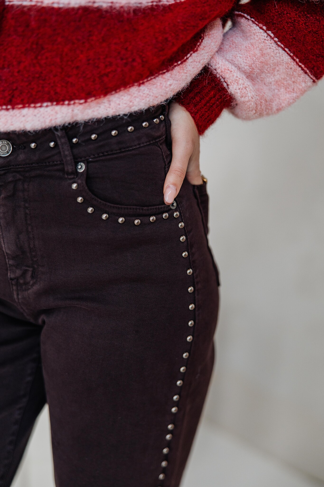 Deze straight leg jeans in een mooie bruintint is afgewerkt met zilveren stud details voor een trendy touch. Perfect voor een everyday look!