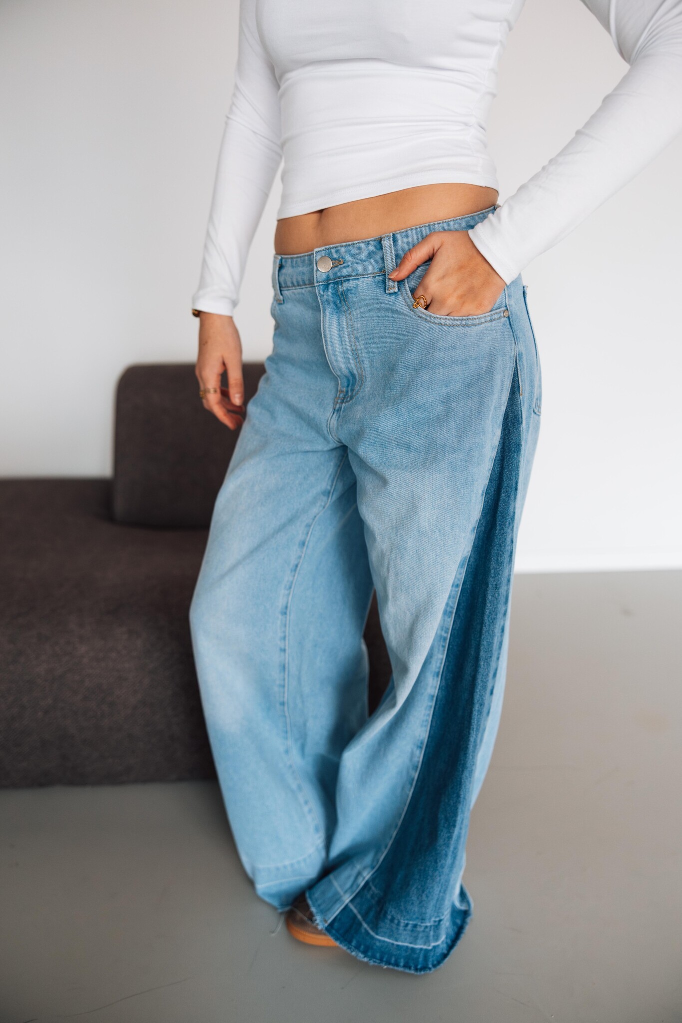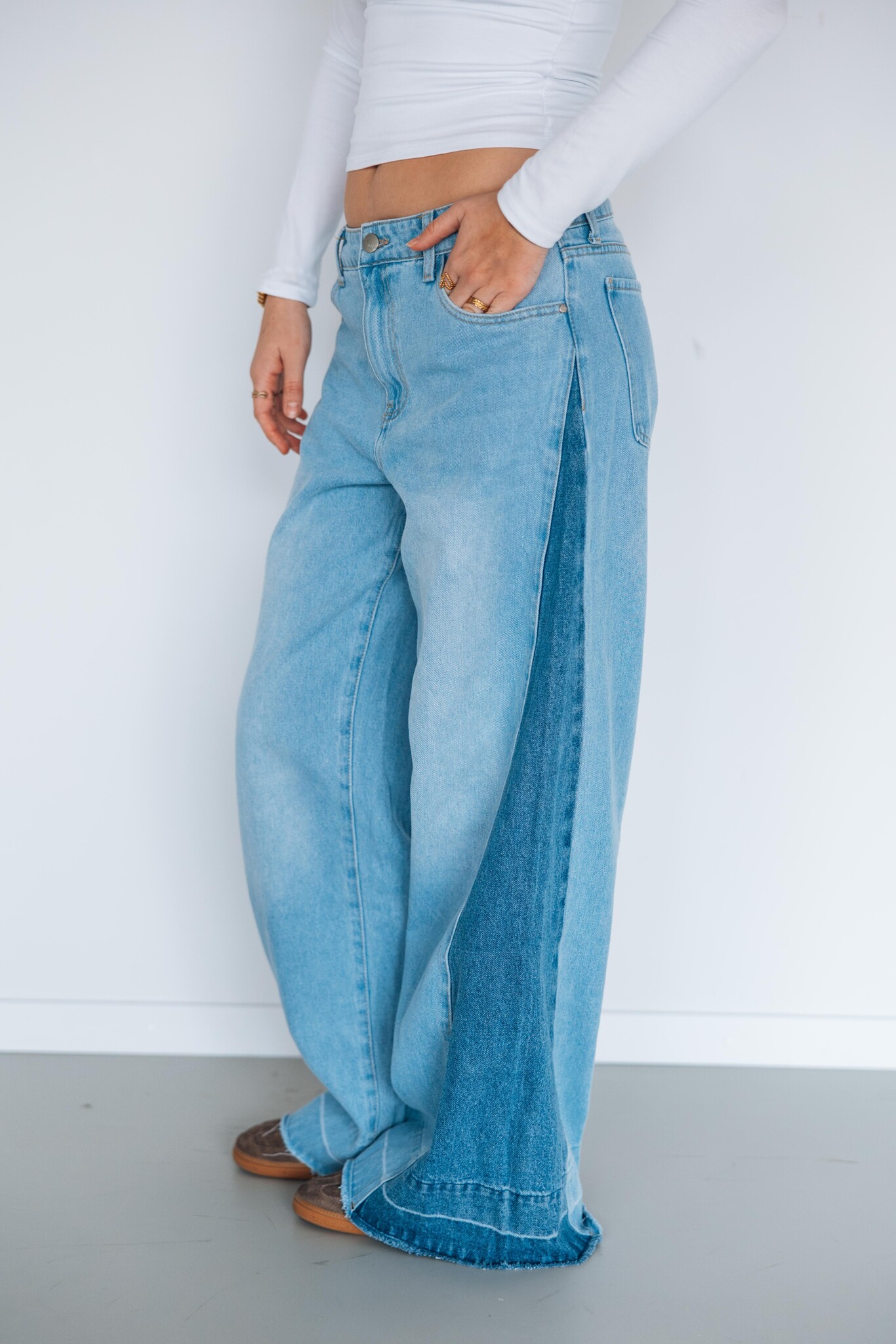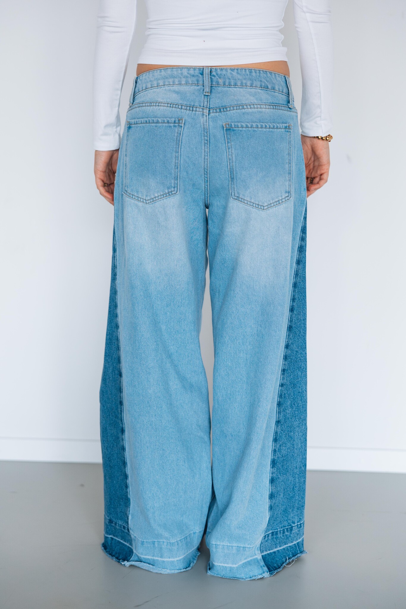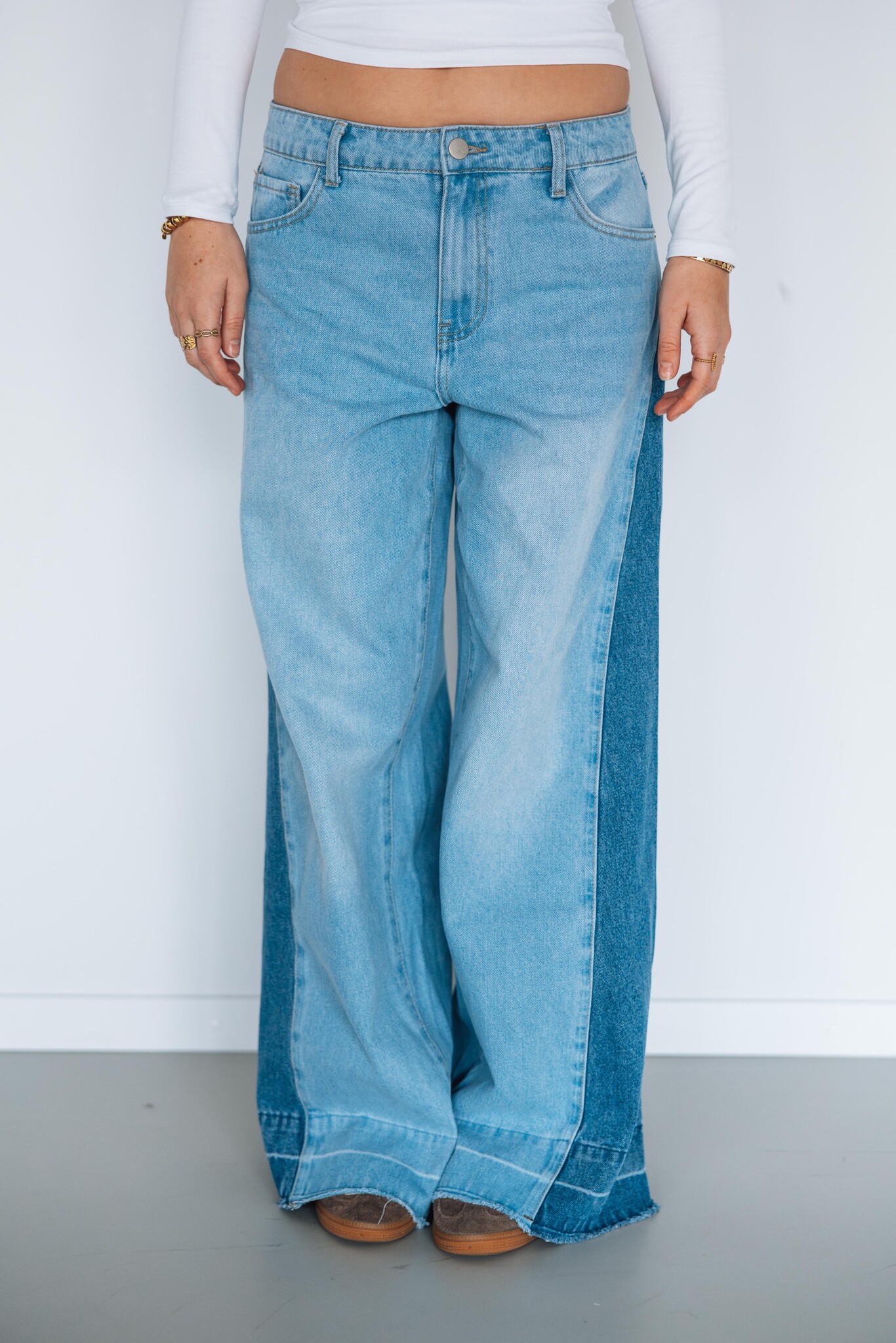 Deze jeans is een echte eyecatcher door de twee verschillende wassingen! Deze jeans heeft een wide leg fit en bevat weinig stretch.