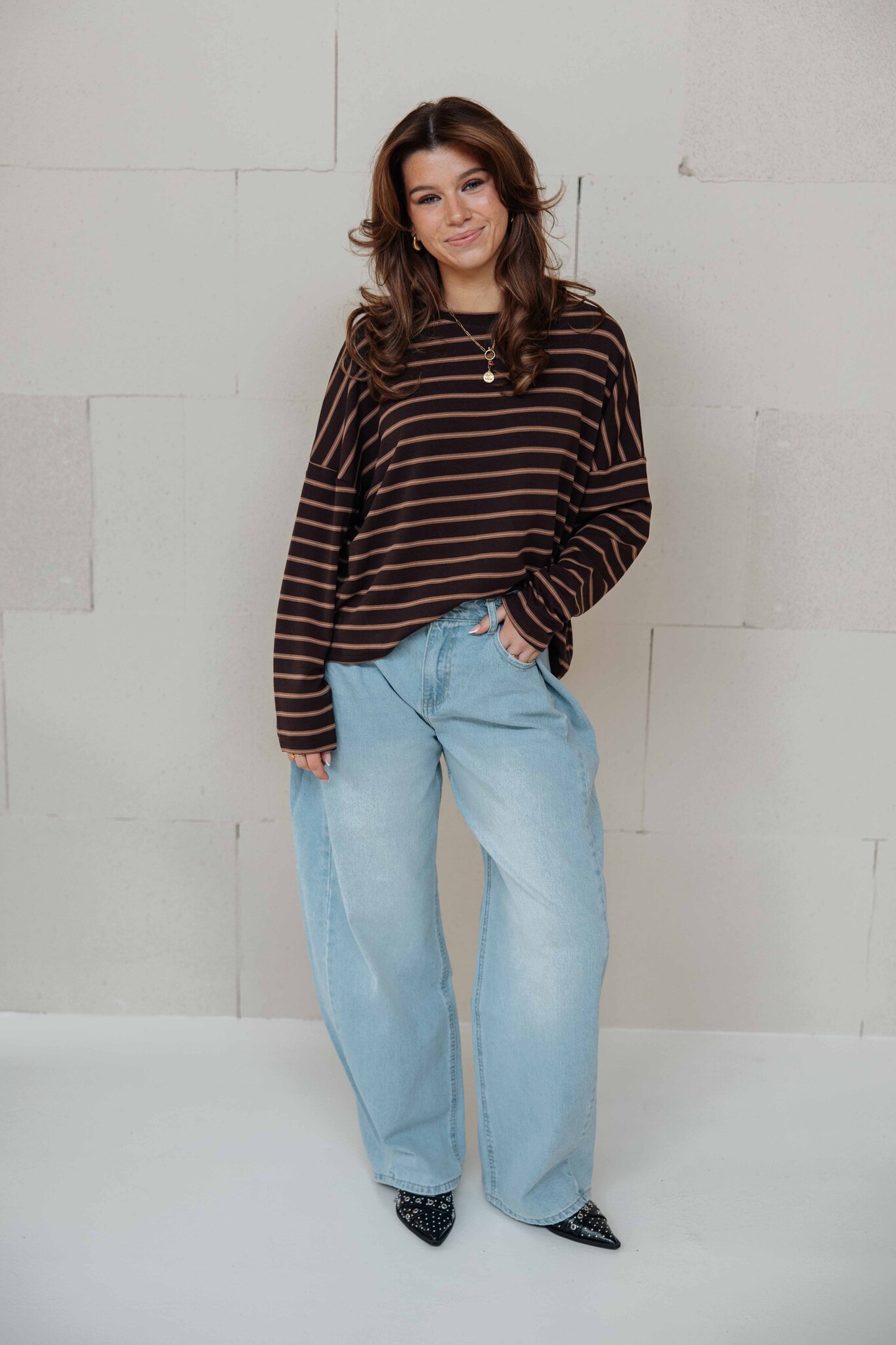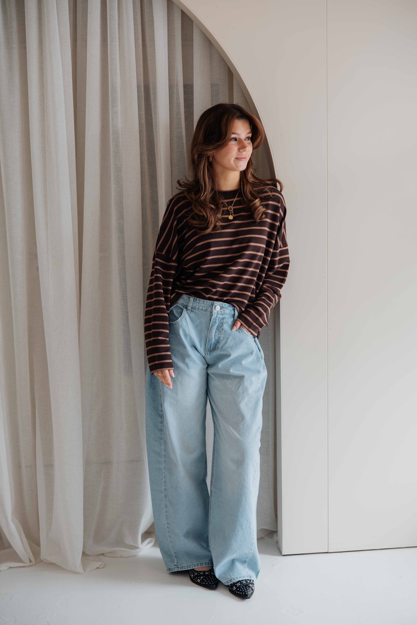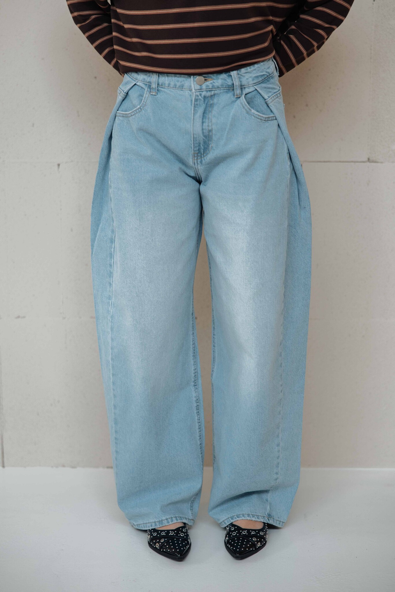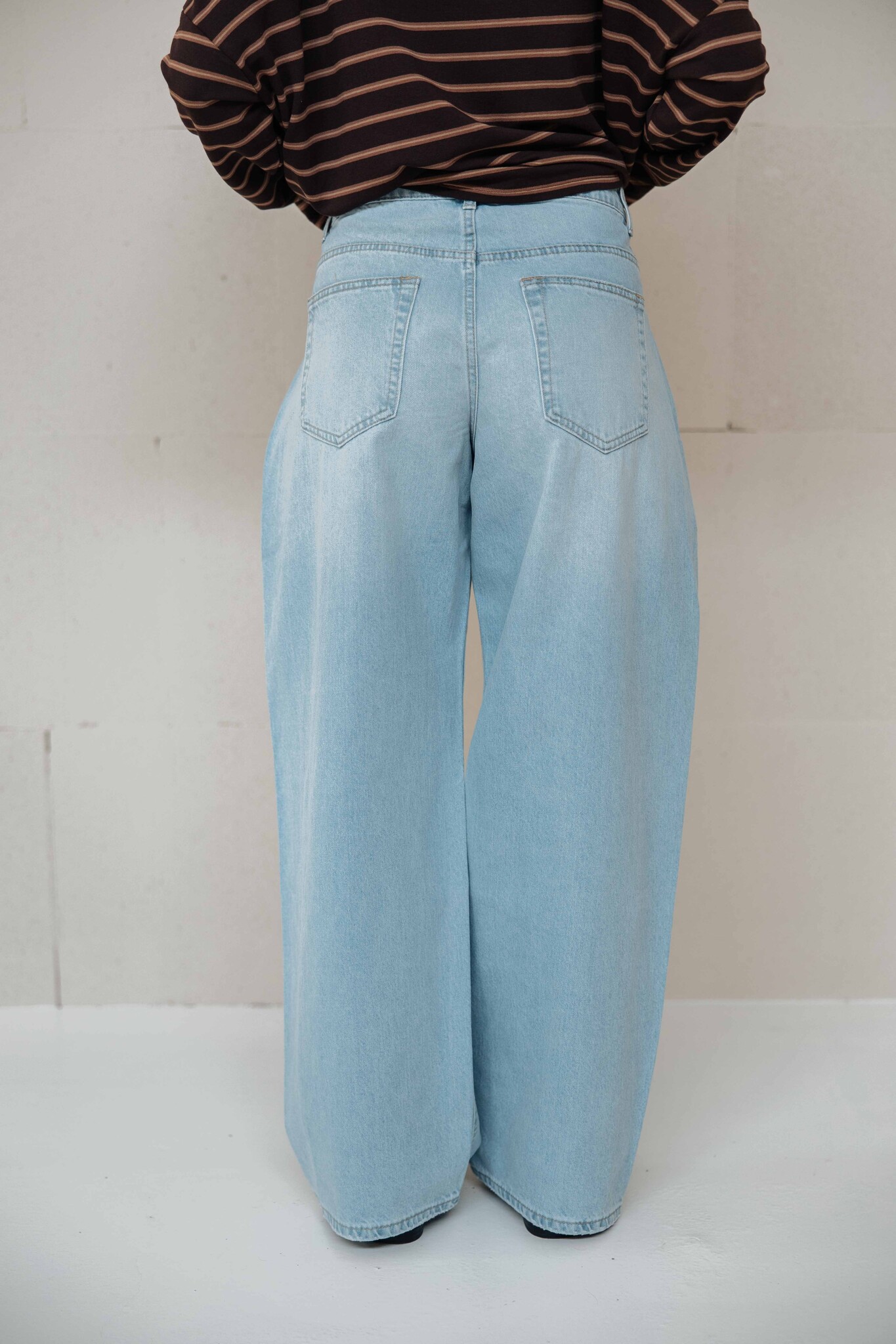 Deze jeans heeft een wide leg pasvorm en een mooie denim wassing. De plooidetails aan de zijkanten geven de broek een trendy en unieke uitstraling!