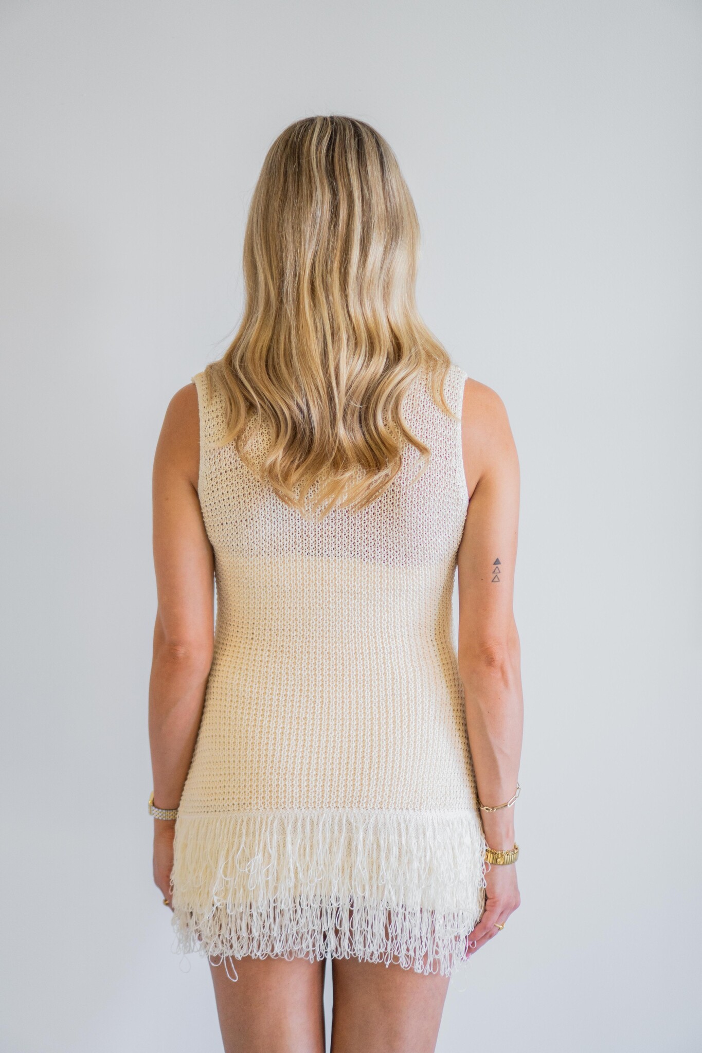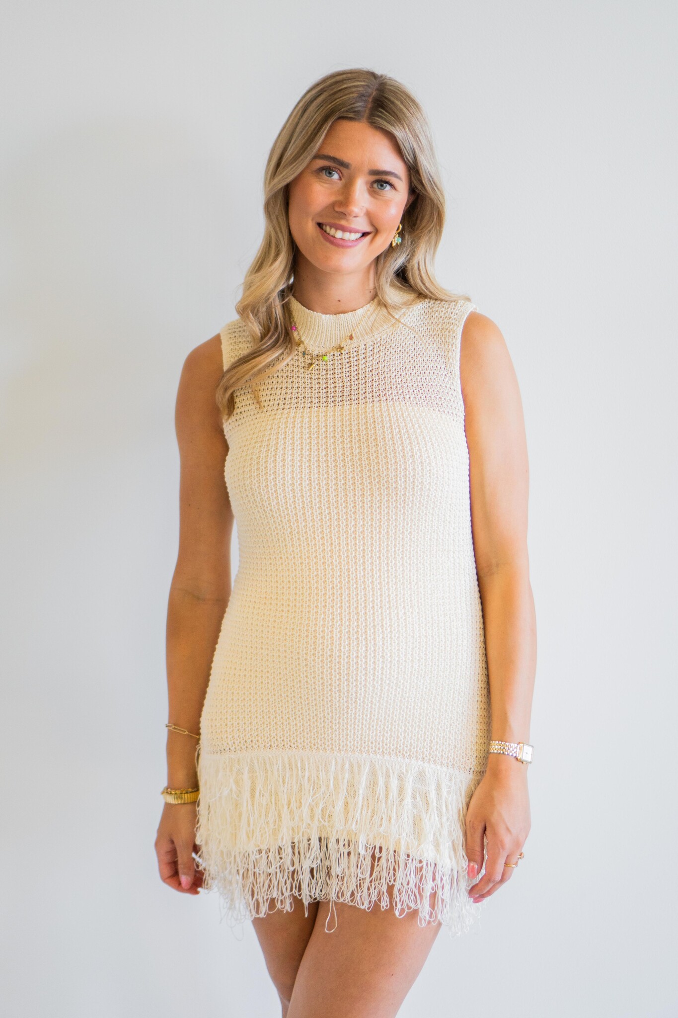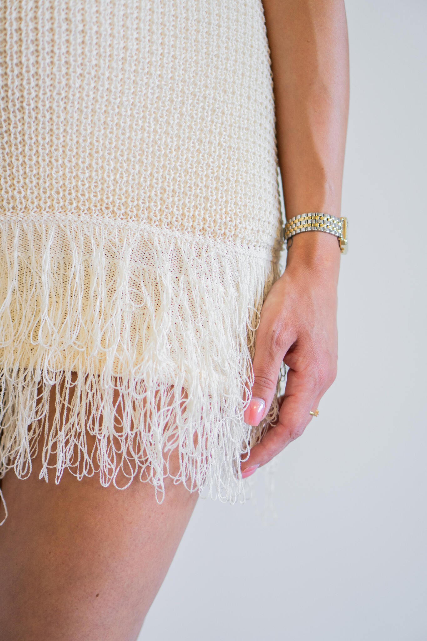 Deze prachtige Ibiza style jurk heeft ruffle details aan de onderkant en komt in een knitted see-through stof. Daphne draagt een onderjurk op de foto.