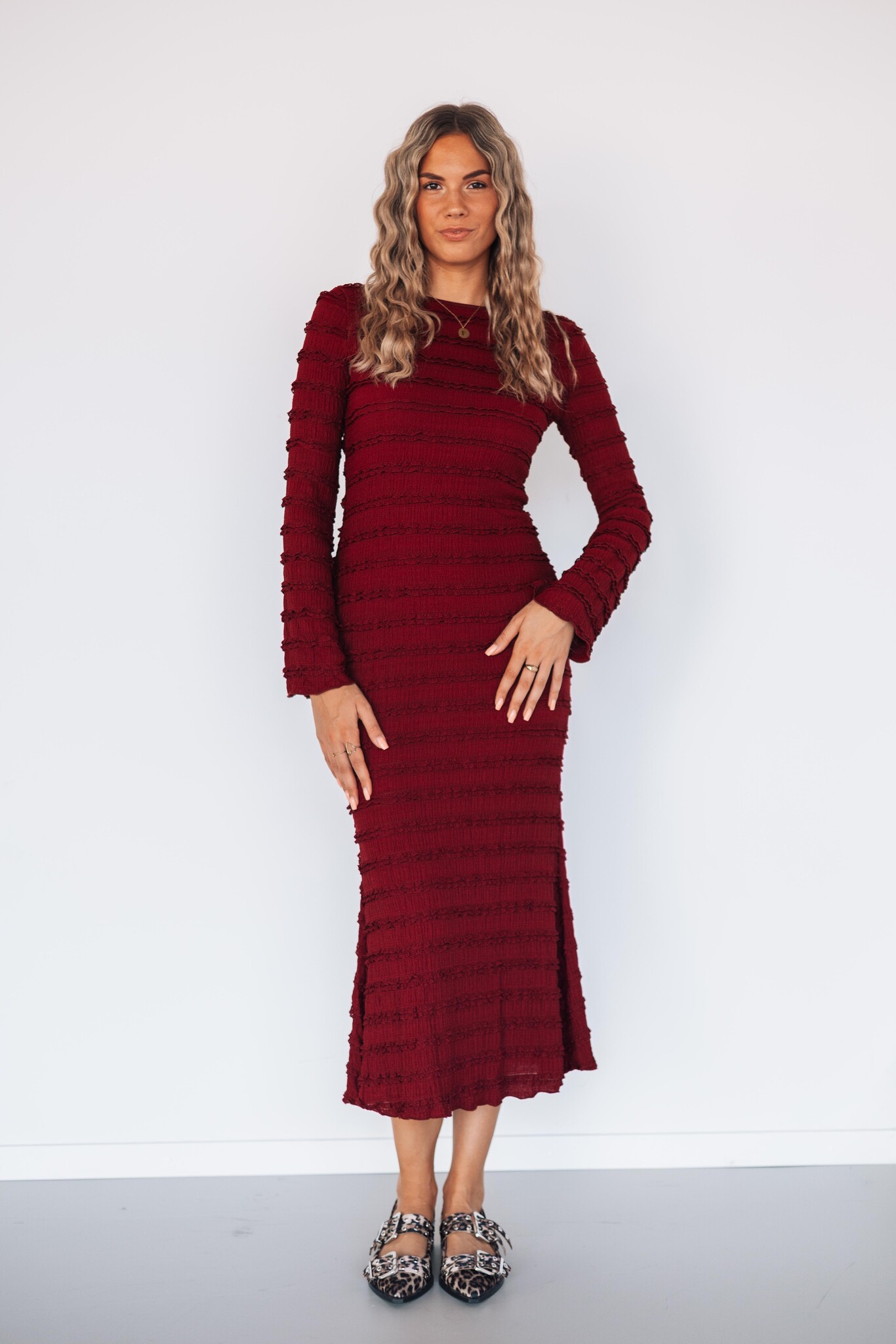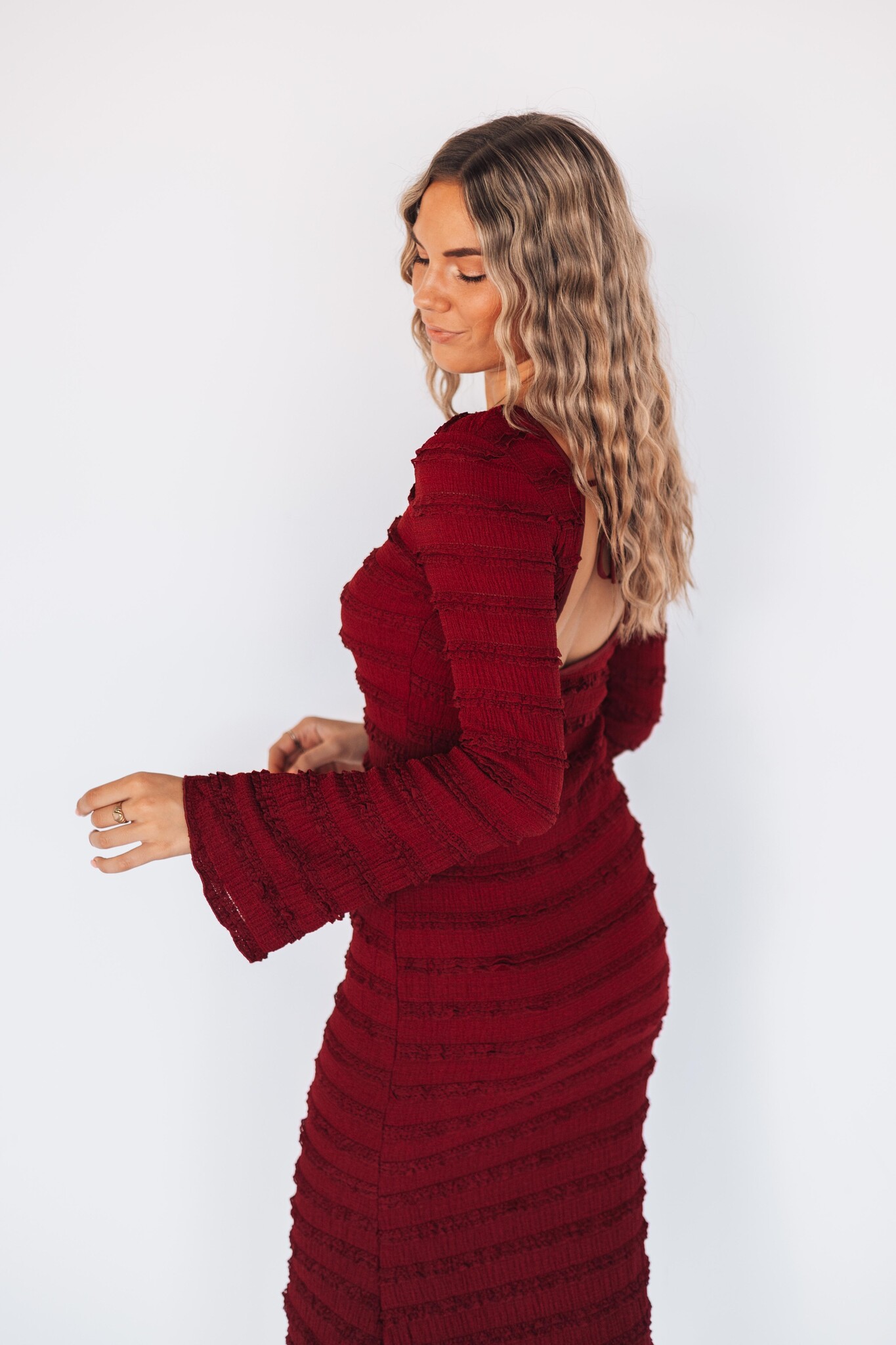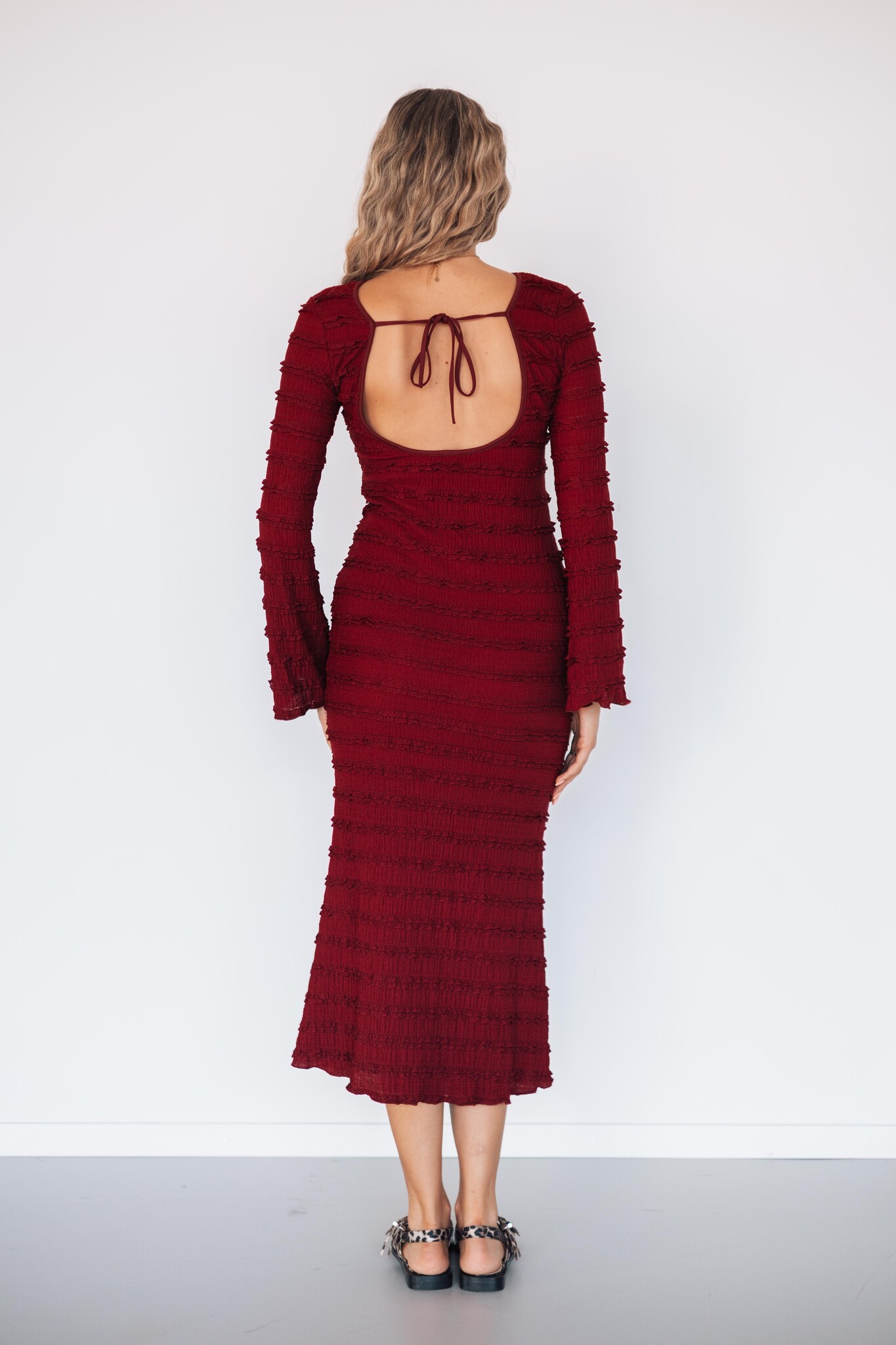 Deze jurk is comfy en stylish tegelijk! Deze jurk heeft een all-over ruffle patroon, lange uitlopende mouwen en een open rug voor een extra touch.