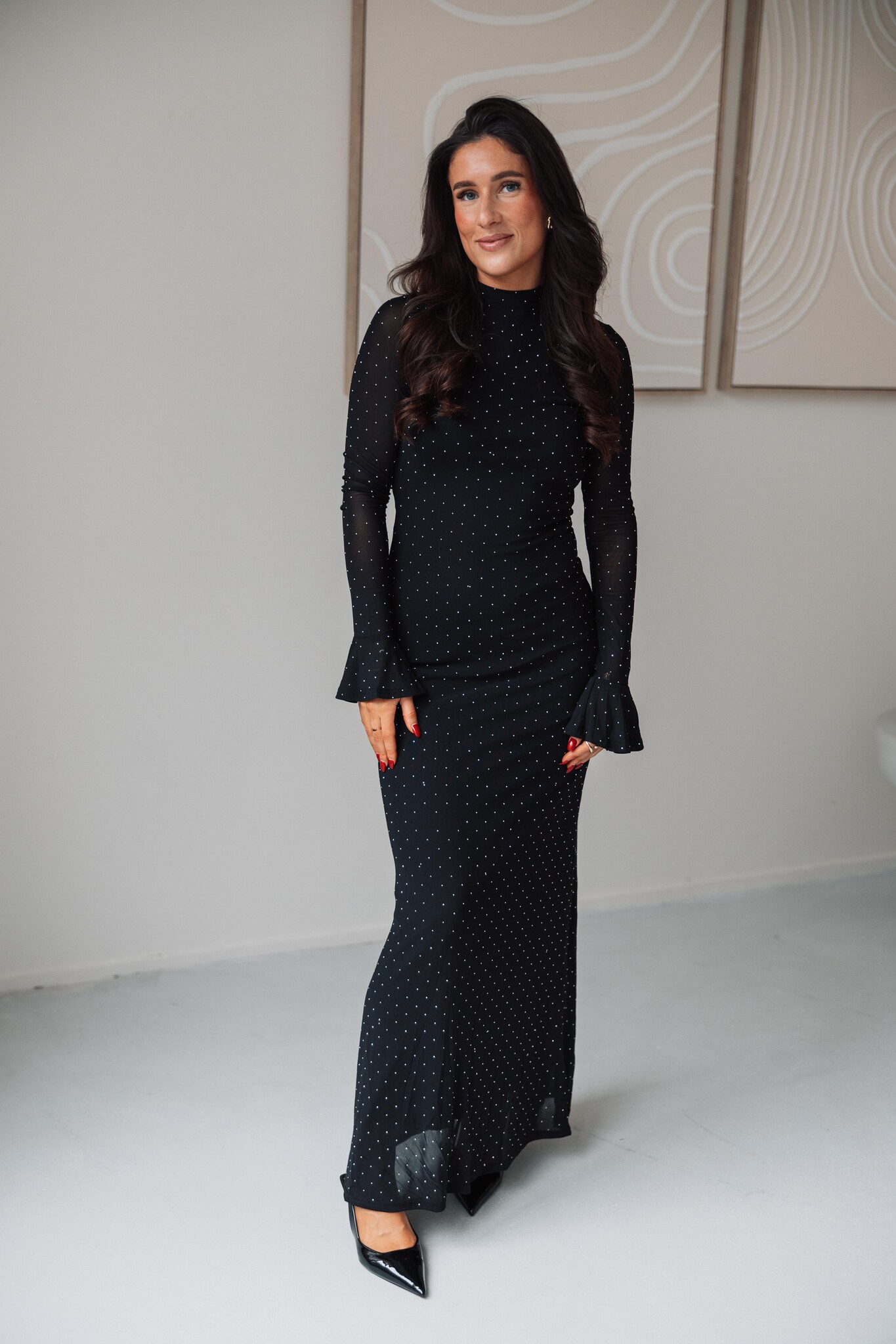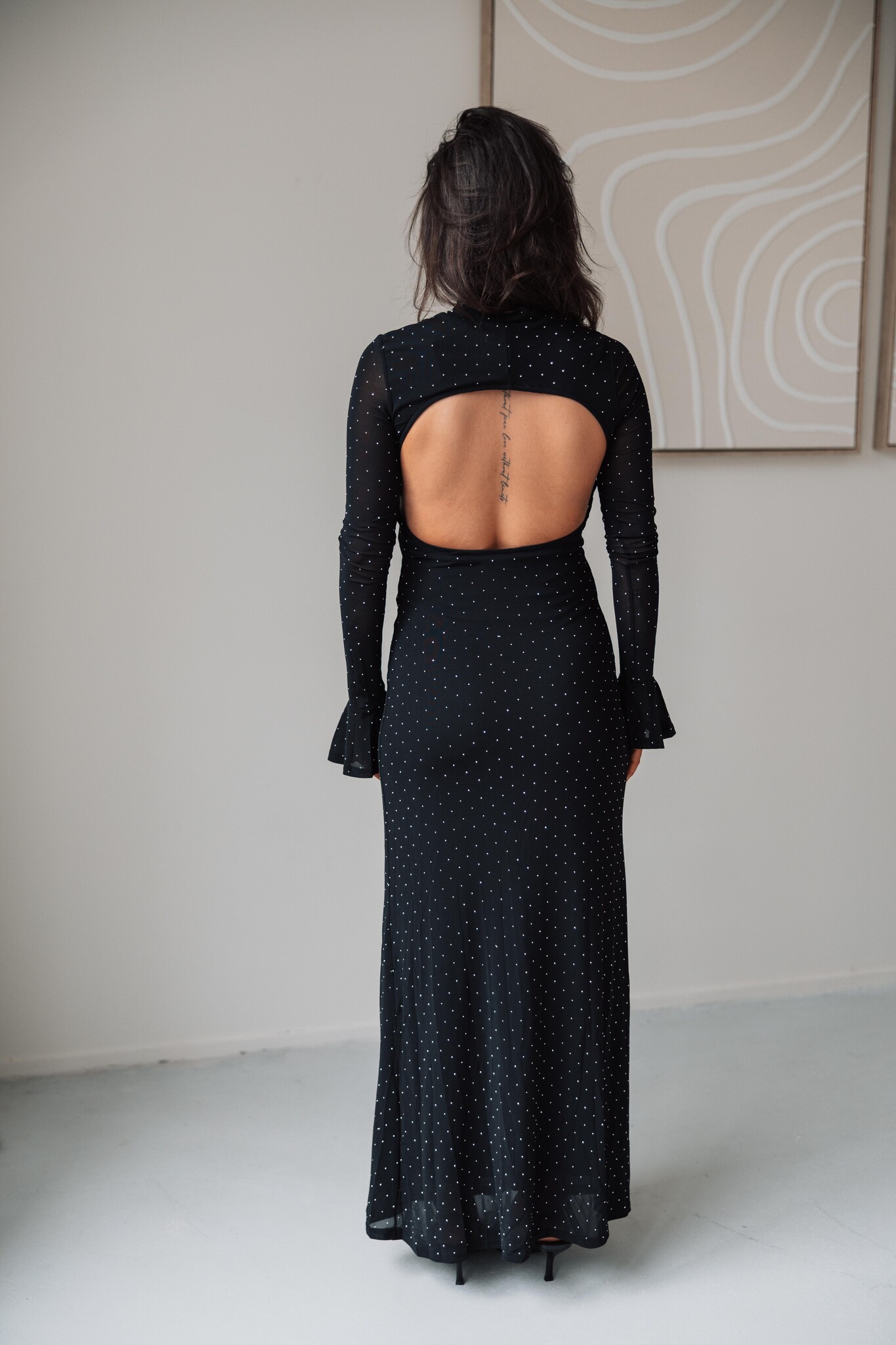 Deze lange jurk heeft lange mouwen, een elegante, chique uitstraling met sprankelende steentjes en een stijlvolle open rug. Perfect voor een glamoureuze party look.