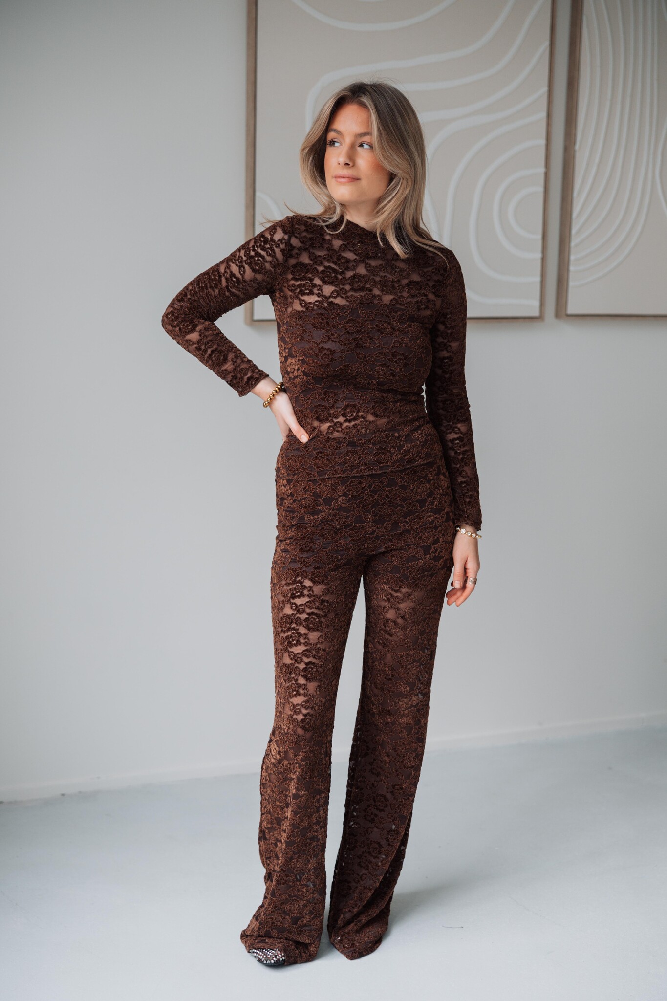 Deze kanten top met lange mouwen is gemaakt van een fijne, zachte stof en heeft een chique uitstraling. Combineer met de bijpassende broek voor de complete look!