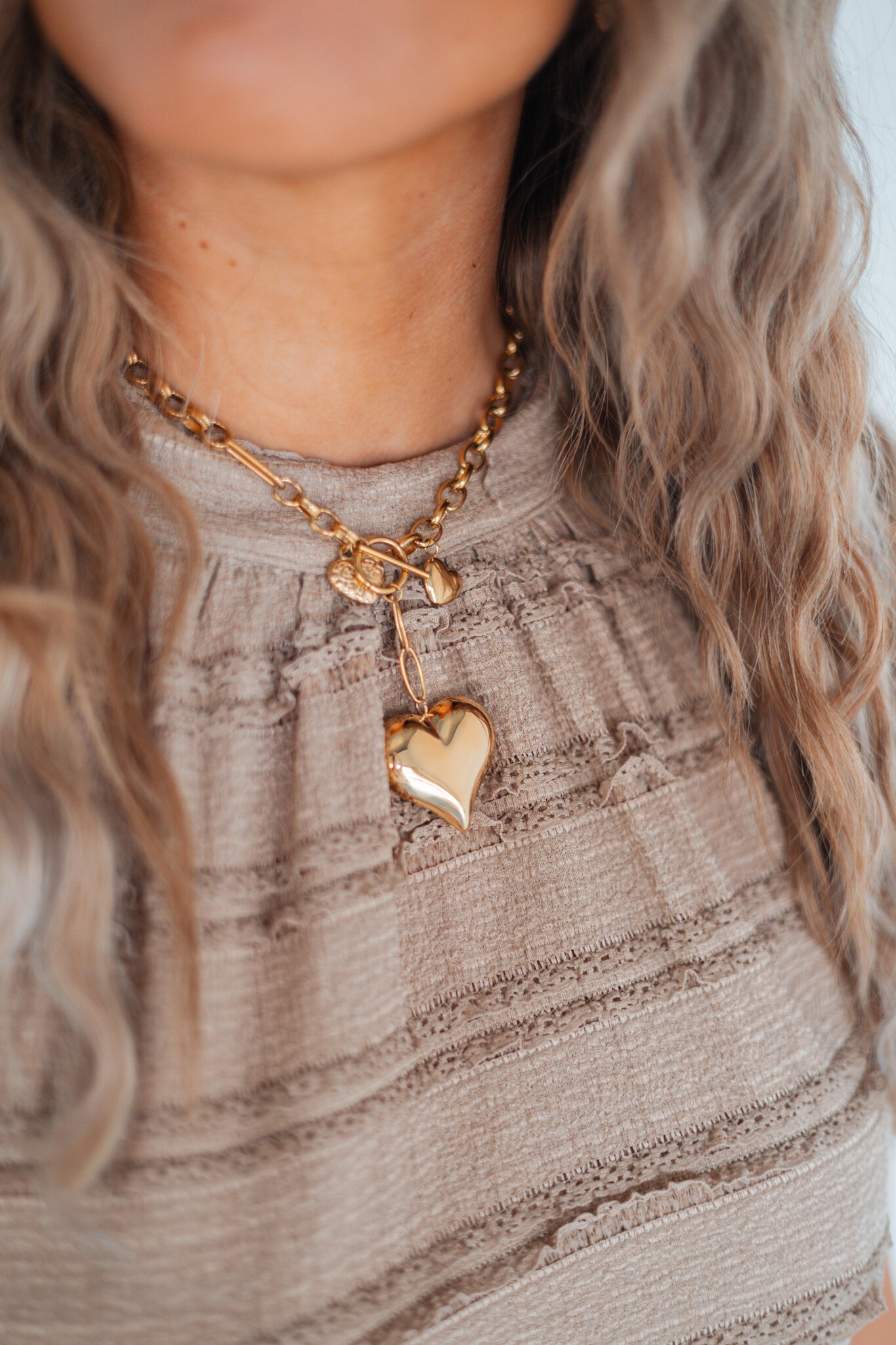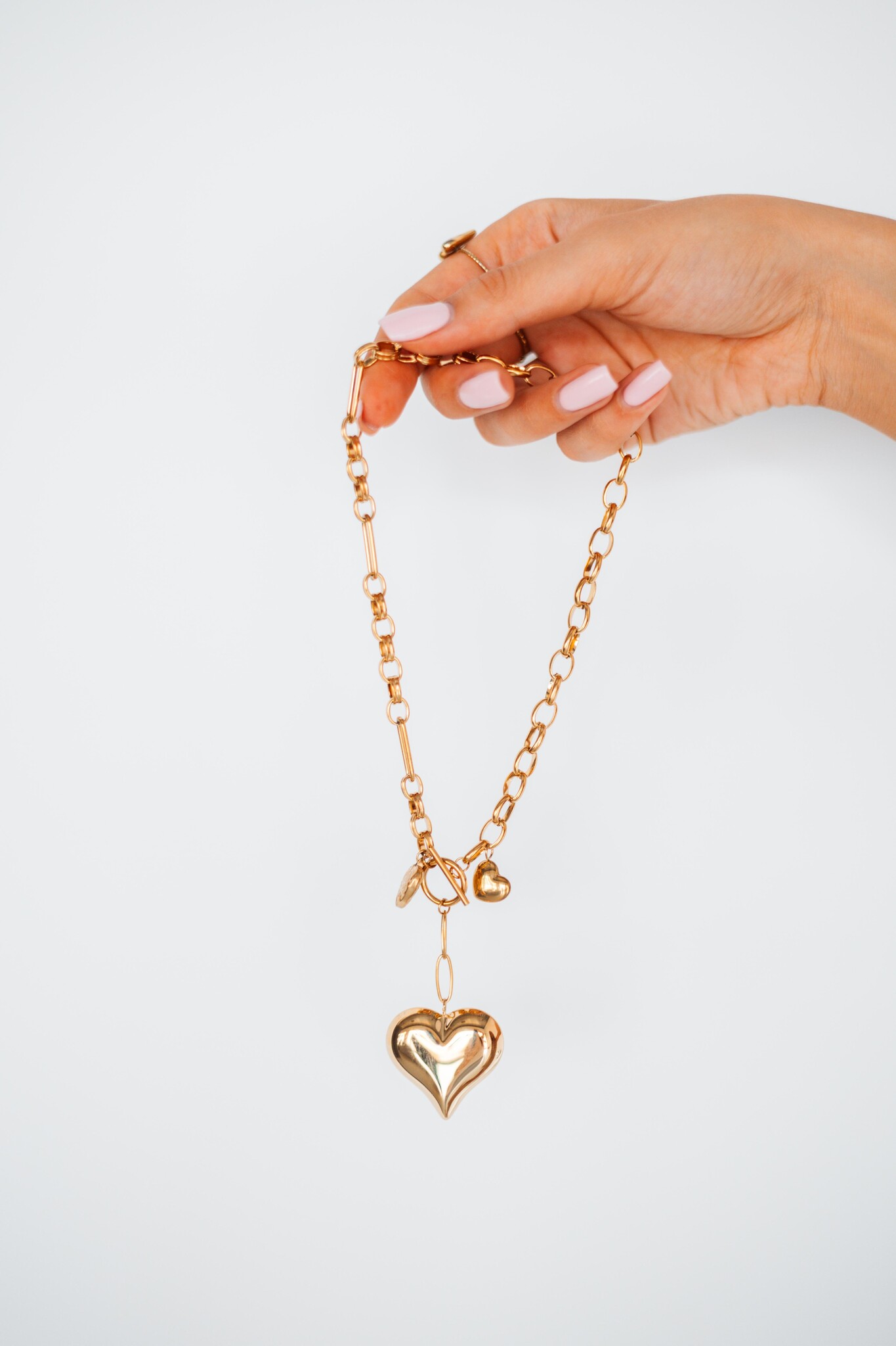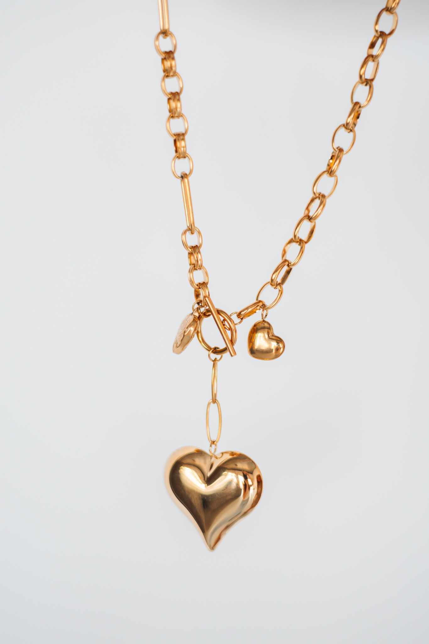 Gouden schakel-ketting met een groot hart en kleine hartjes bedels.