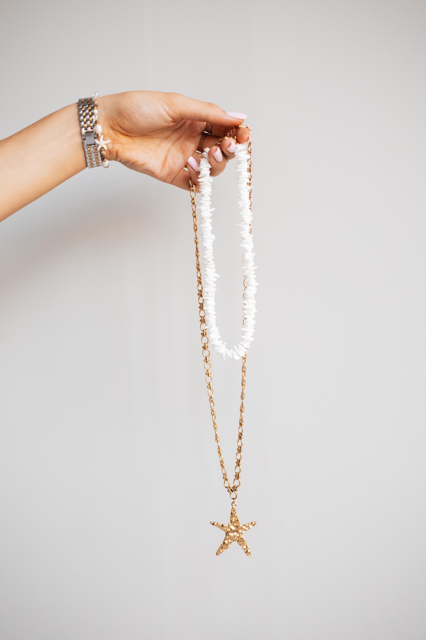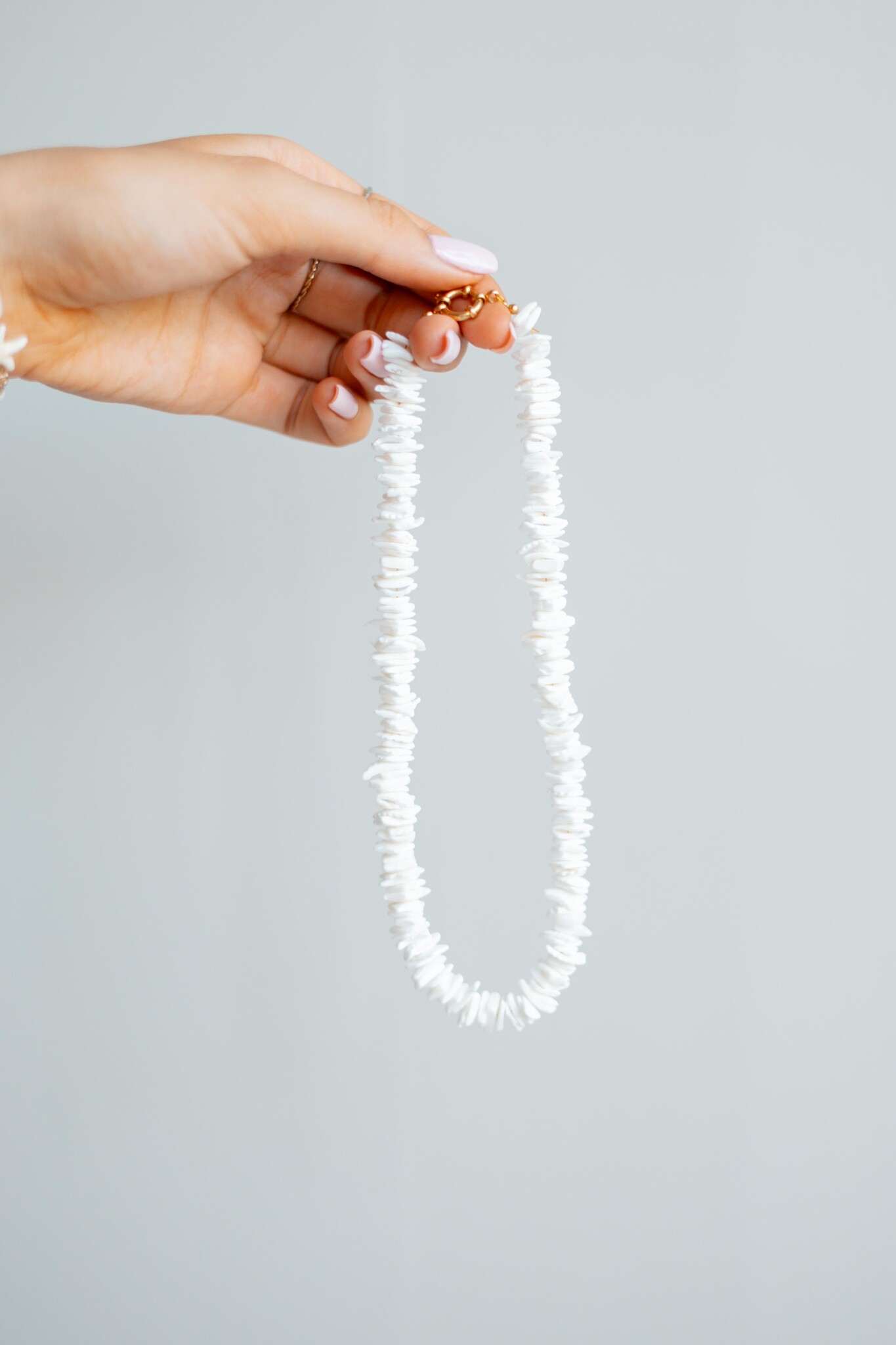 Witte schelpenketting. Leuk om te layeren met een andere ketting.