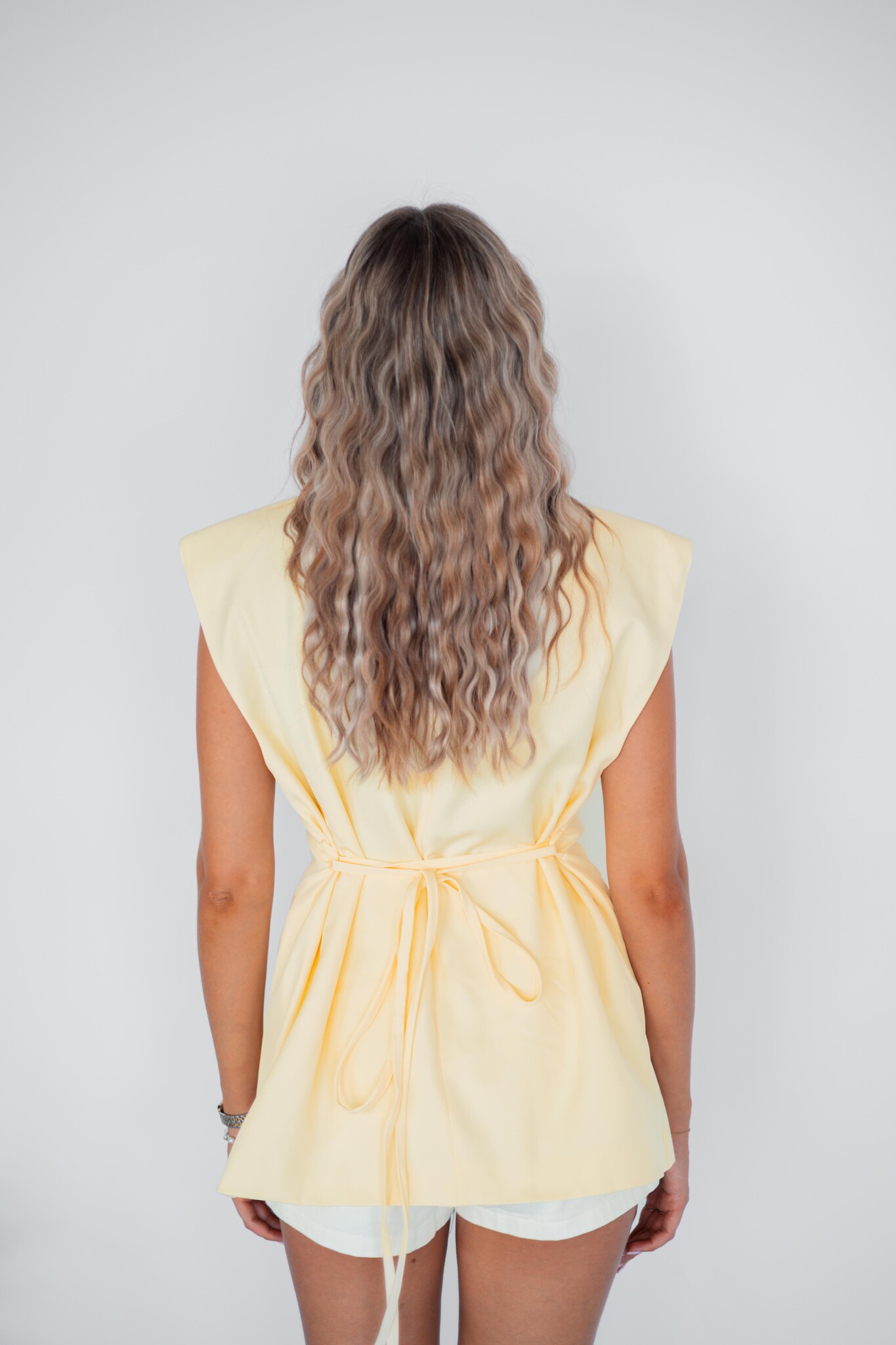 Dit gilet heeft een kraag, een knoopsluiting, schoudervulling en een ceintuur welke je aan de voor- of achterkant kunt tailleren.