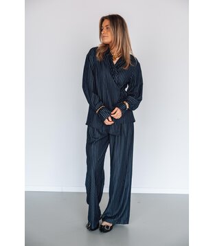 Deze blouse heeft een gestreept patroon, lange mouwen en een V-hals met een verfijnd kraagje. Het strikdetail in het midden zorgt voor een subtiele taillering en een vrouwelijke touch. Combineer het met de bijpassende pantalon voor een complete co-ord loo
