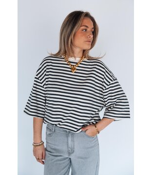Dit t-shirt heeft een oversized fit, 3-kwart mouwen en een gestreept patroon wat zorgt voor een nonchalante, trendy uitstraling. Perfect voor een everyday-look!