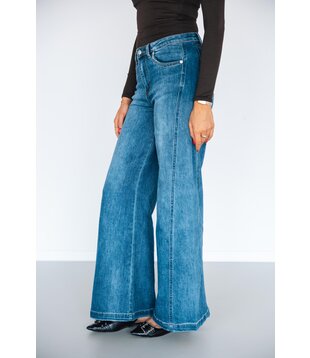 Deze wide leg jeans met dark denim wassing is een must-have voor je dagelijkse look! De jeans heeft een hoge taille met een knoop- en ritssluiting, steekzakken en riemlusjes.