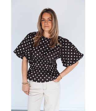 Deze top heeft een speels polkadot patroon en een flatterend peplum model met pofmouwen. Dankzij de elastische band in de taille ontstaat een mooie, vrouwelijke pasvorm.