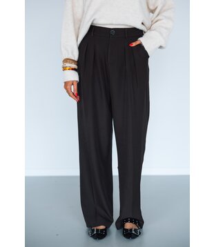 Deze pantalon heeft een loszittend model met stijlvolle plooien aan de bovenkant, een knoopsluiting, steekzakken en een comfortabele elastische band aan de achterkant.