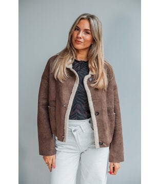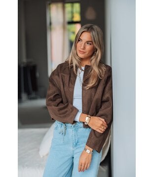 Dit suède look jasje komt in een mooie bruine kleur, heeft een ballon fit en een rits in het midden. Het perfecte jasje voor de herfst, stijlvol en makkelijk te combineren.