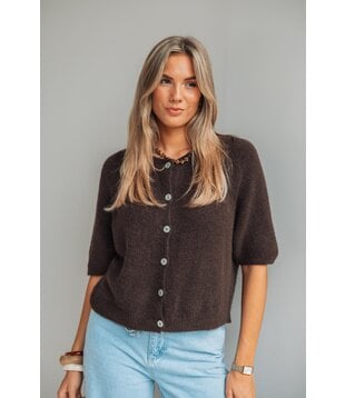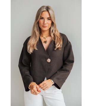 Dit vest is gemaakt van een dikkere stof en afgewerkt met een chique gouden knoopdetail. De mooie donkerbruine kleur is dé trend van dit moment, een musthave voor dit seizoen.