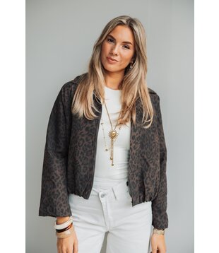 Dit jasje heeft een leopard print in mooie herfsttinten, een rits in het midden en is ook leuk te dragen als top. Een stijlvol statement piece dat perfect past bij het nieuwe seizoen.
