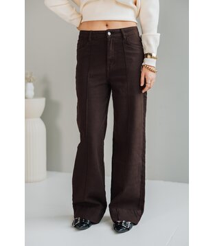 Deze wide leg jeans komt in een donkerbruine kleur en heeft een naad detail aan de voorkant van de broek. De perfecte jeans voor het najaar!