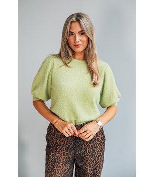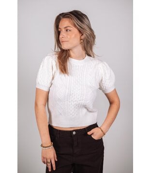 Deze top heeft een pof mouwtje, is gemaakt van een zacht stofje en heeft een leuk gevlochten patroon!